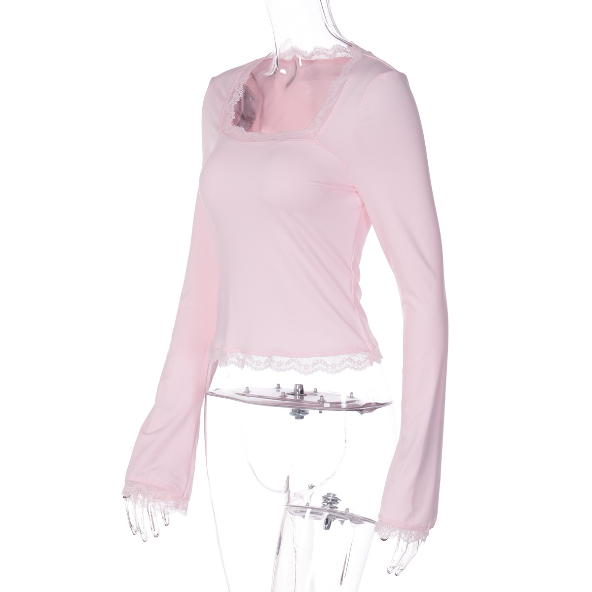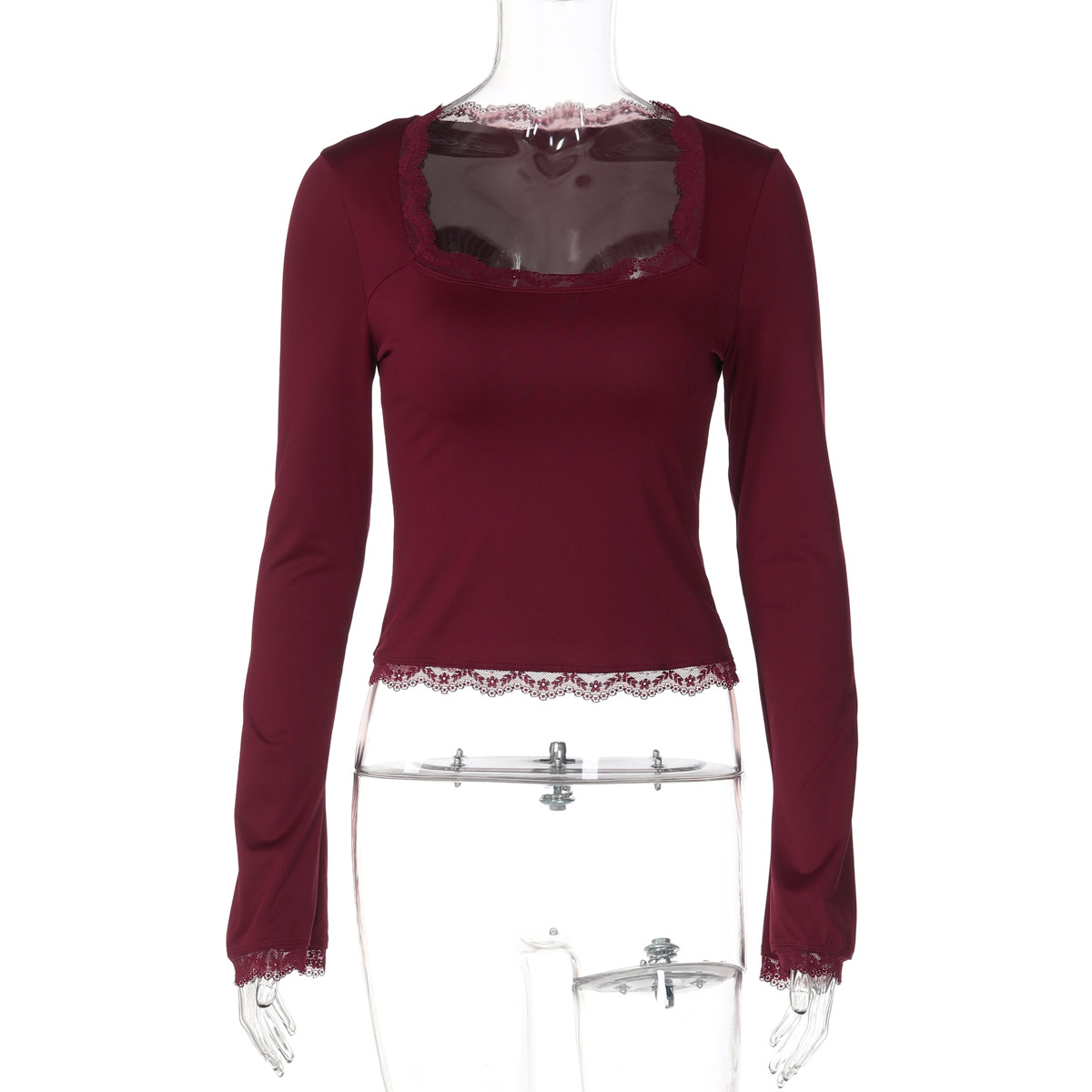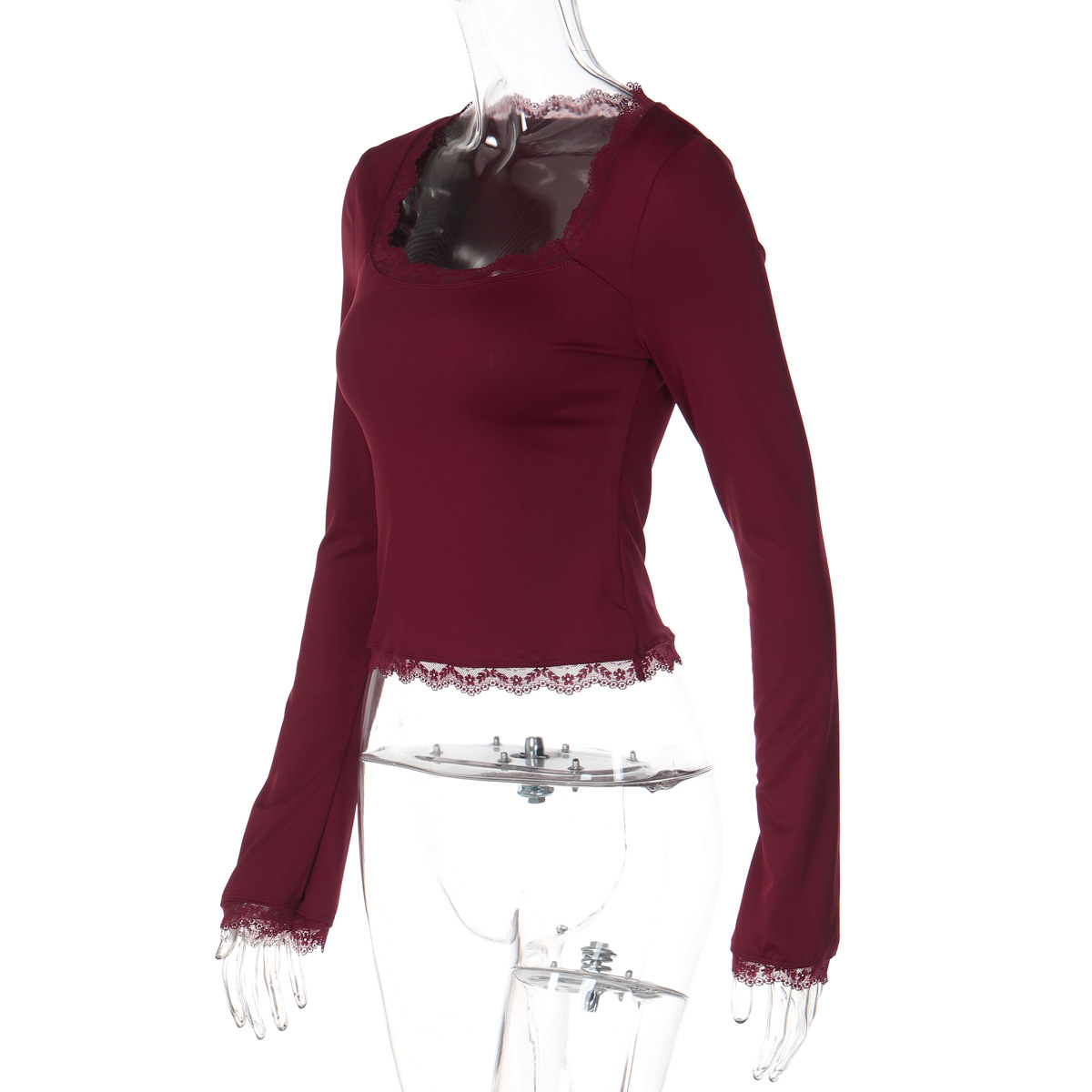亚马逊跨境欧美新款时尚蕾丝边方领长袖修身百搭女装上衣外贸批发