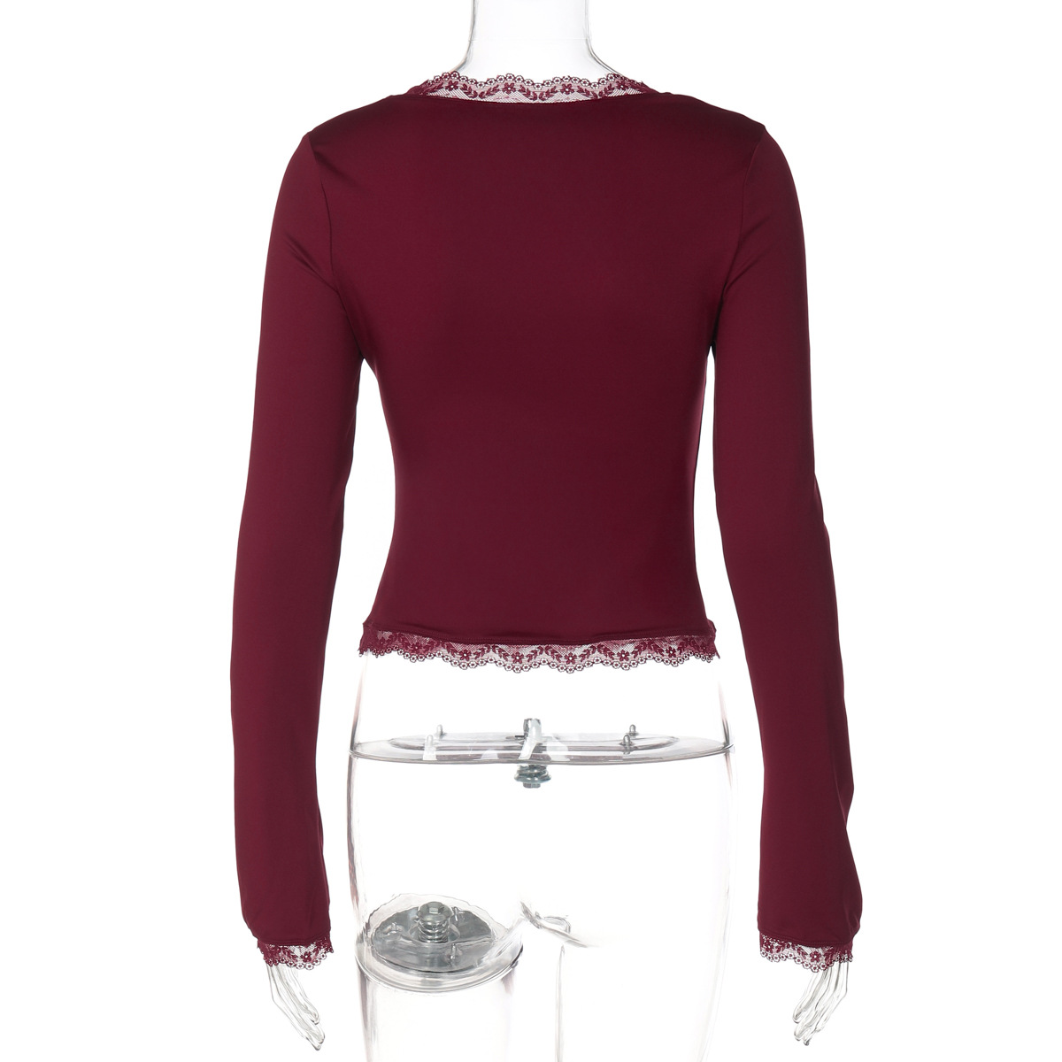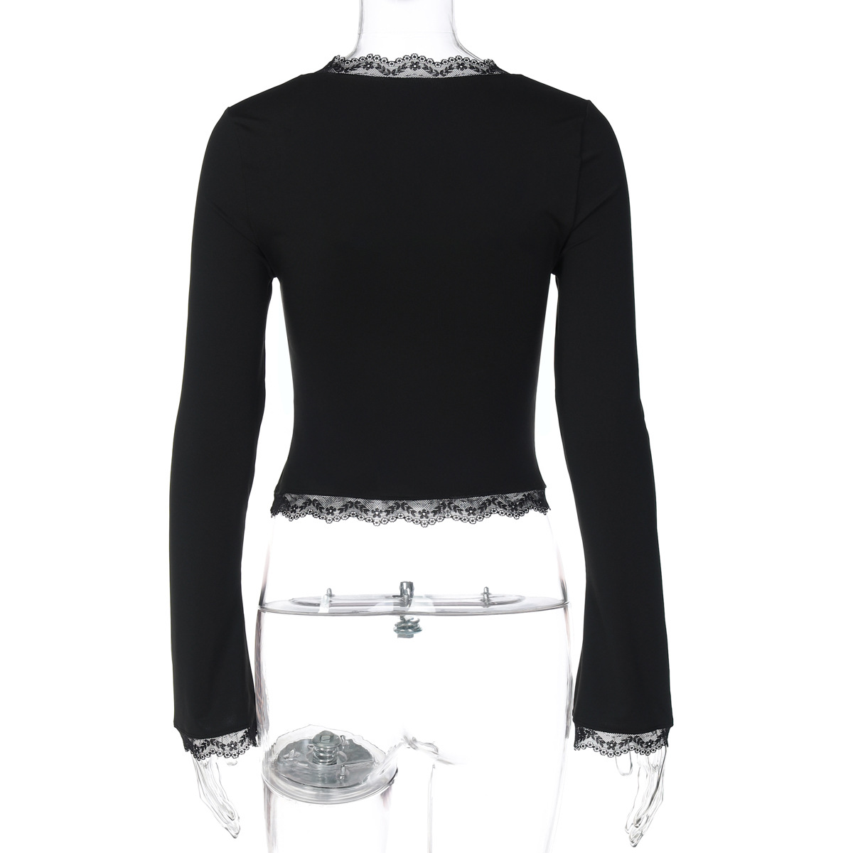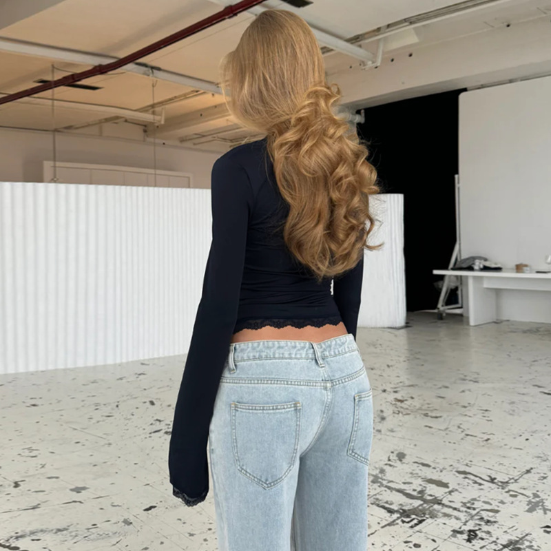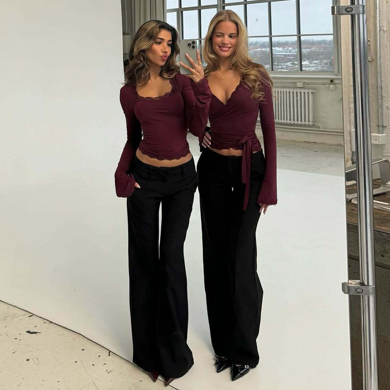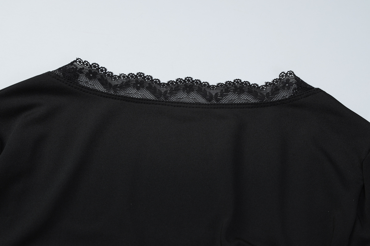 亚马逊跨境欧美新款时尚蕾丝边方领长袖修身百搭女装上衣外贸批发