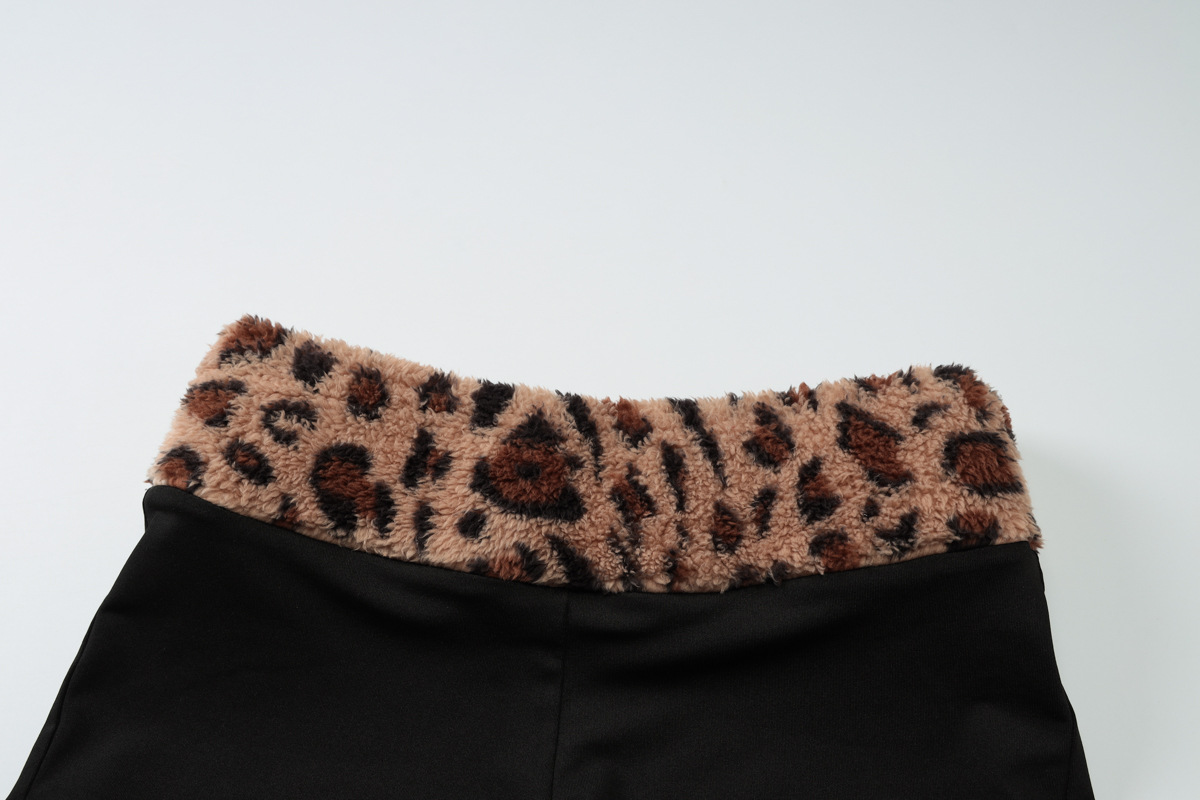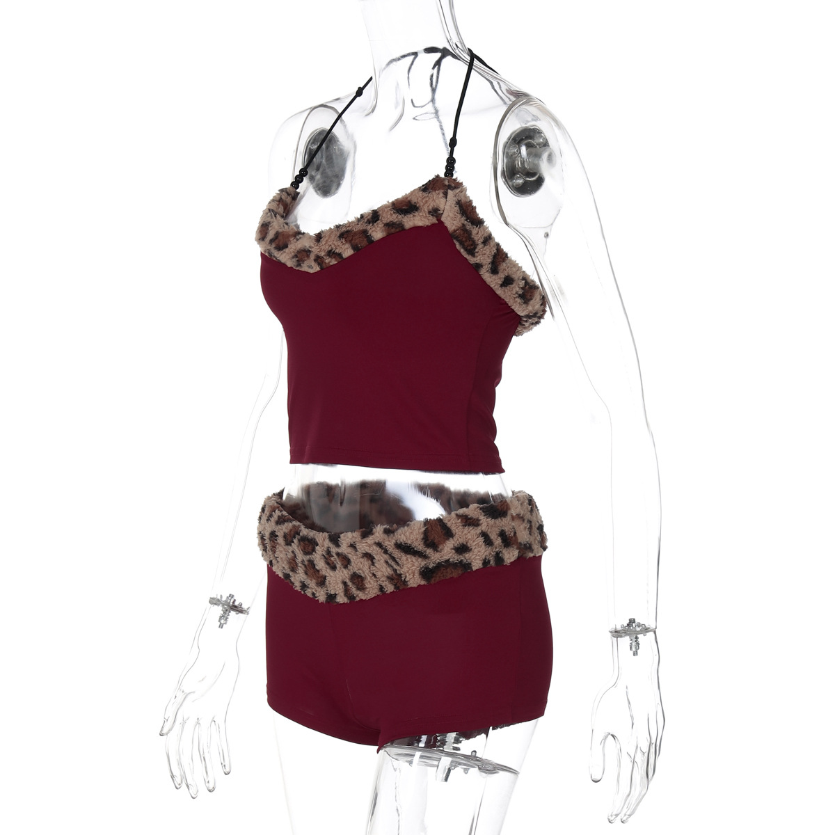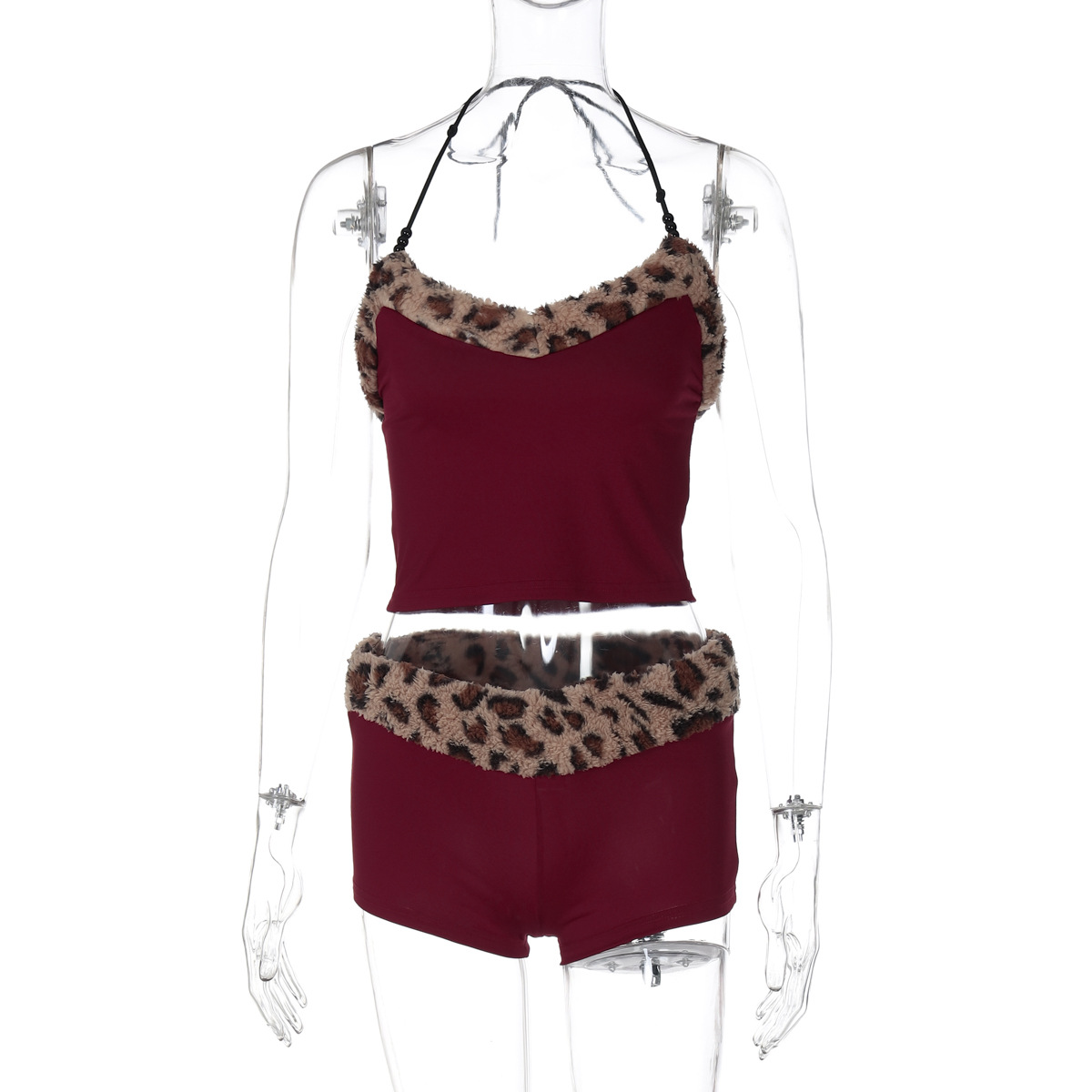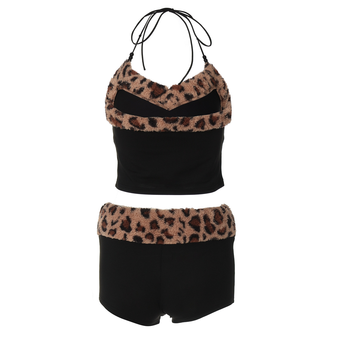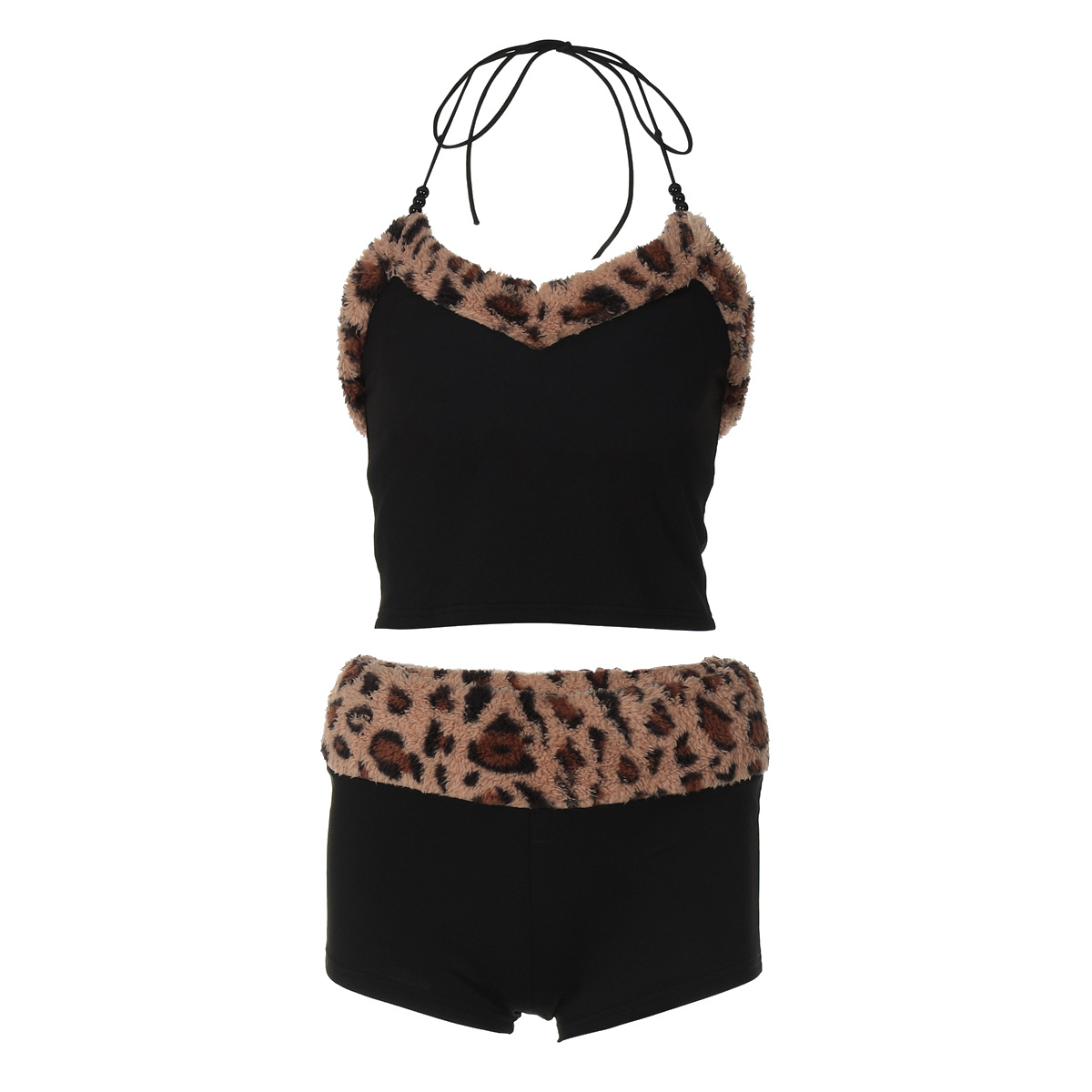 欧美风新品套装甜辣收腰抹胸吊带紧身短裤毛绒豹纹设计两件套女装