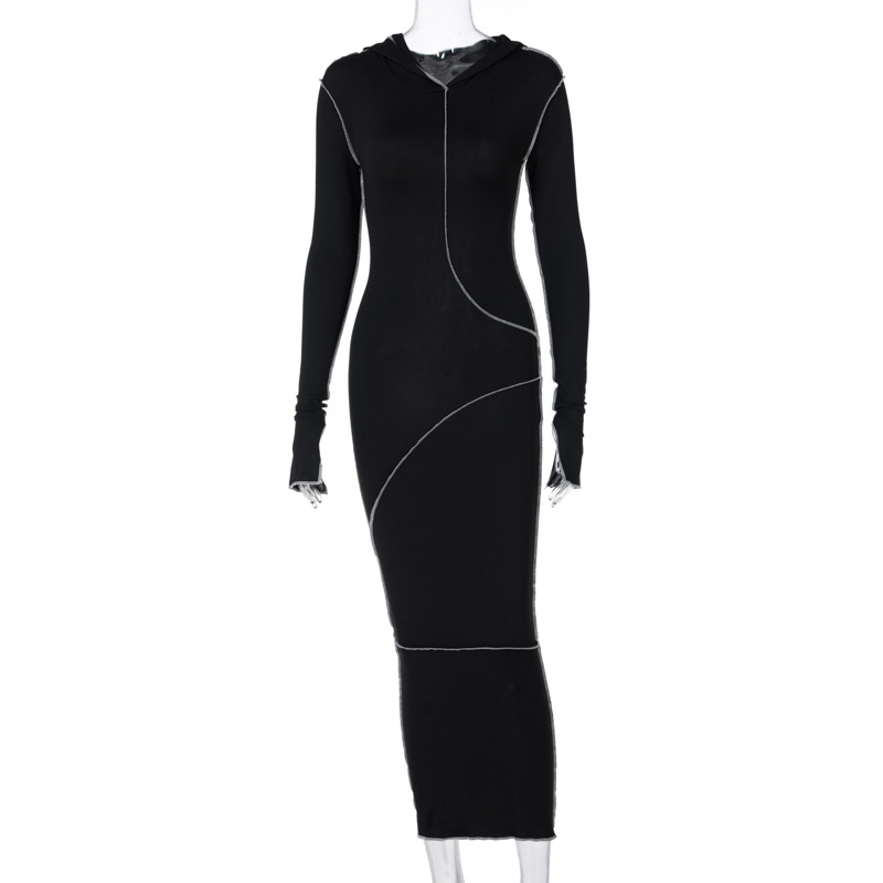 欧美跨境夏季新款纯色反车边连帽长袖修身街头风长款包臀连衣裙女