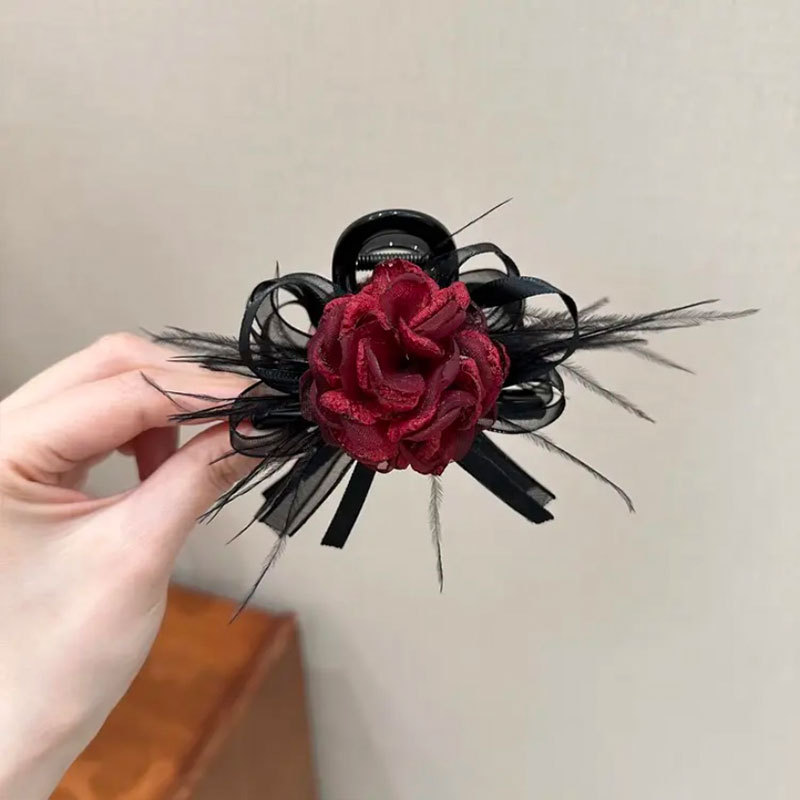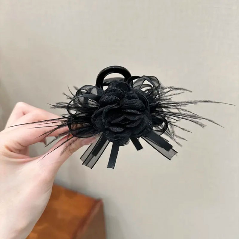 2025羽毛玫瑰花朵抓夹后脑勺马尾发夹半扎鲨鱼夹发饰满天星元素