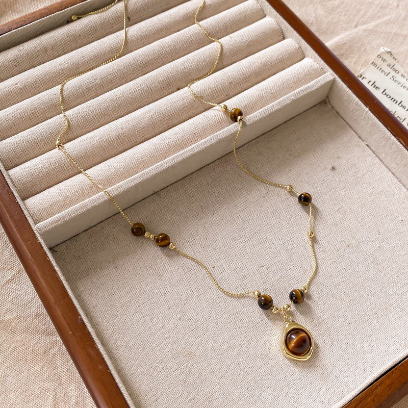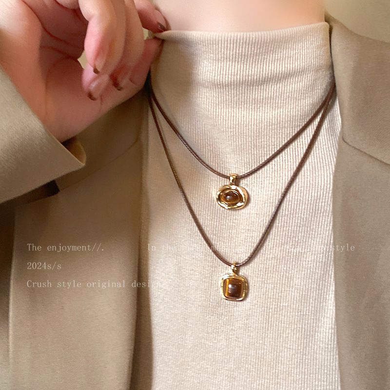 秋冬美拉德串珠虎眼石款吊坠项链女复古气质毛衣链轻奢高级感配饰