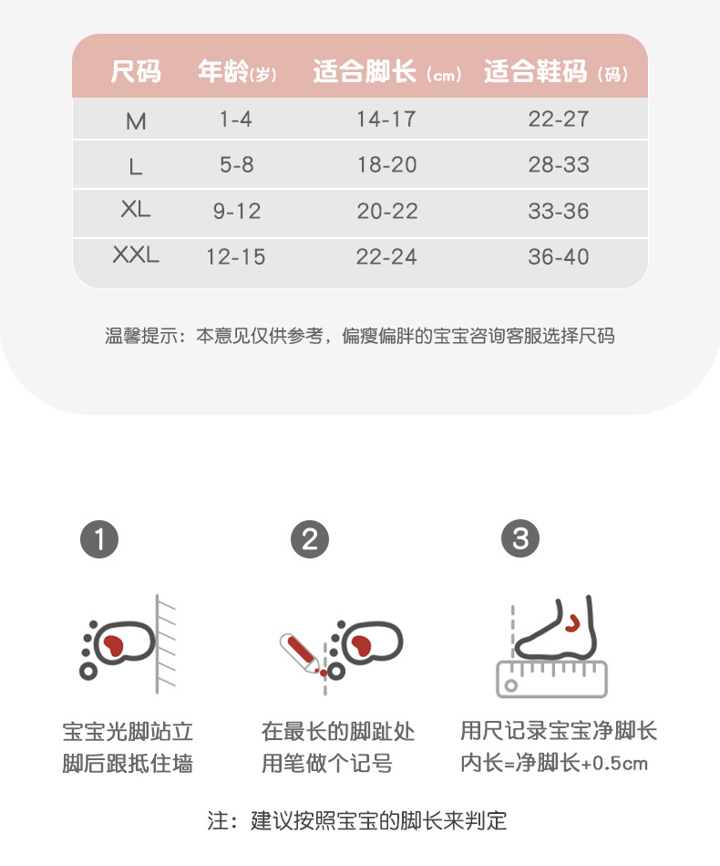 | M(1-4岁)/14-17cm/22-27码 | USD $0.0 | 9999 pair available |