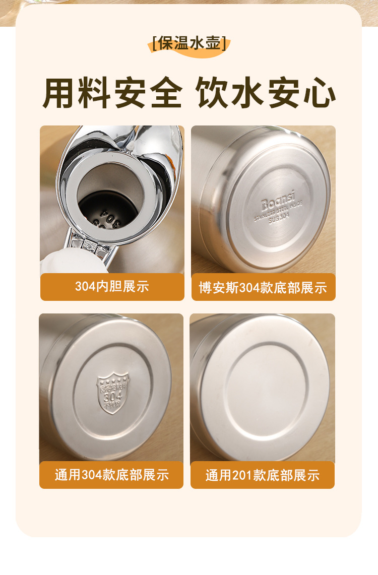 博安斯真空款:(壶身为双层不锈钢,抽真空+内胆包箔处理)加强保温36小时,持久保冷。