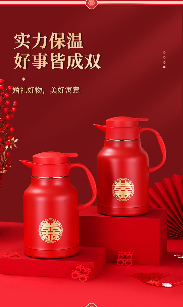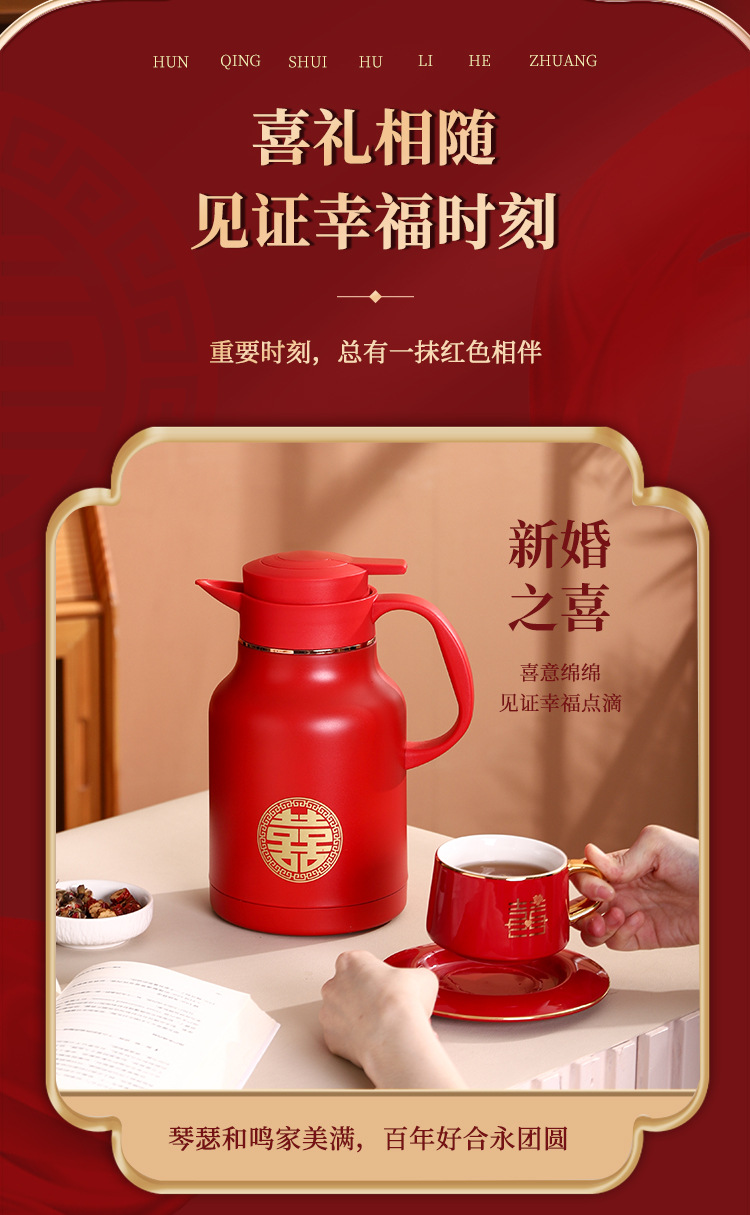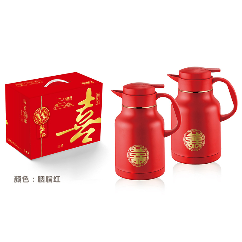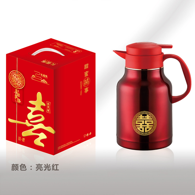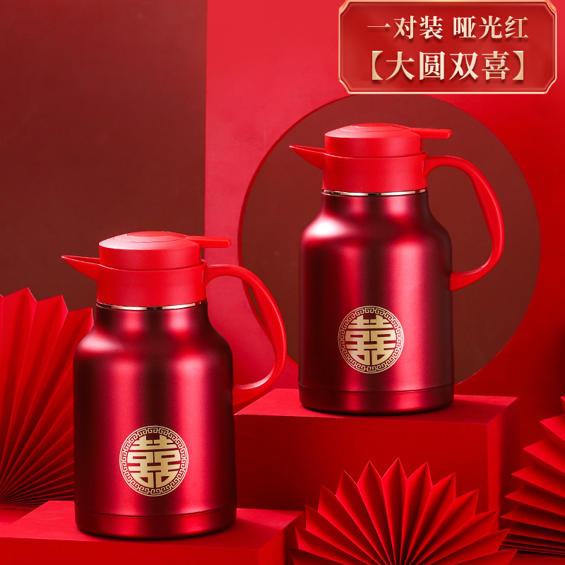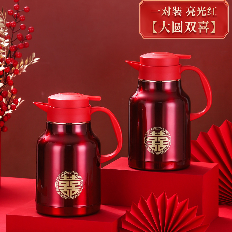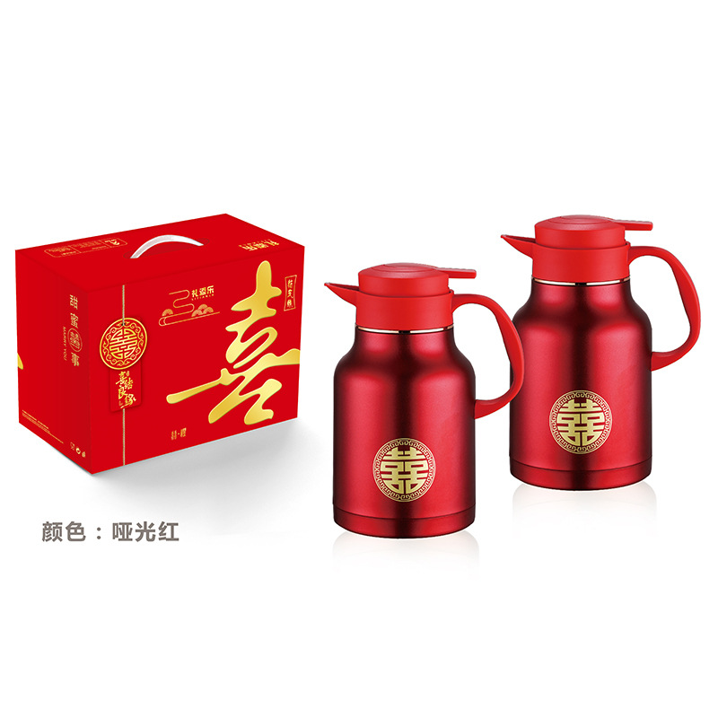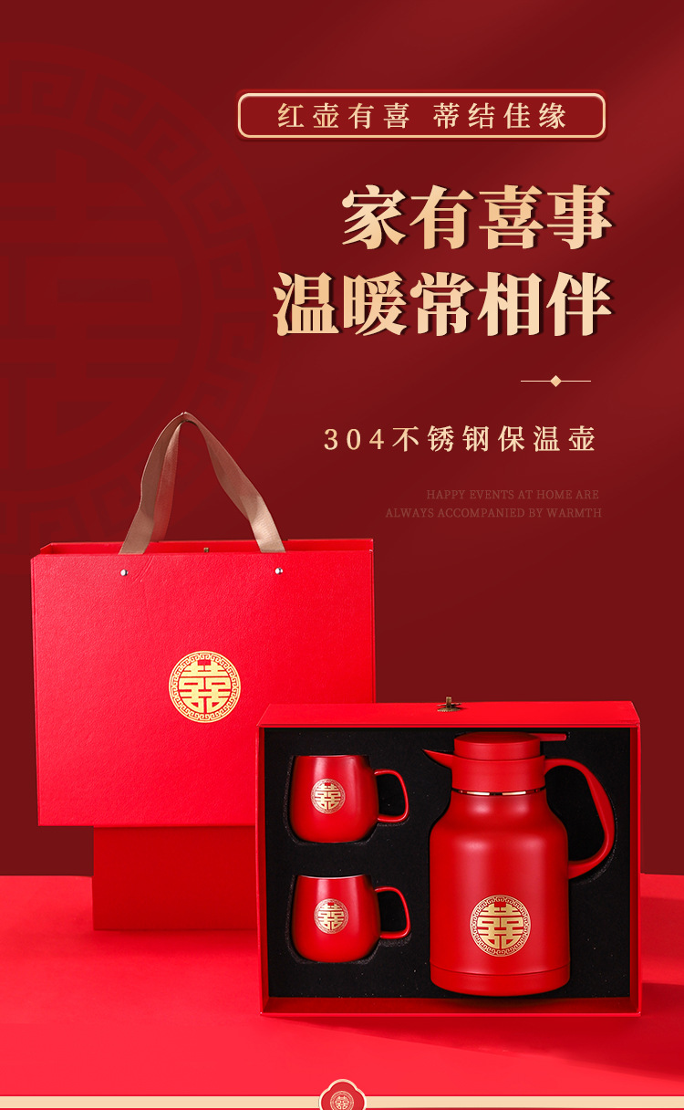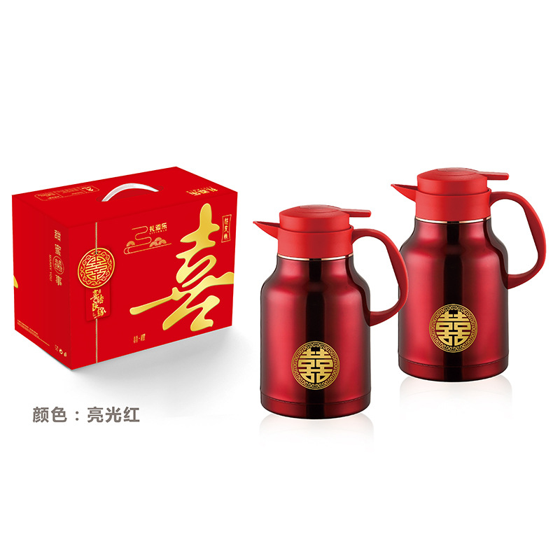 304卡仕壶婚嫁套装礼盒不锈钢喜庆保温壶结婚暖壶陪嫁红色焖茶壶