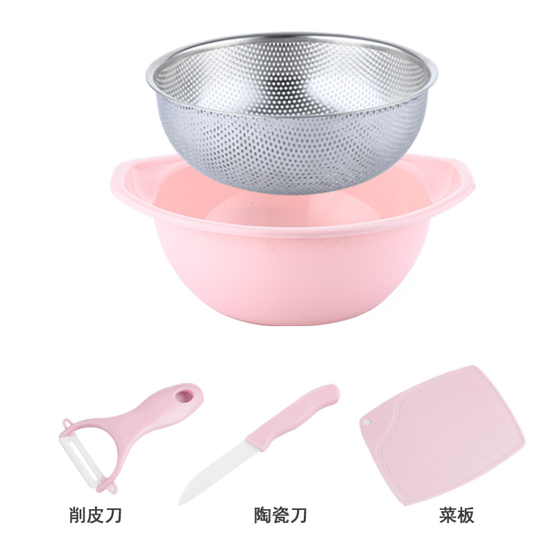 | stainless steel dense hole basket + plastic multi-purpose basin + ceramic peeler + ceramic fruit knife + cutting board(不锈钢密孔篮+塑料多用盆+陶瓷削皮刀+陶瓷水果刀+菜板) | USD $3.86 | 3608 set available |