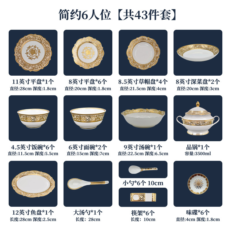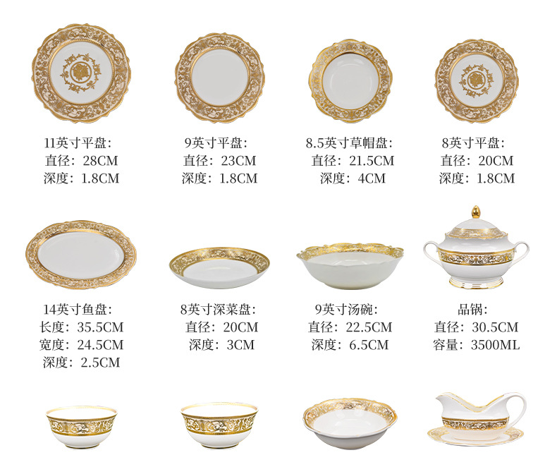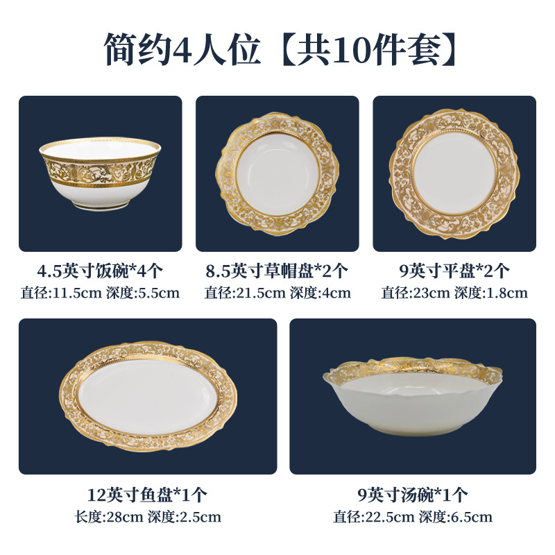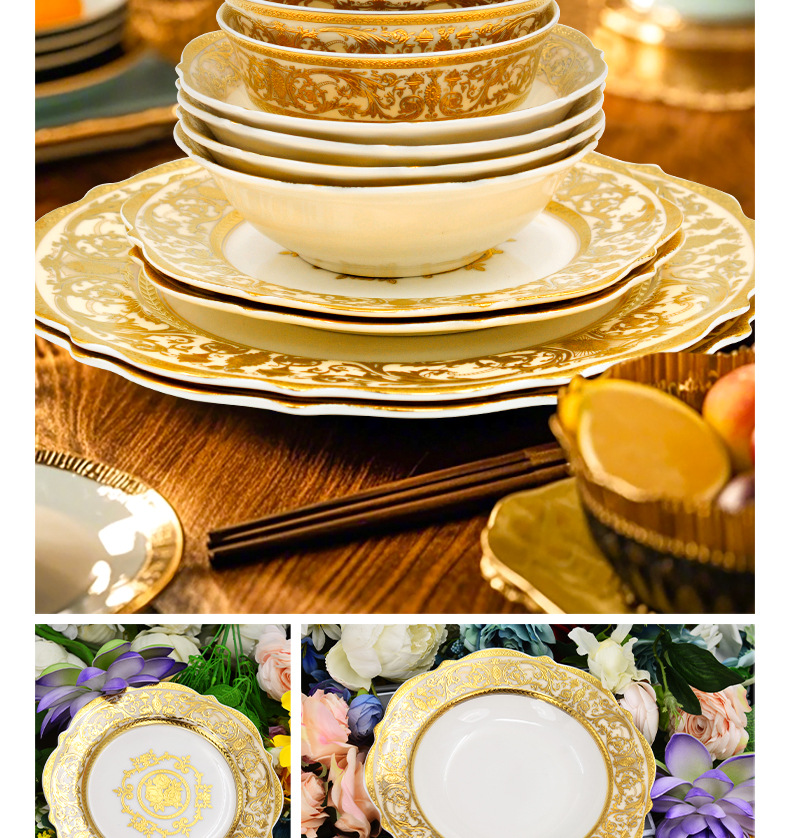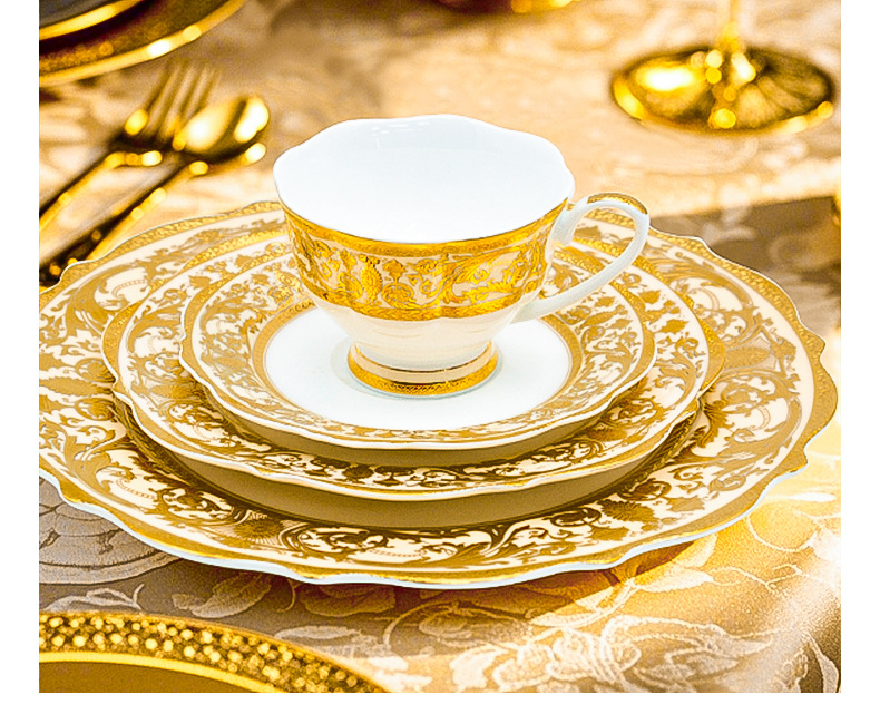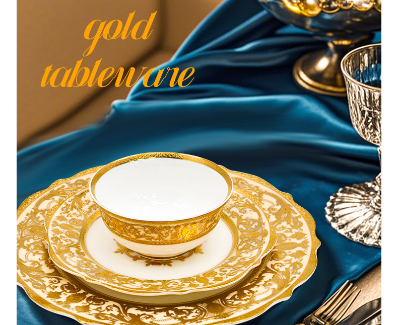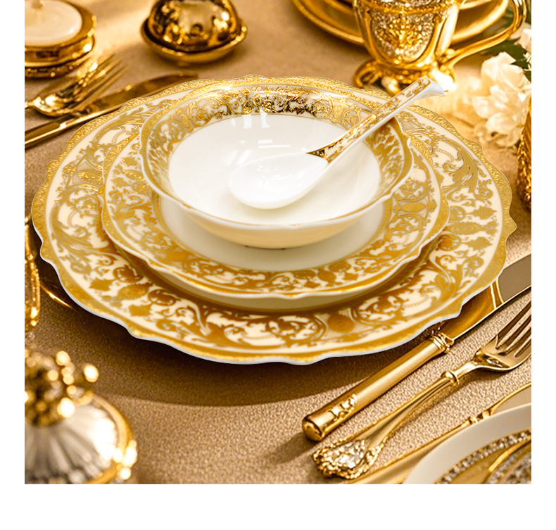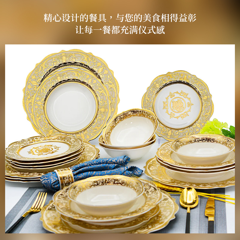 浮雕金色装饰餐具碗盘套装家用风格骨瓷餐具豪华瓷器餐具套装