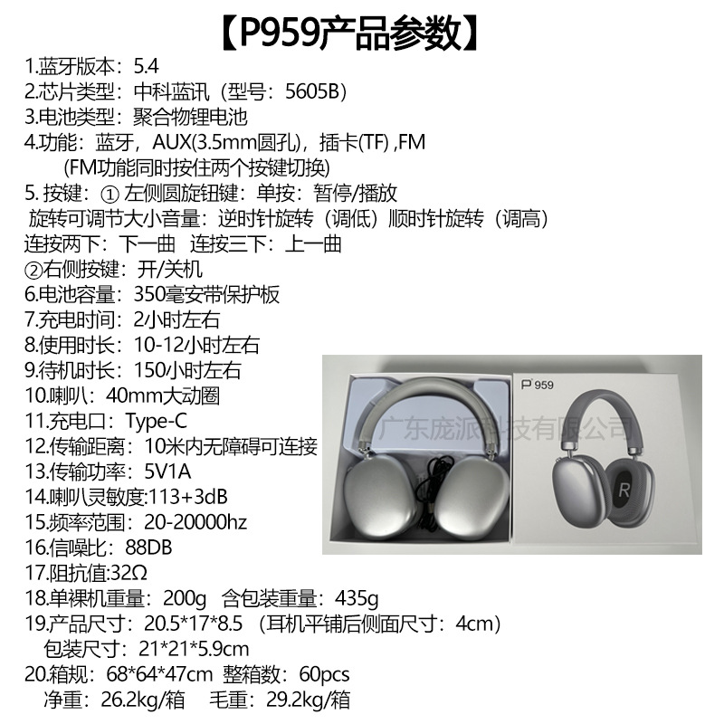 跨境爆款P959无线头戴式耳机蓝牙全包耳旋钮键长续航运动手机适用