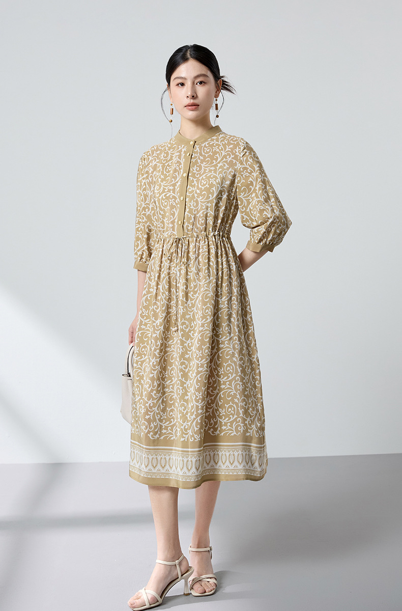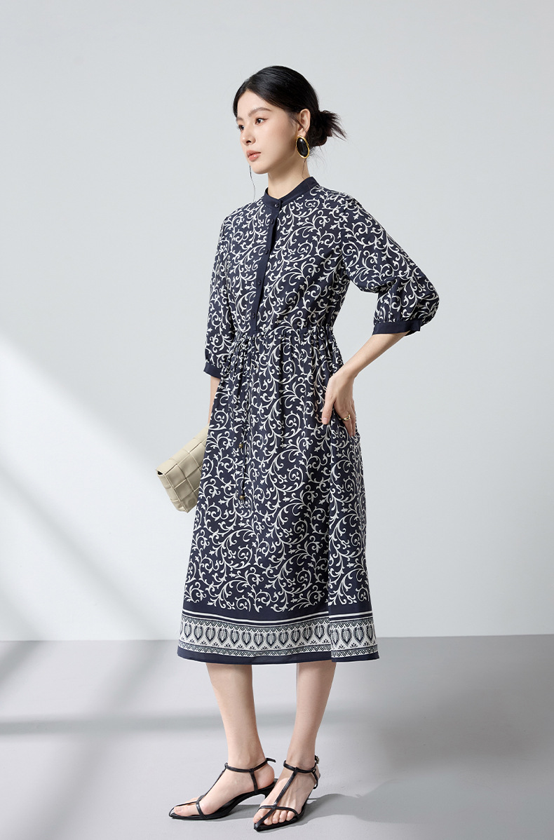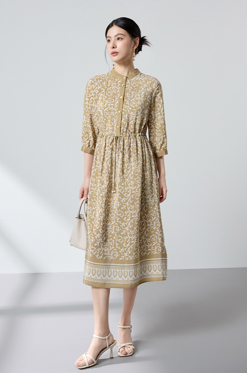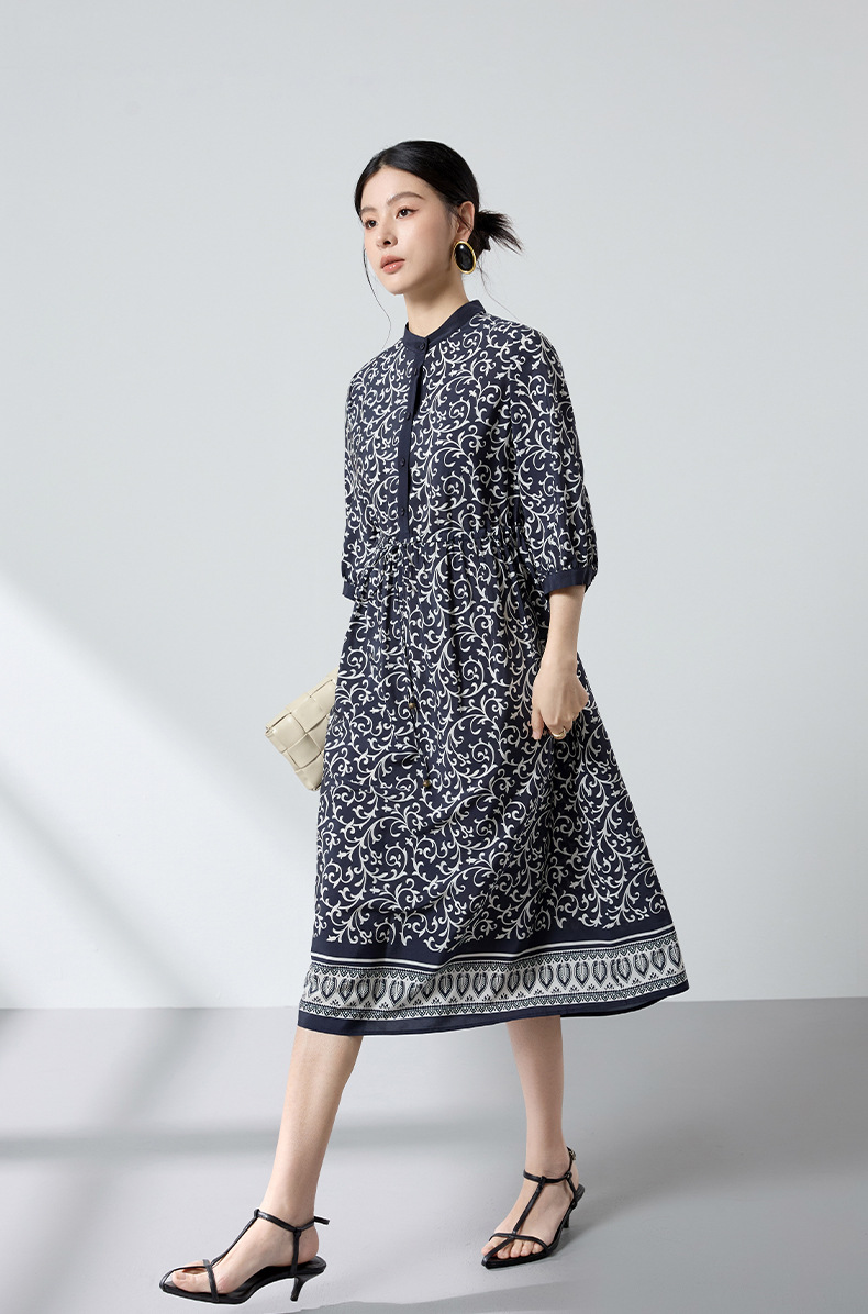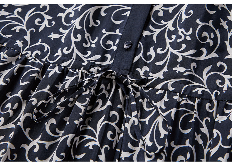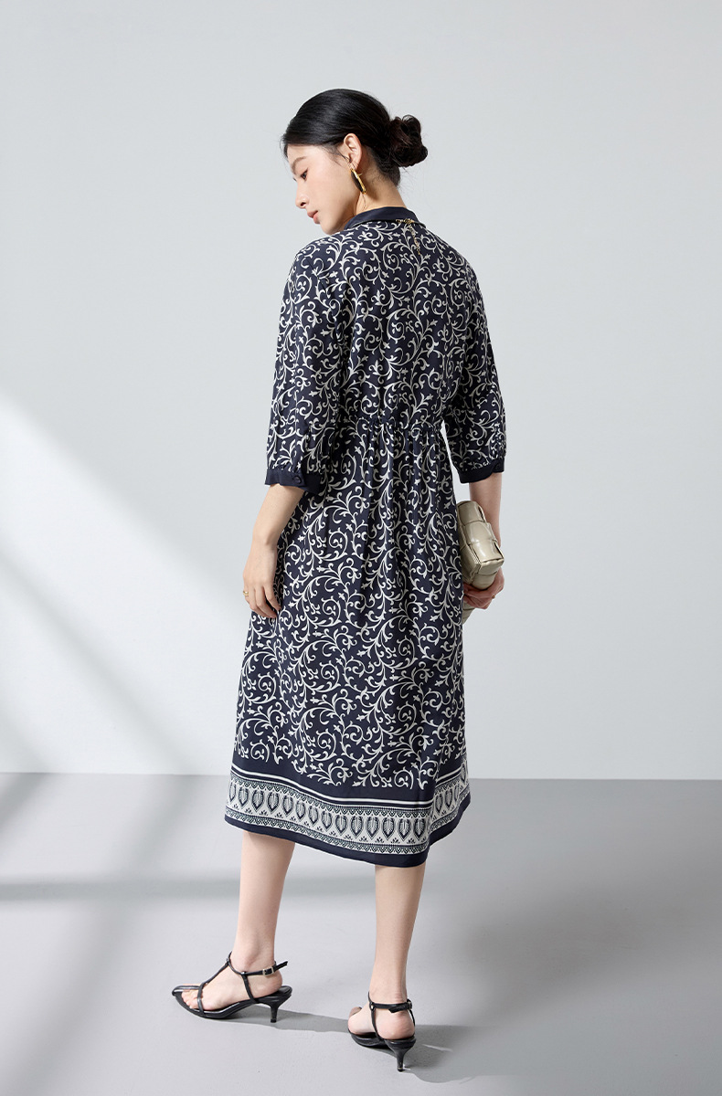 杭州重磅绸缎女士波西米亚印花真丝桑蚕丝连衣裙女长袖复古风春季