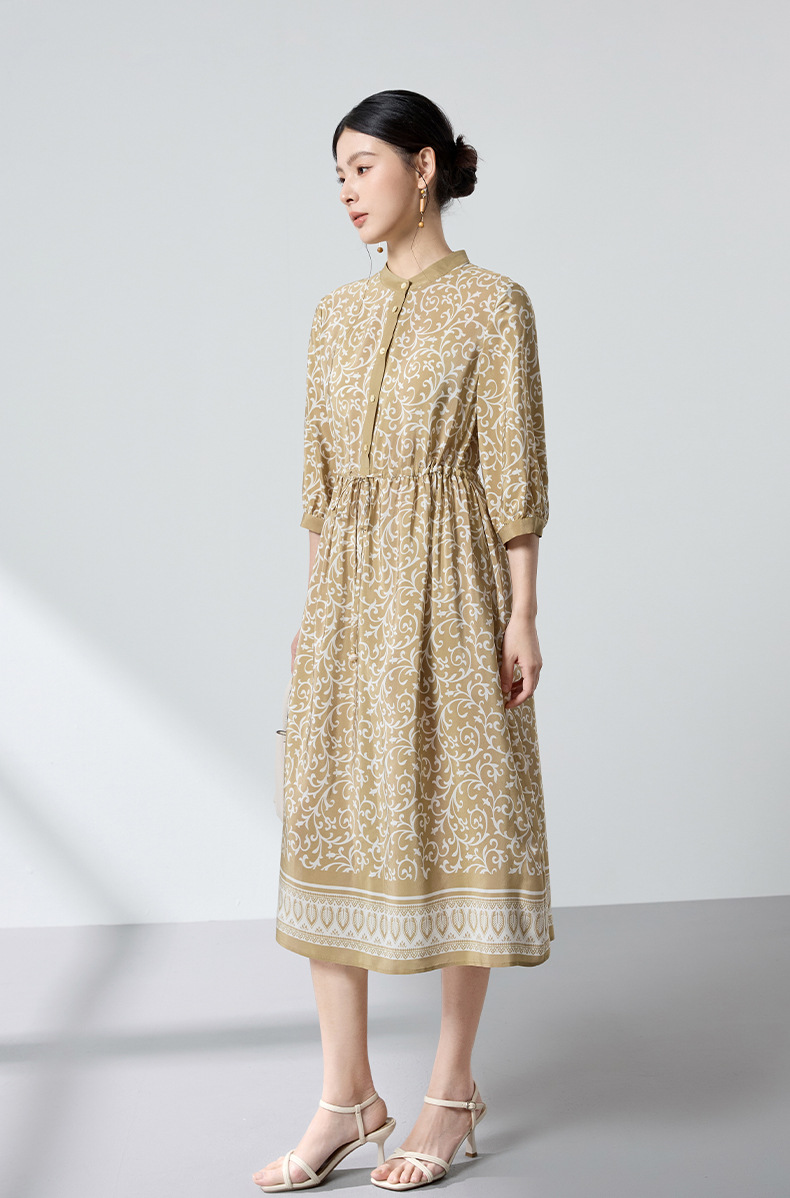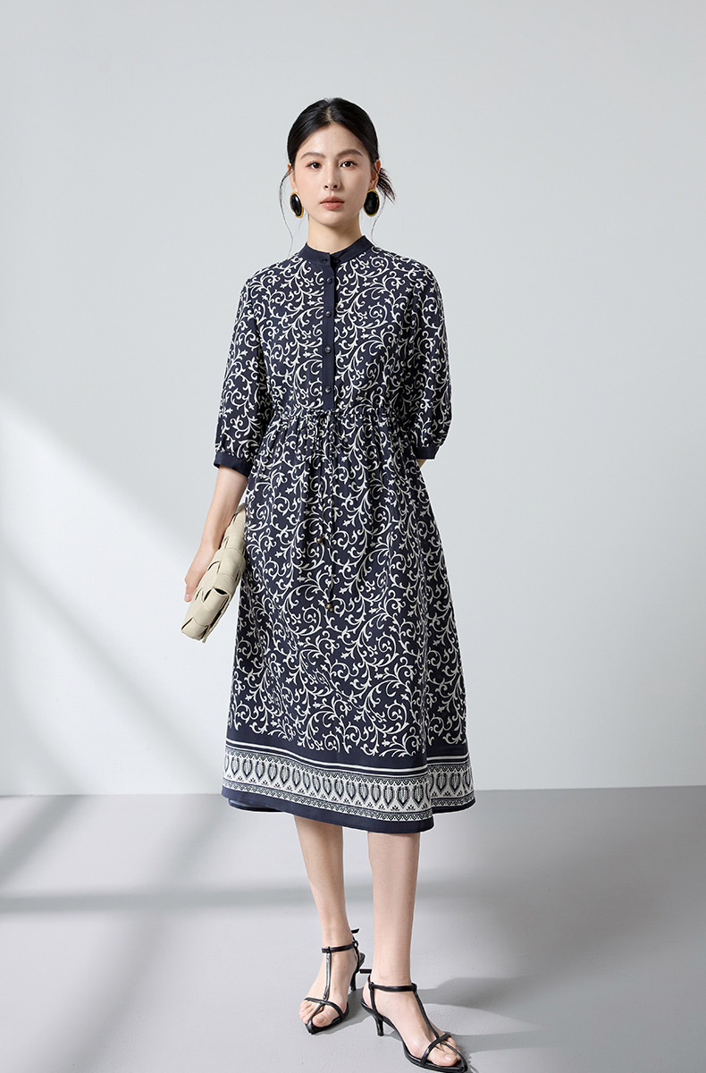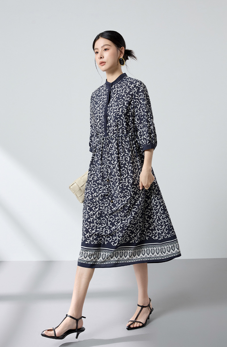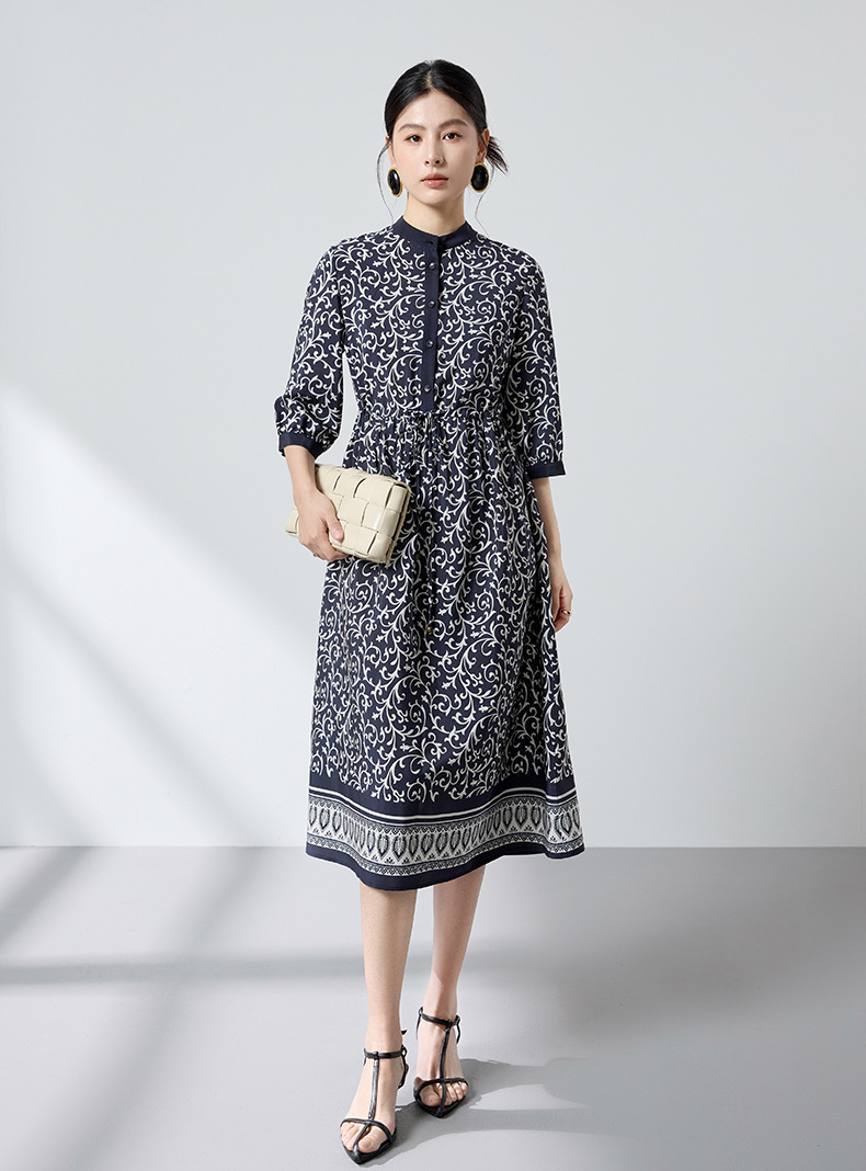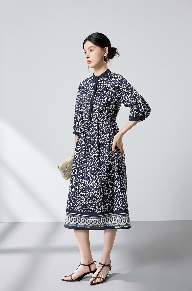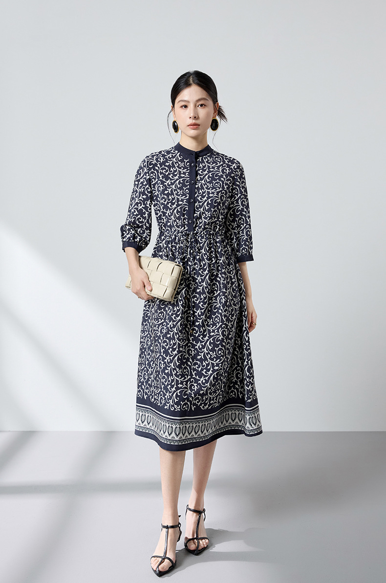 杭州重磅绸缎女士波西米亚印花真丝桑蚕丝连衣裙女长袖复古风春季