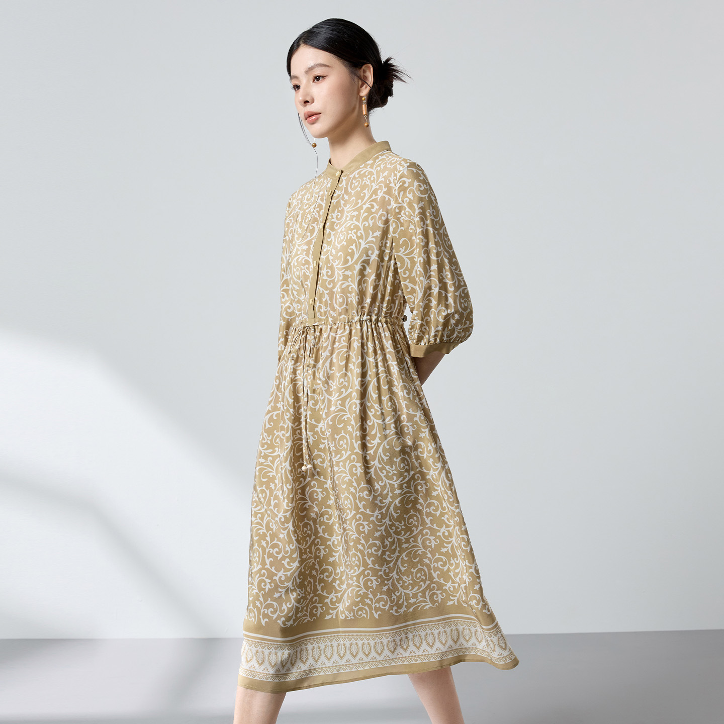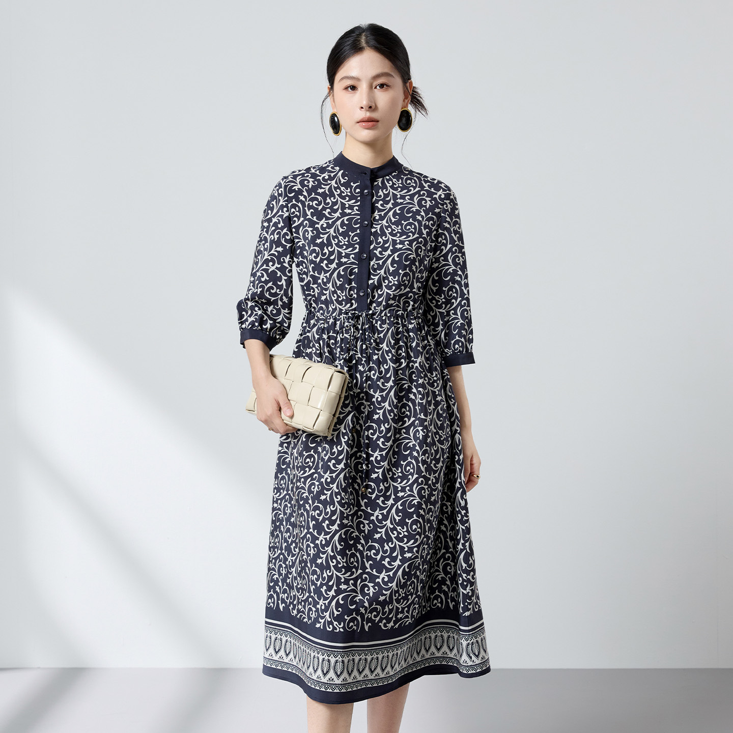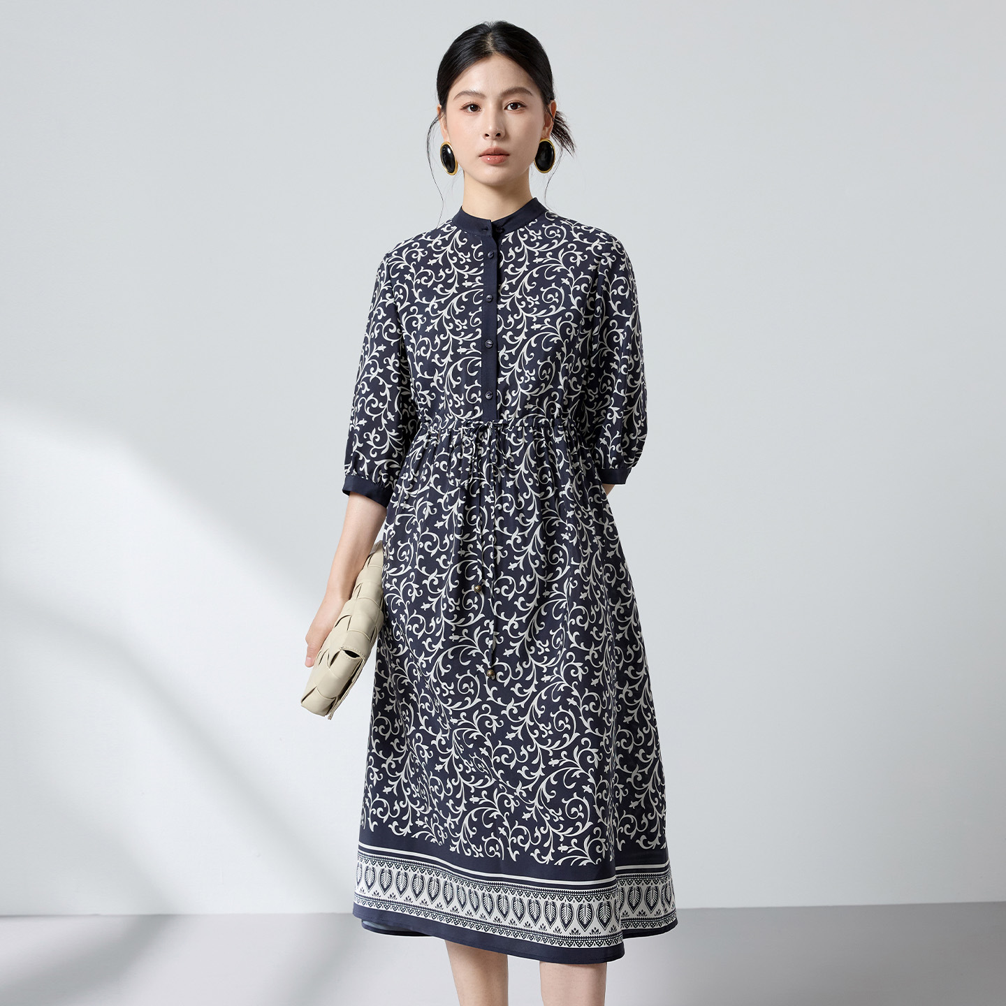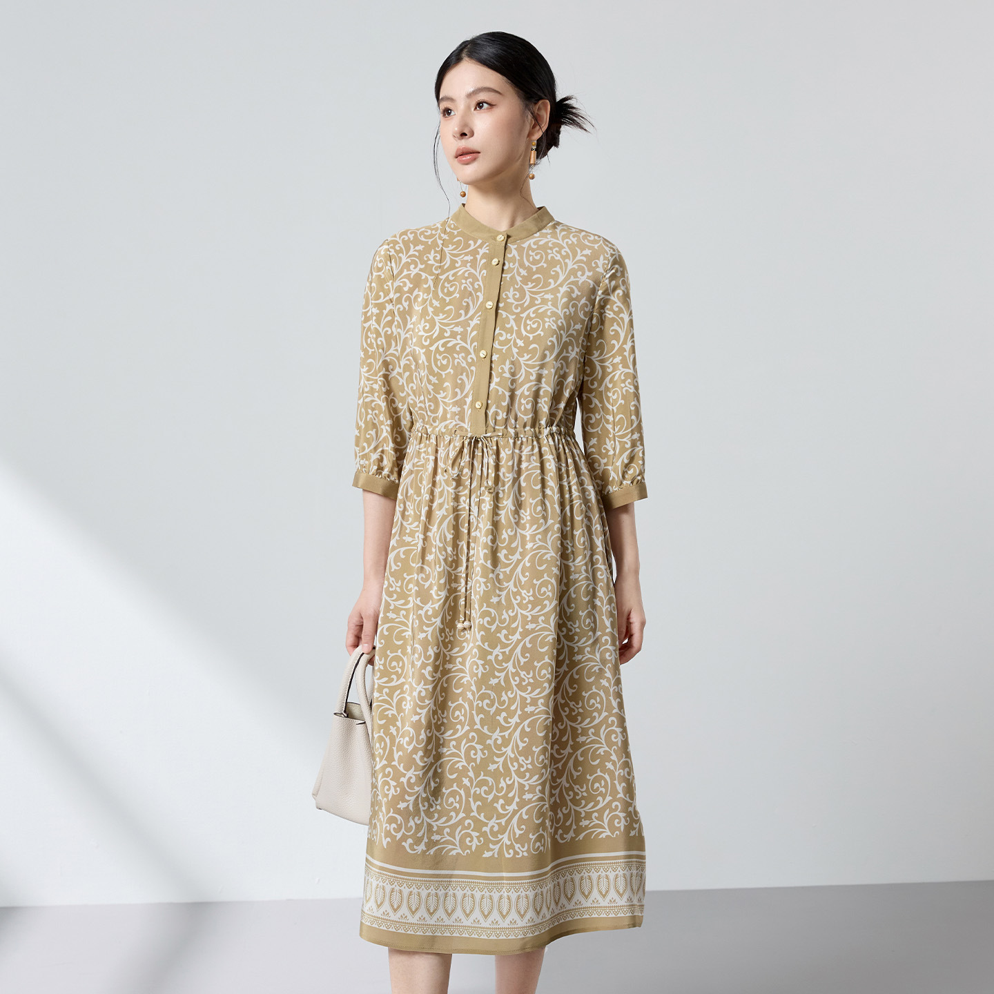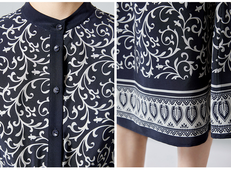 杭州重磅绸缎女士波西米亚印花真丝桑蚕丝连衣裙女长袖复古风春季