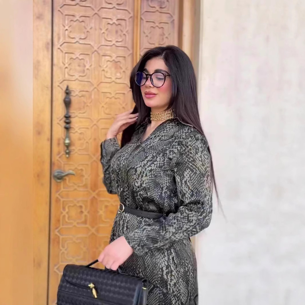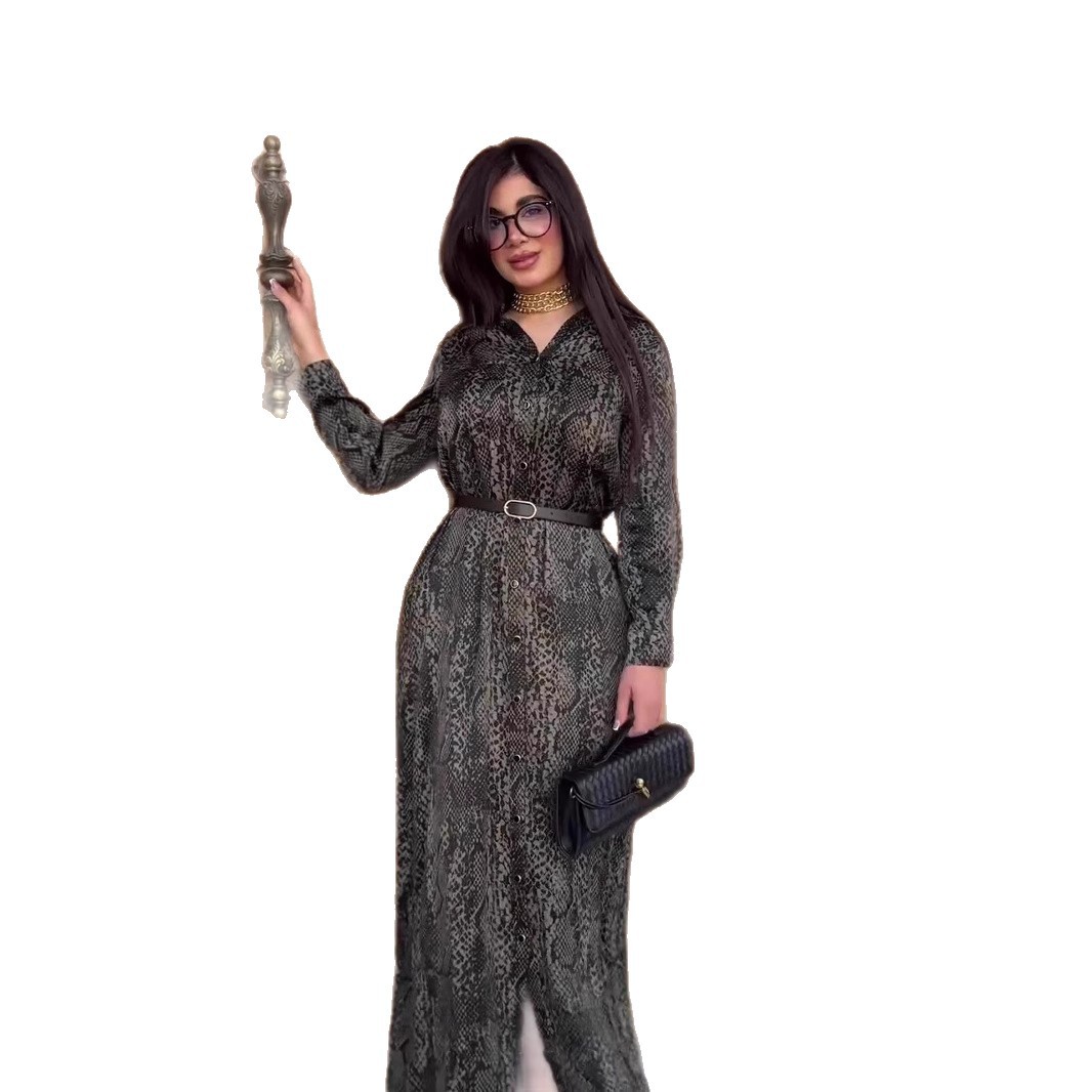 外贸跨境女装亚马逊蟒蛇纹印花中长款衬衫式单排扣系带长袖连衣裙