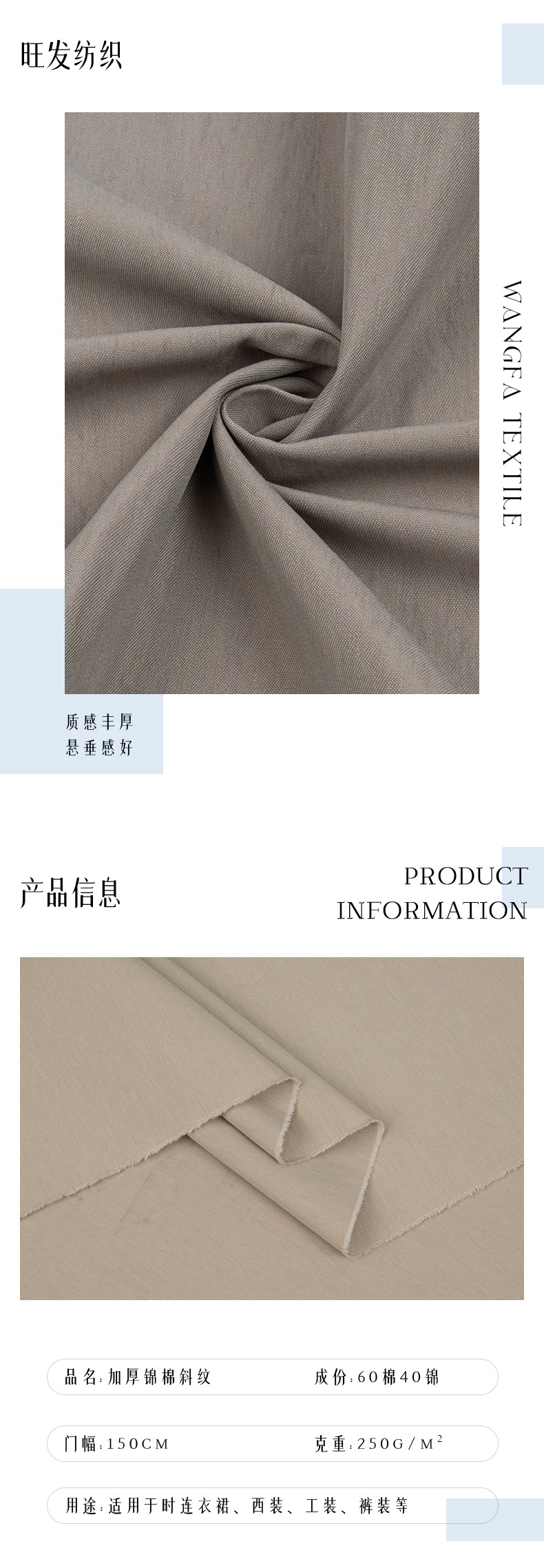 250g加厚锦棉斜纹梭织面料 挺括衬衫快时尚女装工装裤连衣裙面料