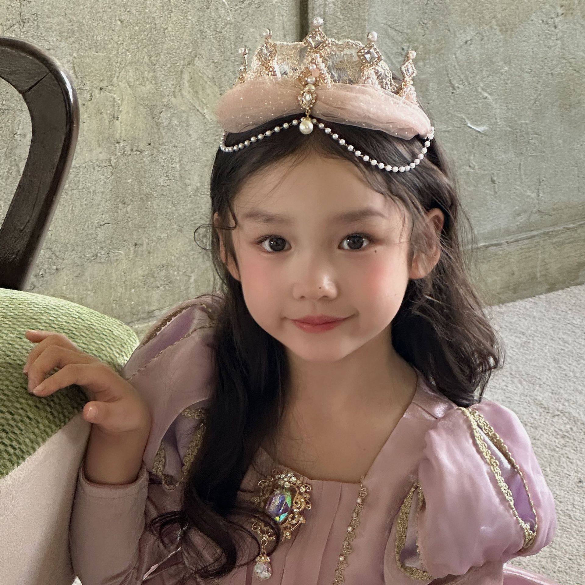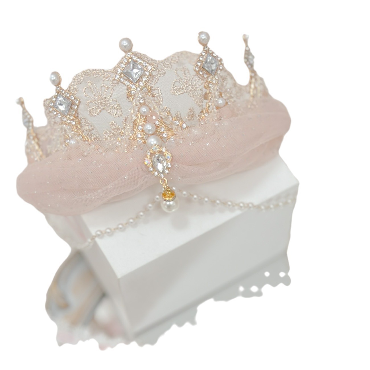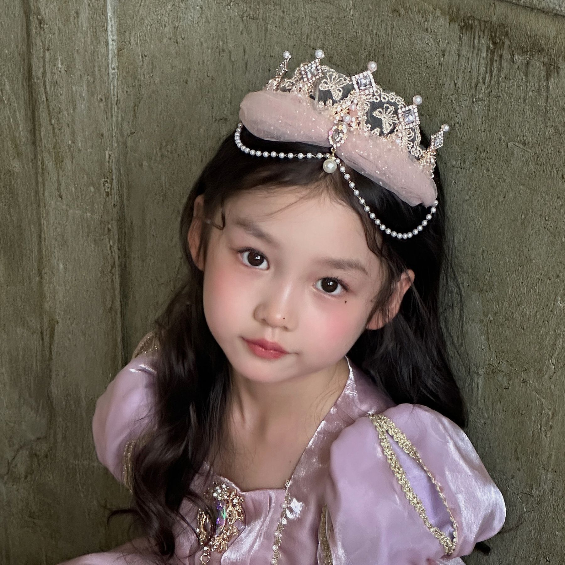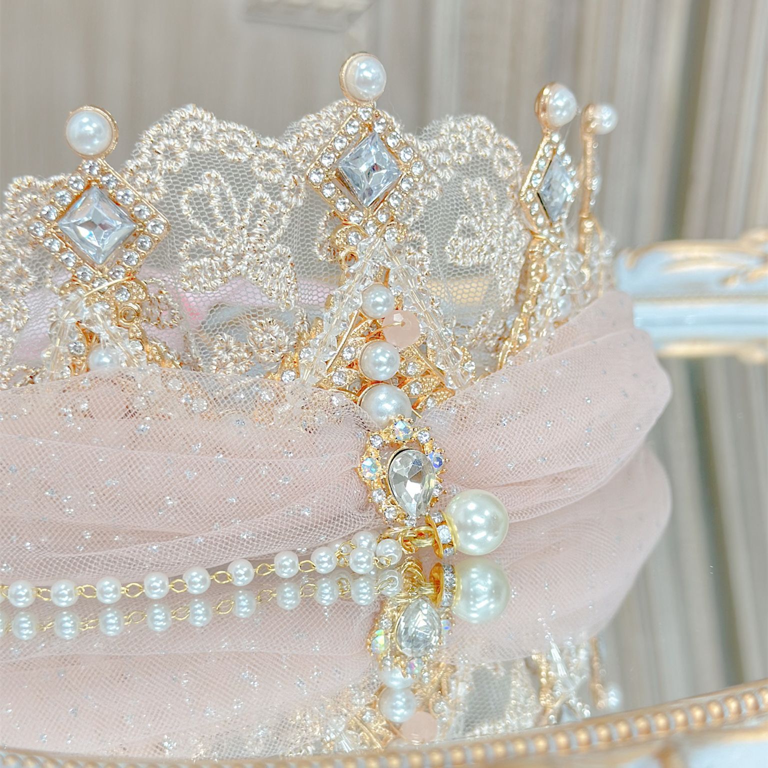儿童宫廷风公主皇冠发饰发箍粉色蕾丝网纱珍珠宝石花边头饰超仙