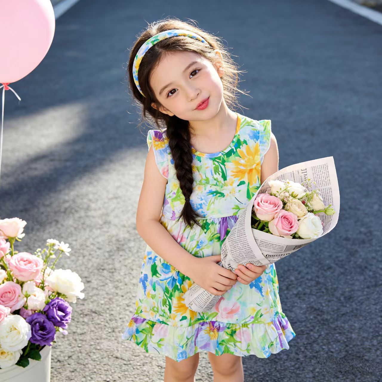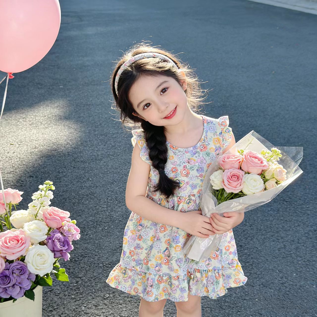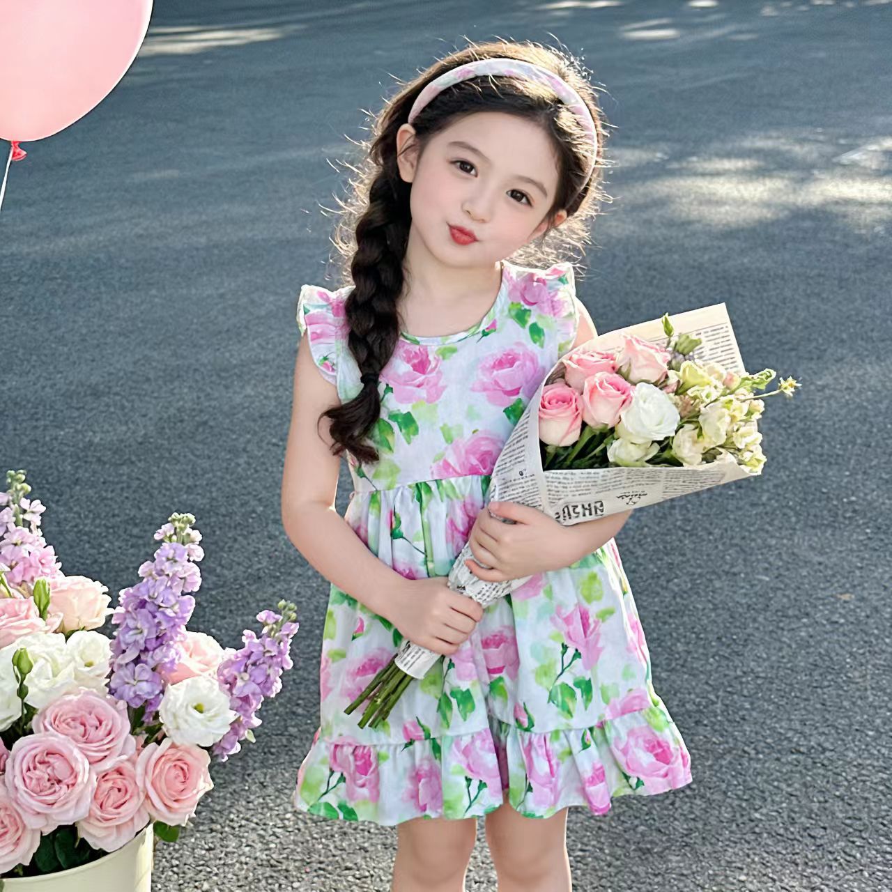 儿童棉绸裙子夏季薄款a类女童碎花飞袖连衣裙淑女宝公主洋气批发