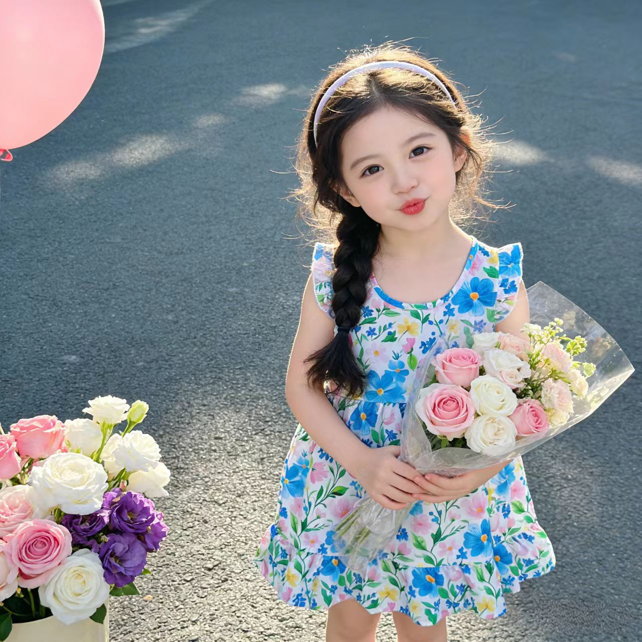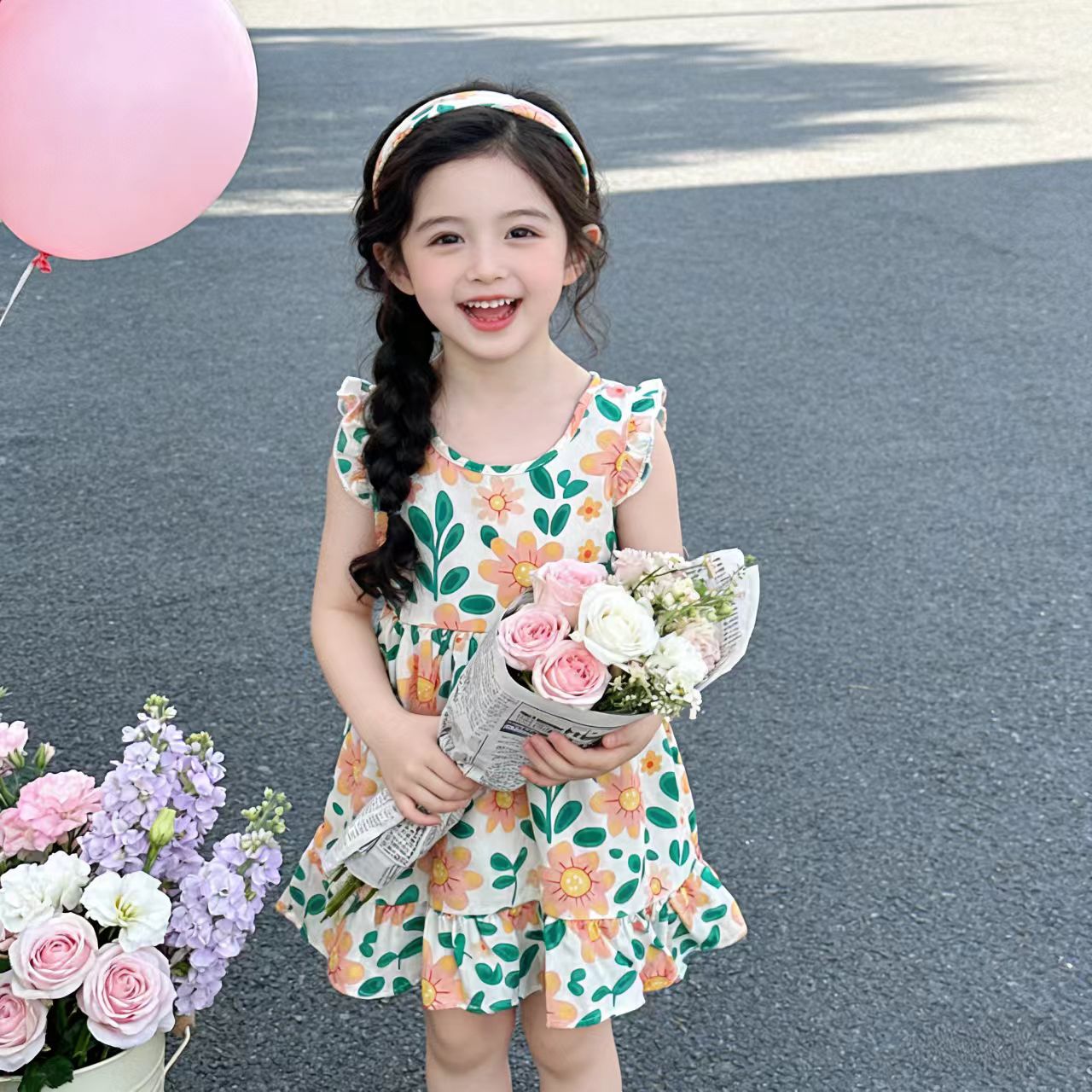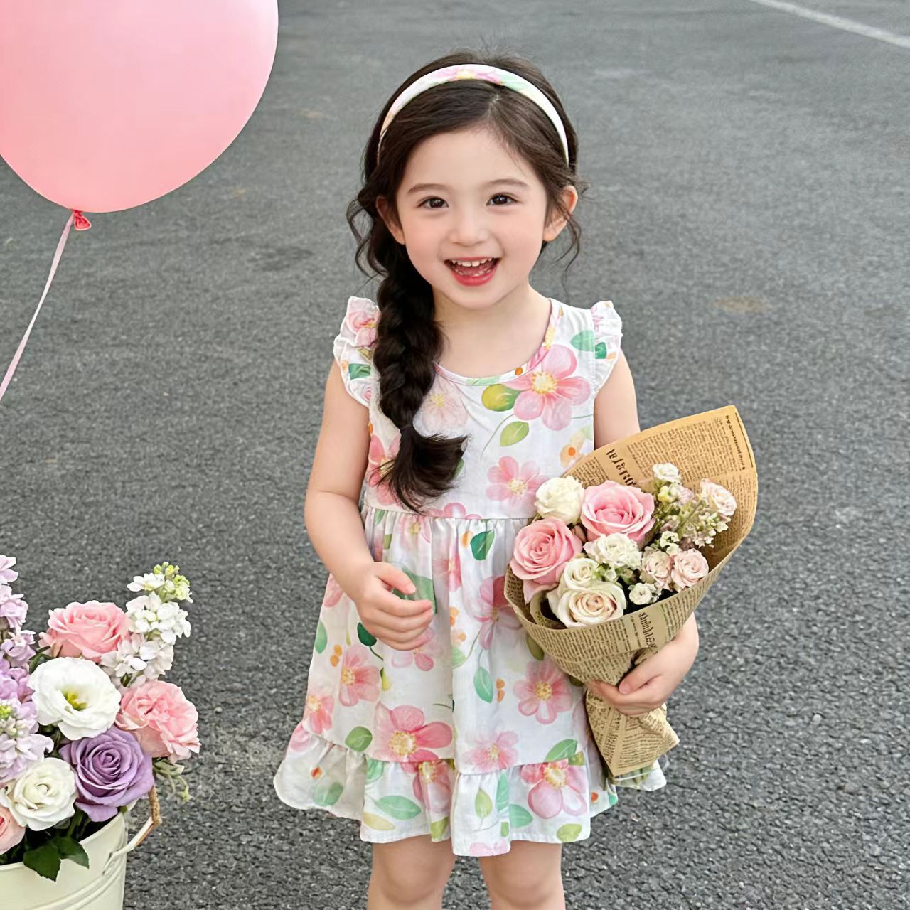儿童棉绸裙子夏季薄款a类女童碎花飞袖连衣裙淑女宝公主洋气批发