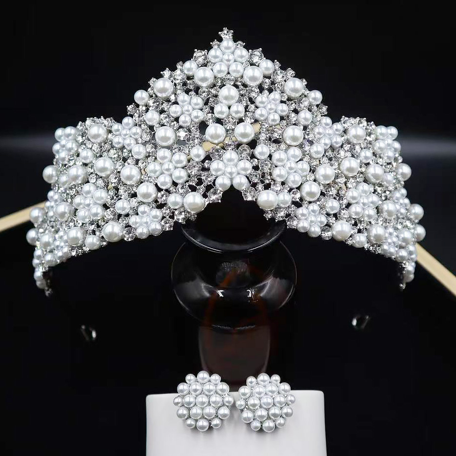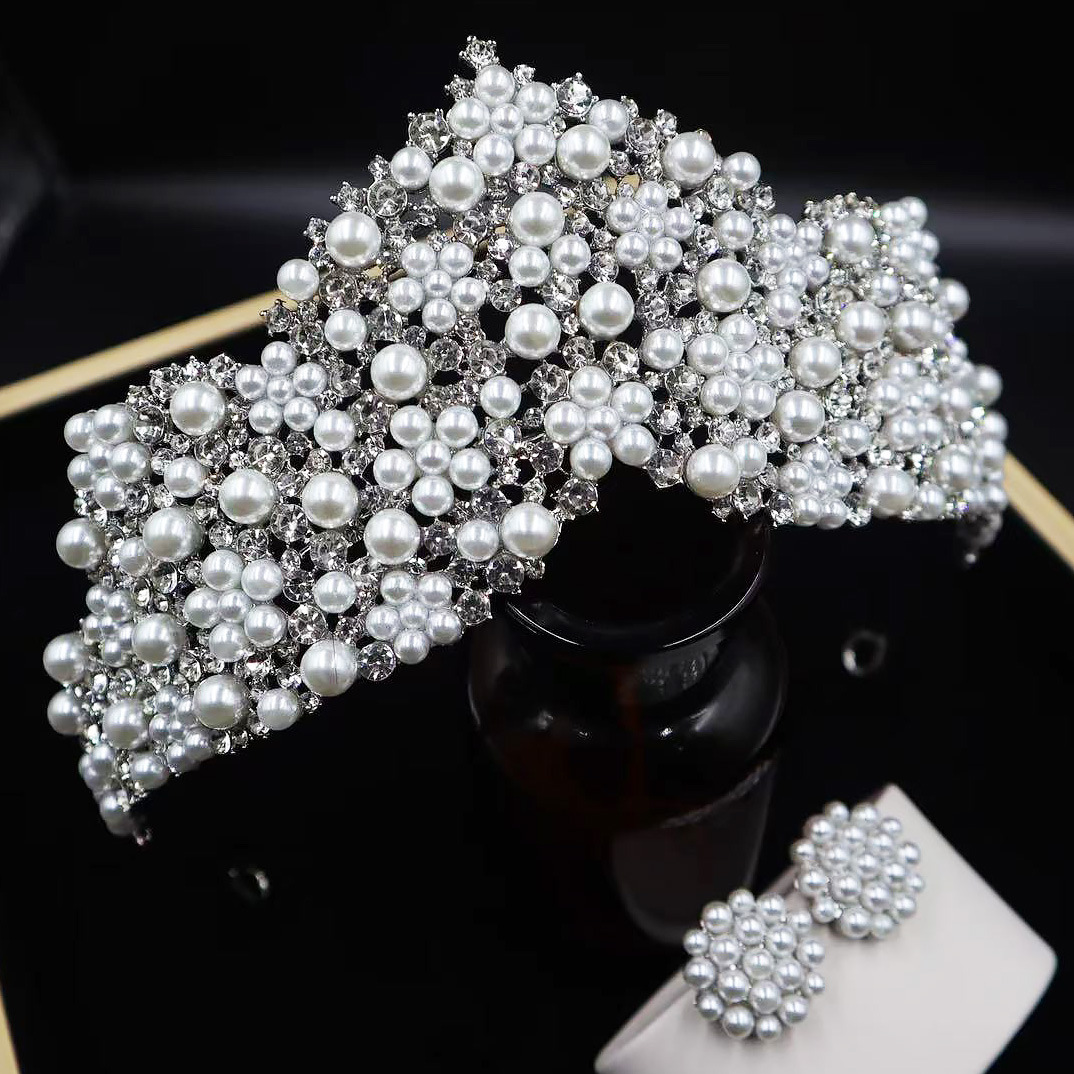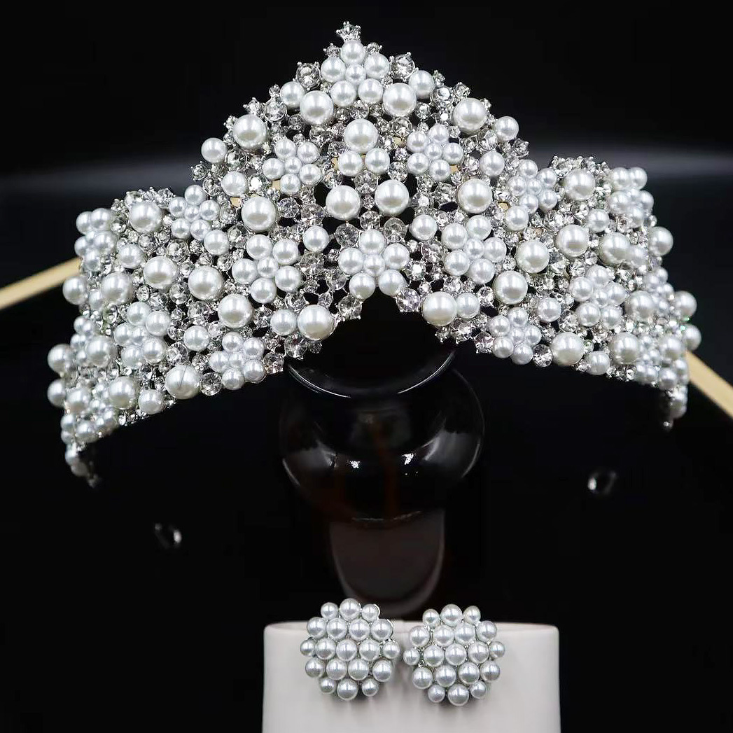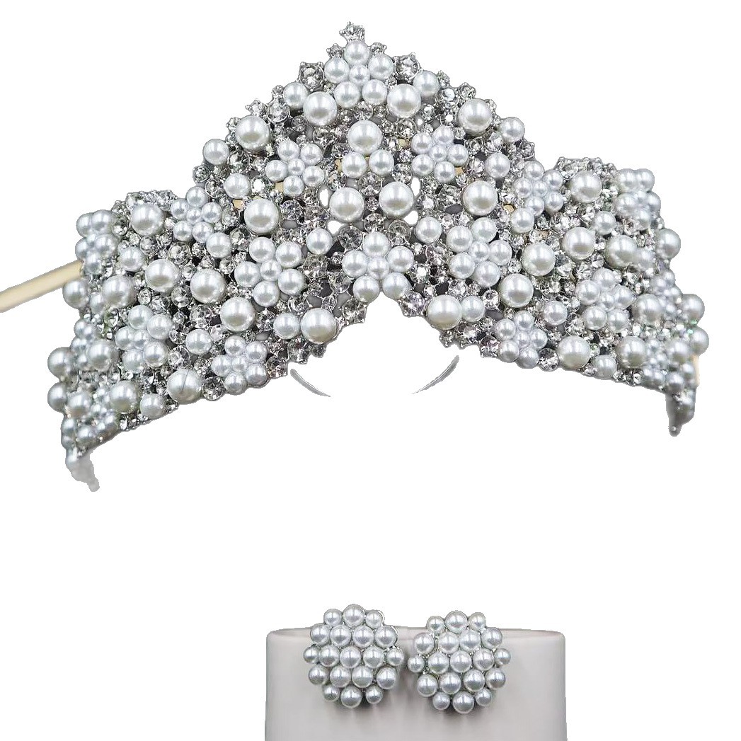 韩式新款新娘珍珠皇冠耳环套装 手工镶嵌AAA水钻高亮珍珠婚纱配饰