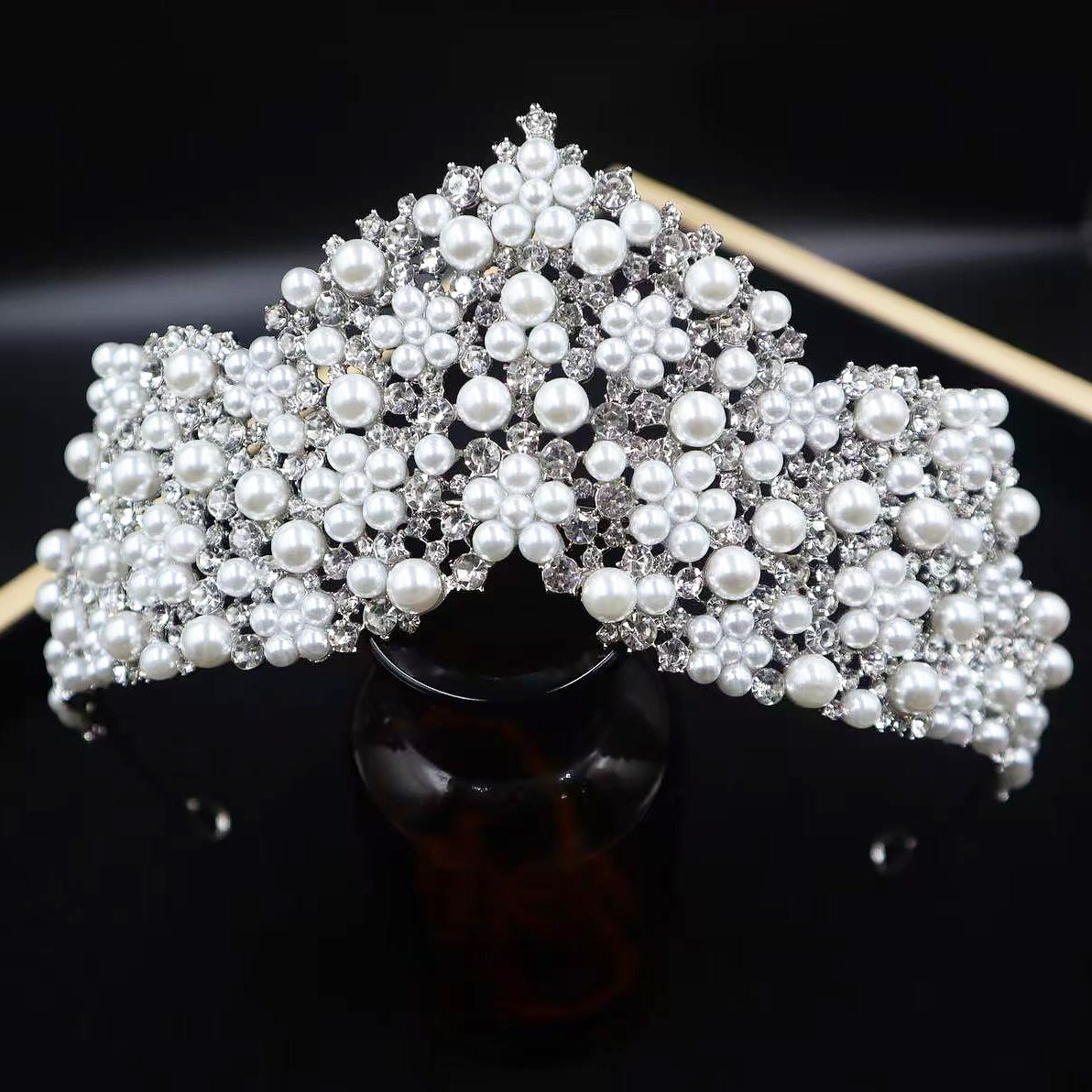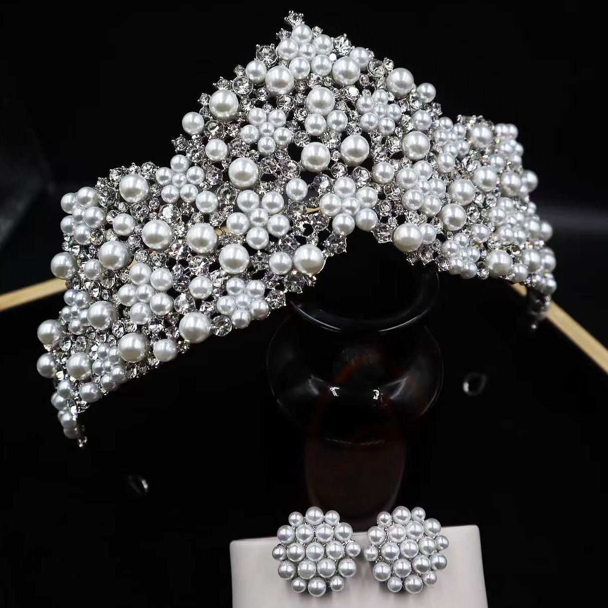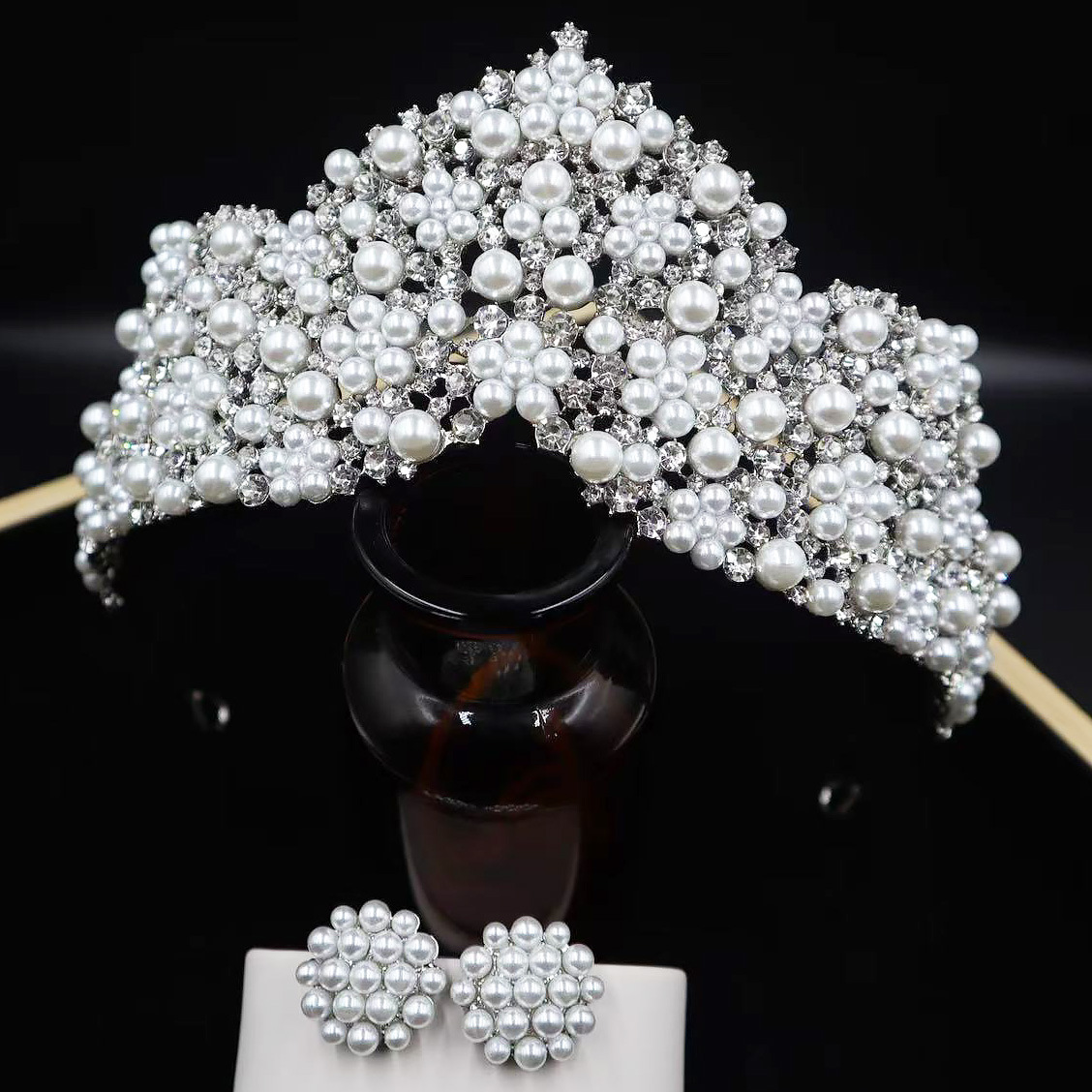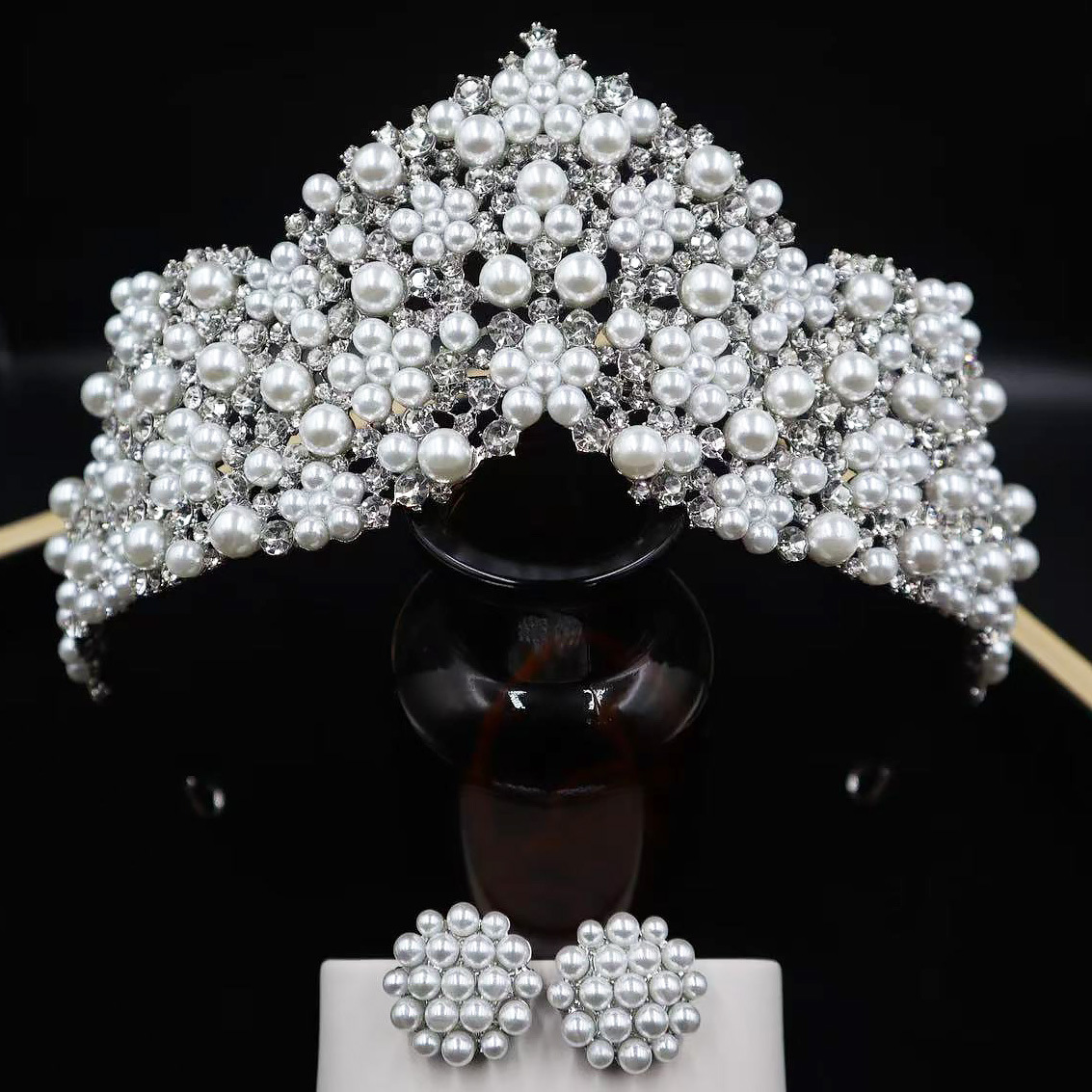 韩式新款新娘珍珠皇冠耳环套装 手工镶嵌AAA水钻高亮珍珠婚纱配饰