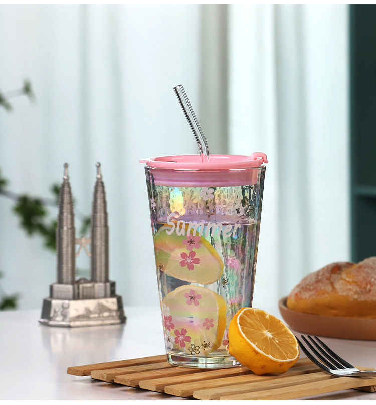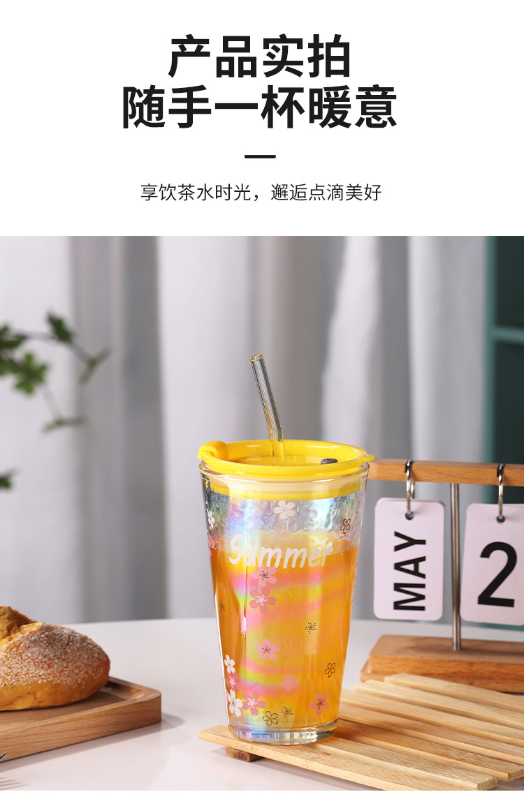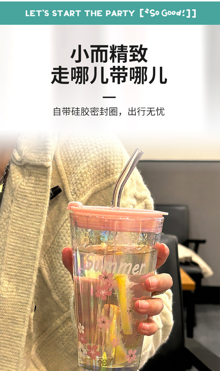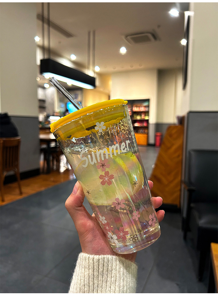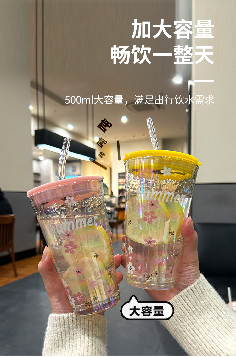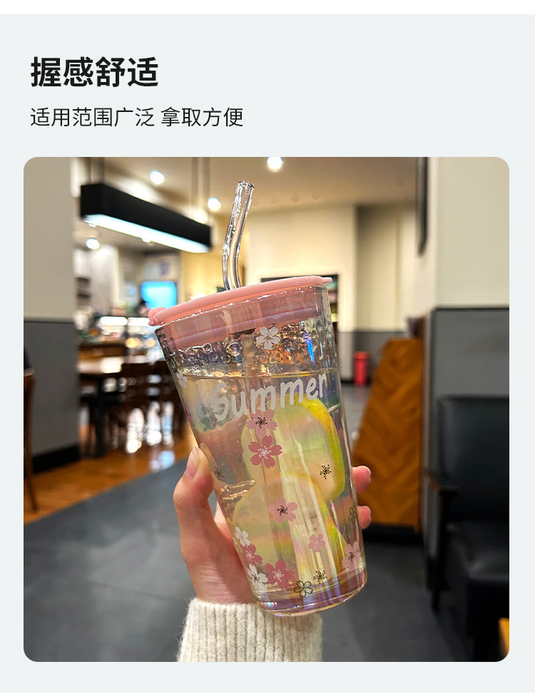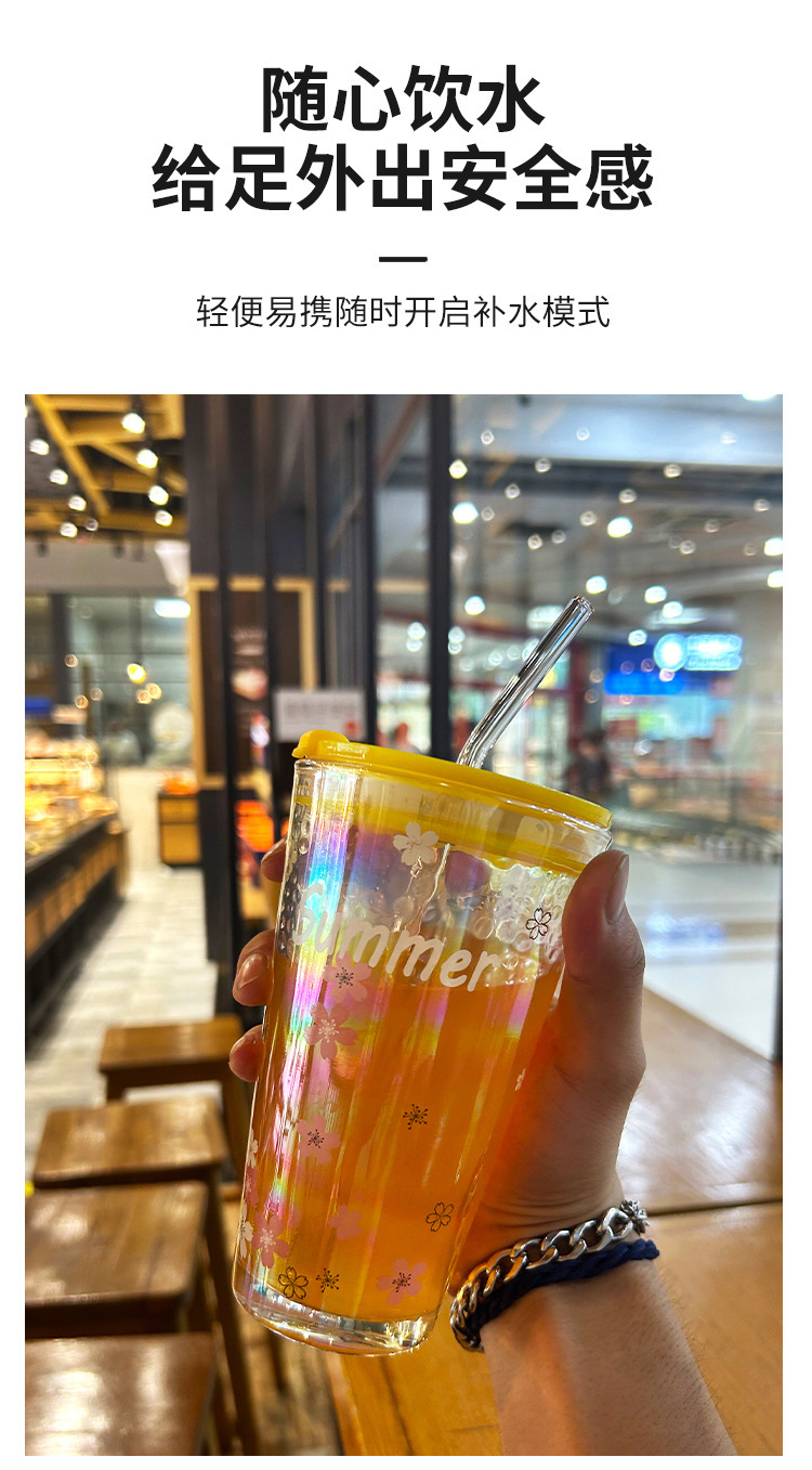 夏季网红樱花吸管杯玻璃杯女生吸管高颜值玻璃刻度杯礼品咖啡杯子
