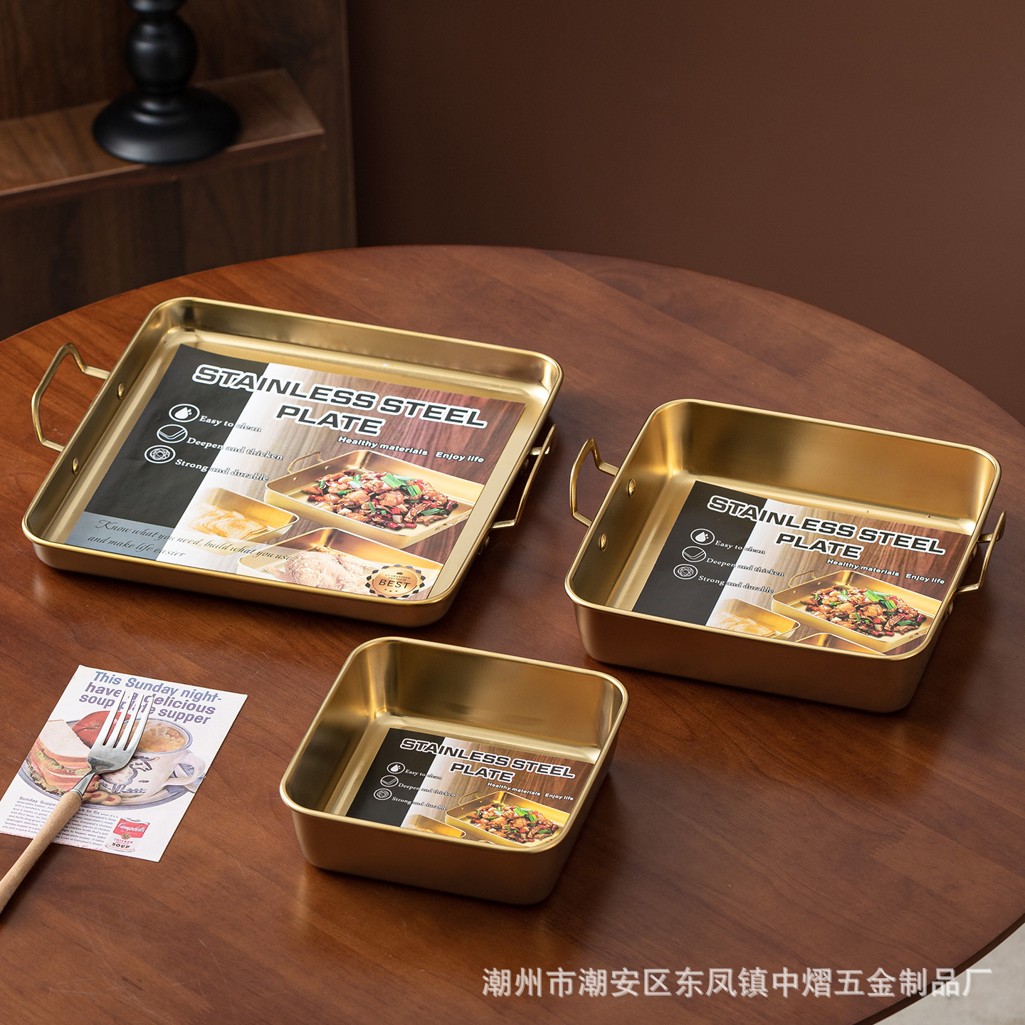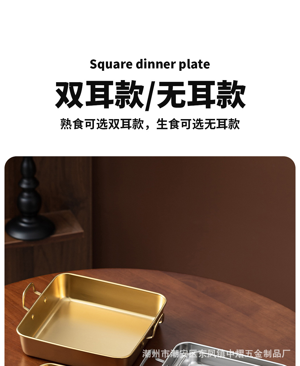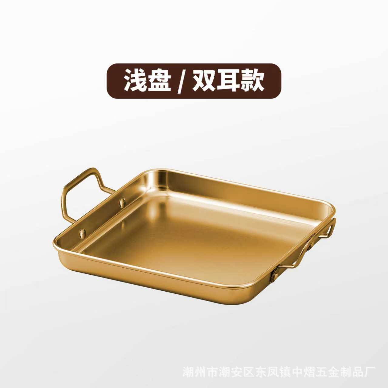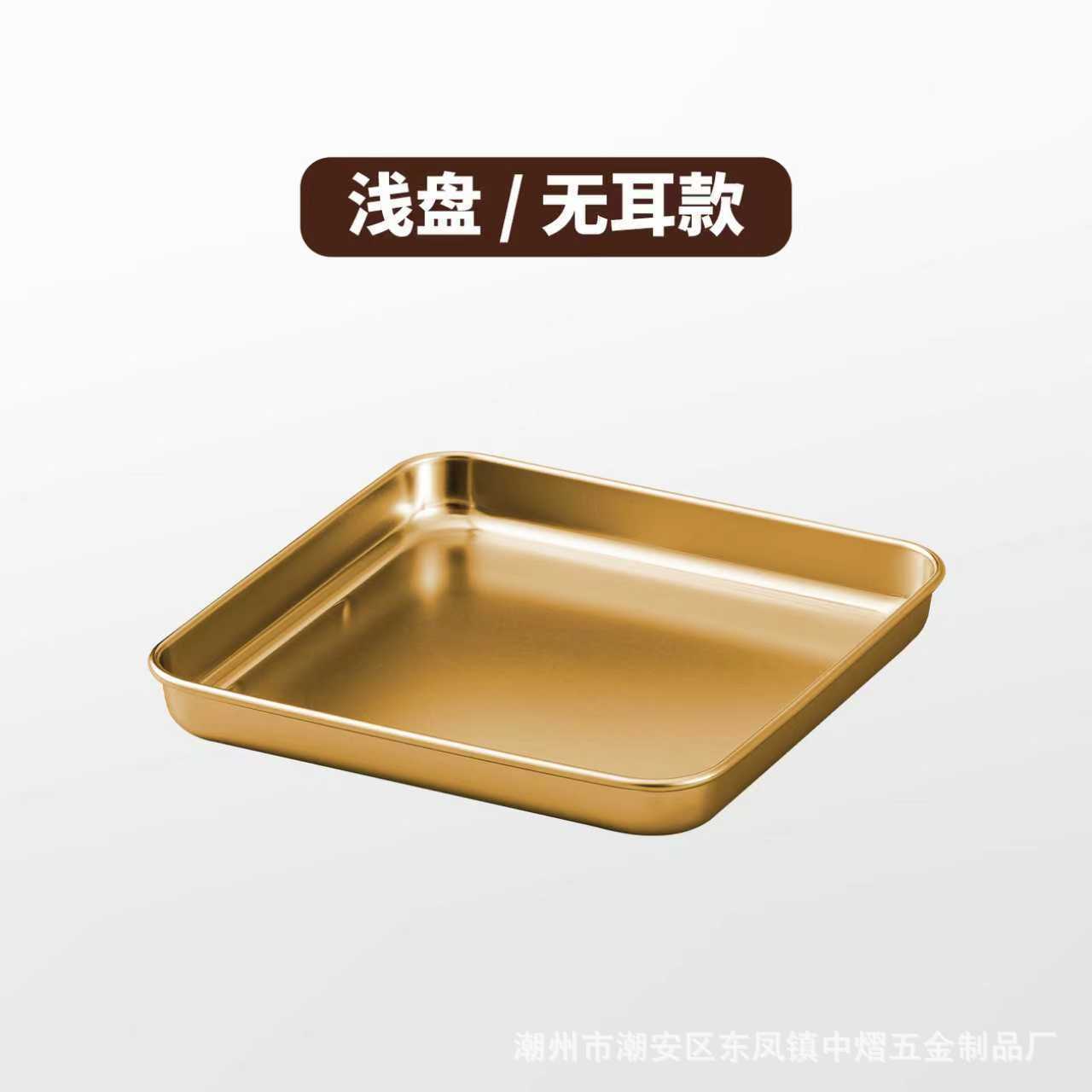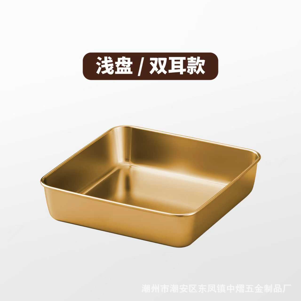 韩式金色带耳不锈钢正方形托盘提拉米苏盘户外烤肉盘小吃平底盘