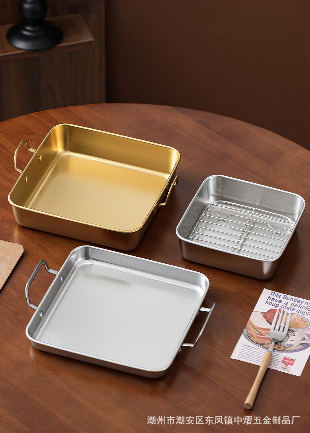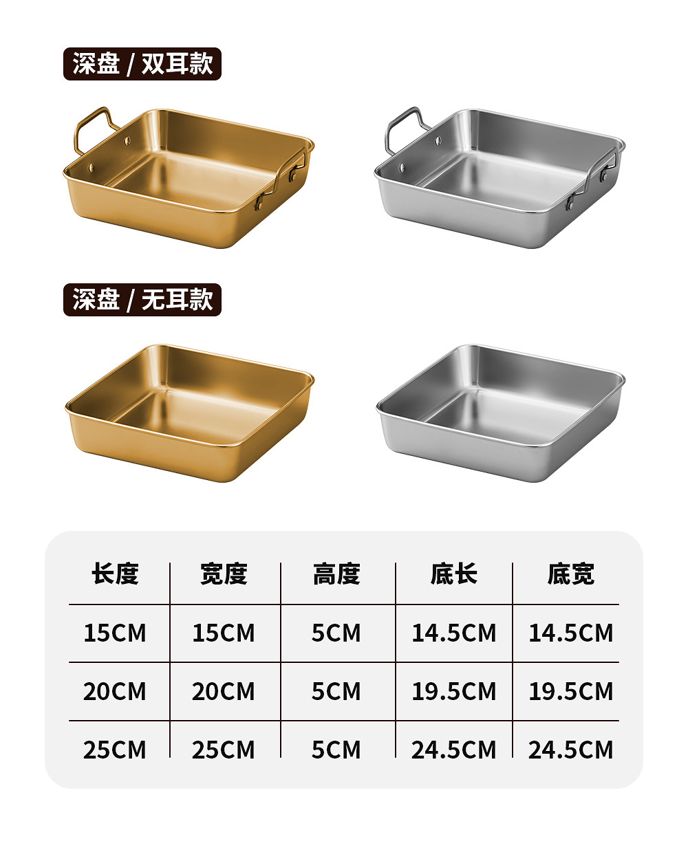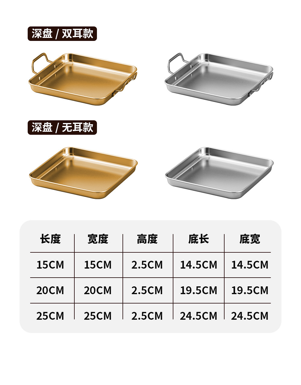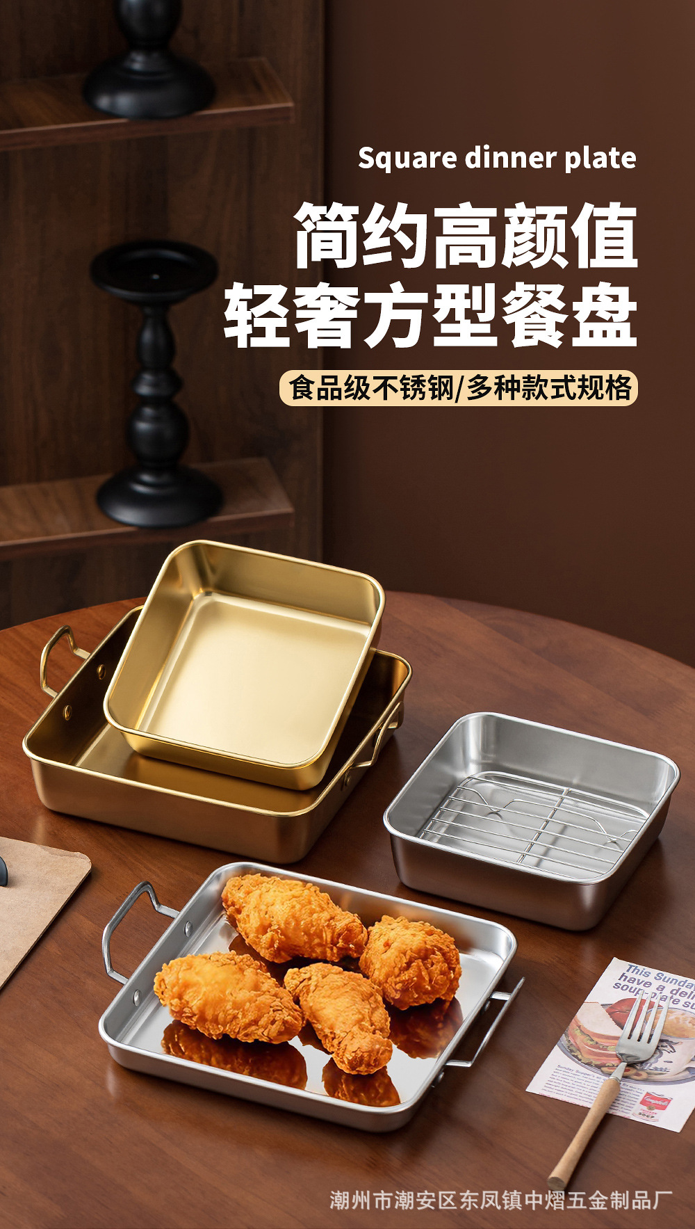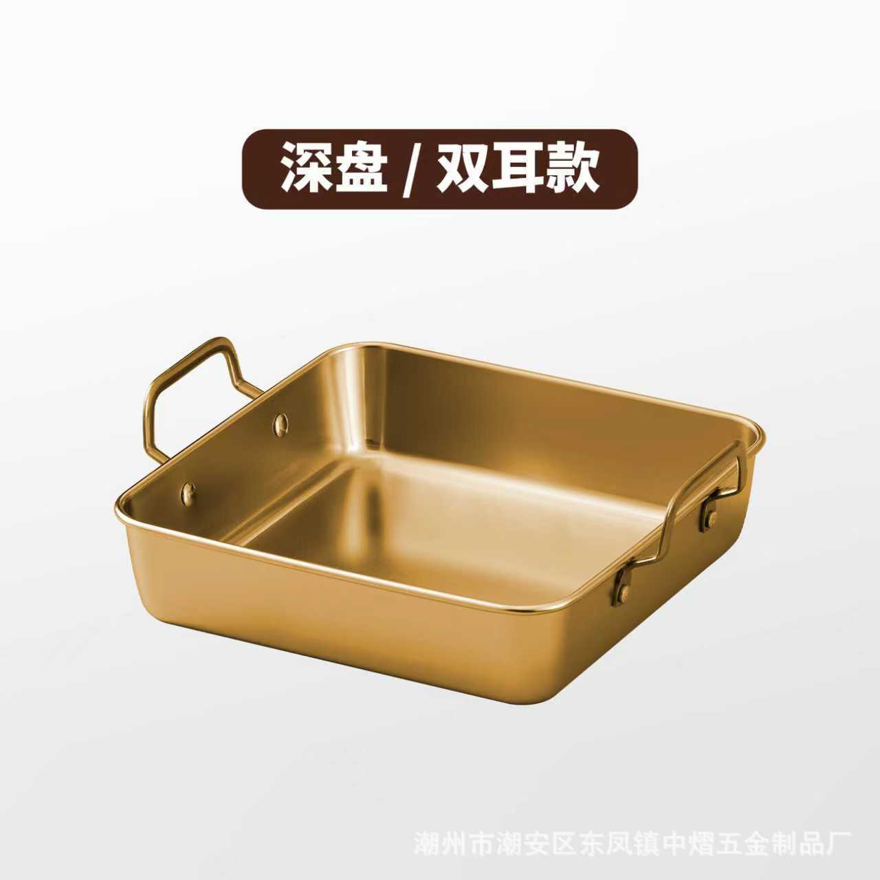 韩式金色带耳不锈钢正方形托盘提拉米苏盘户外烤肉盘小吃平底盘