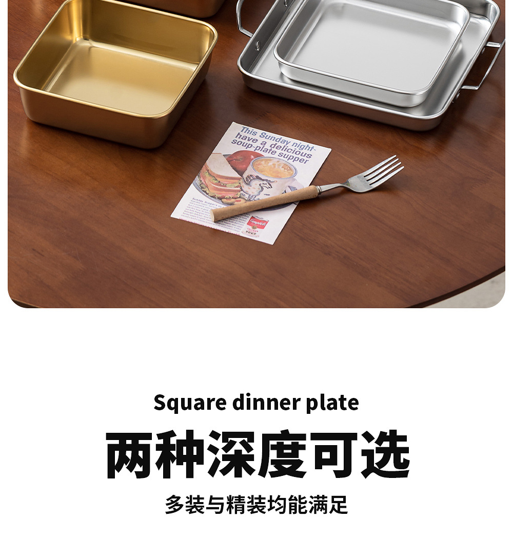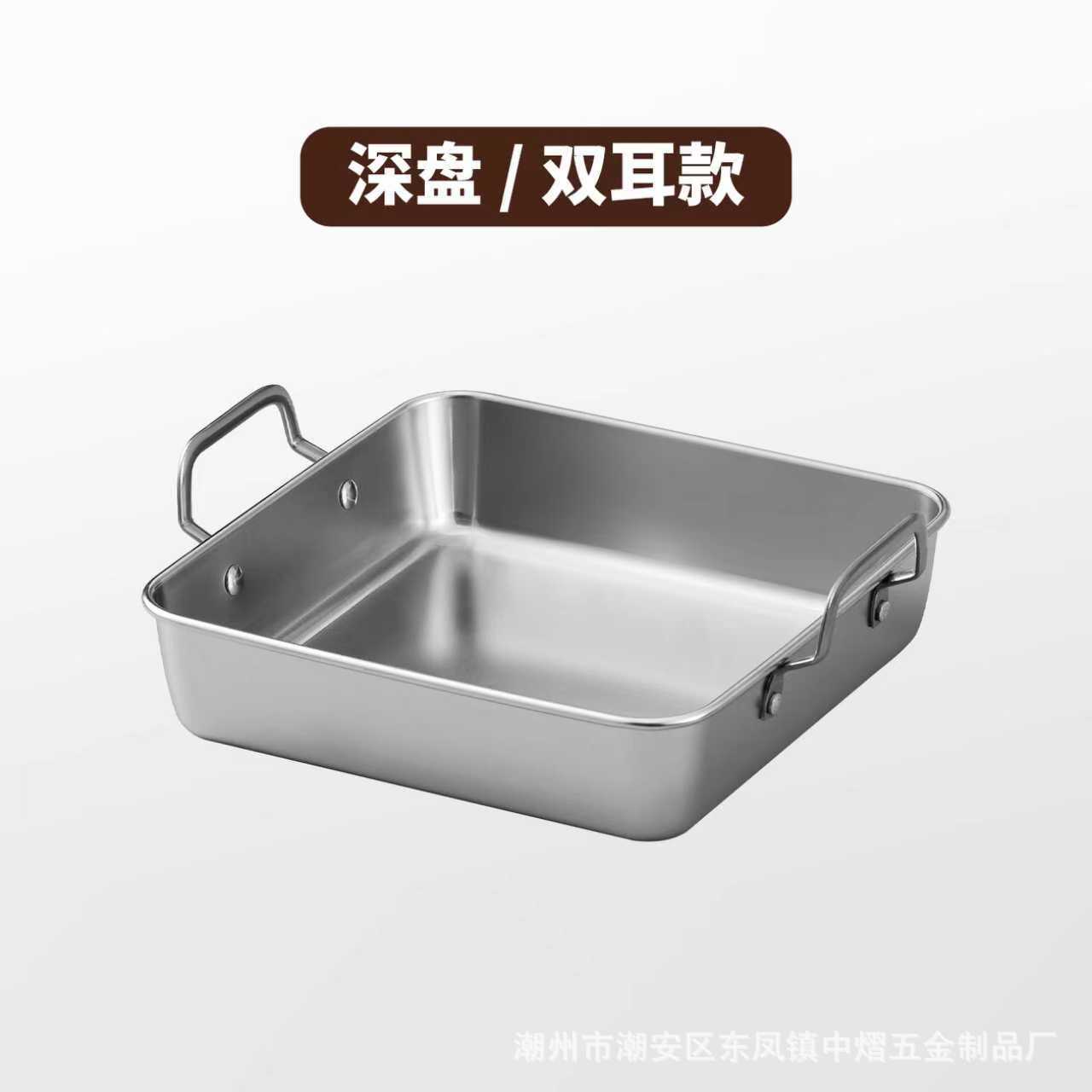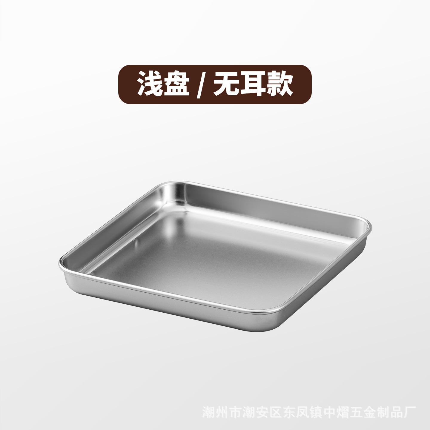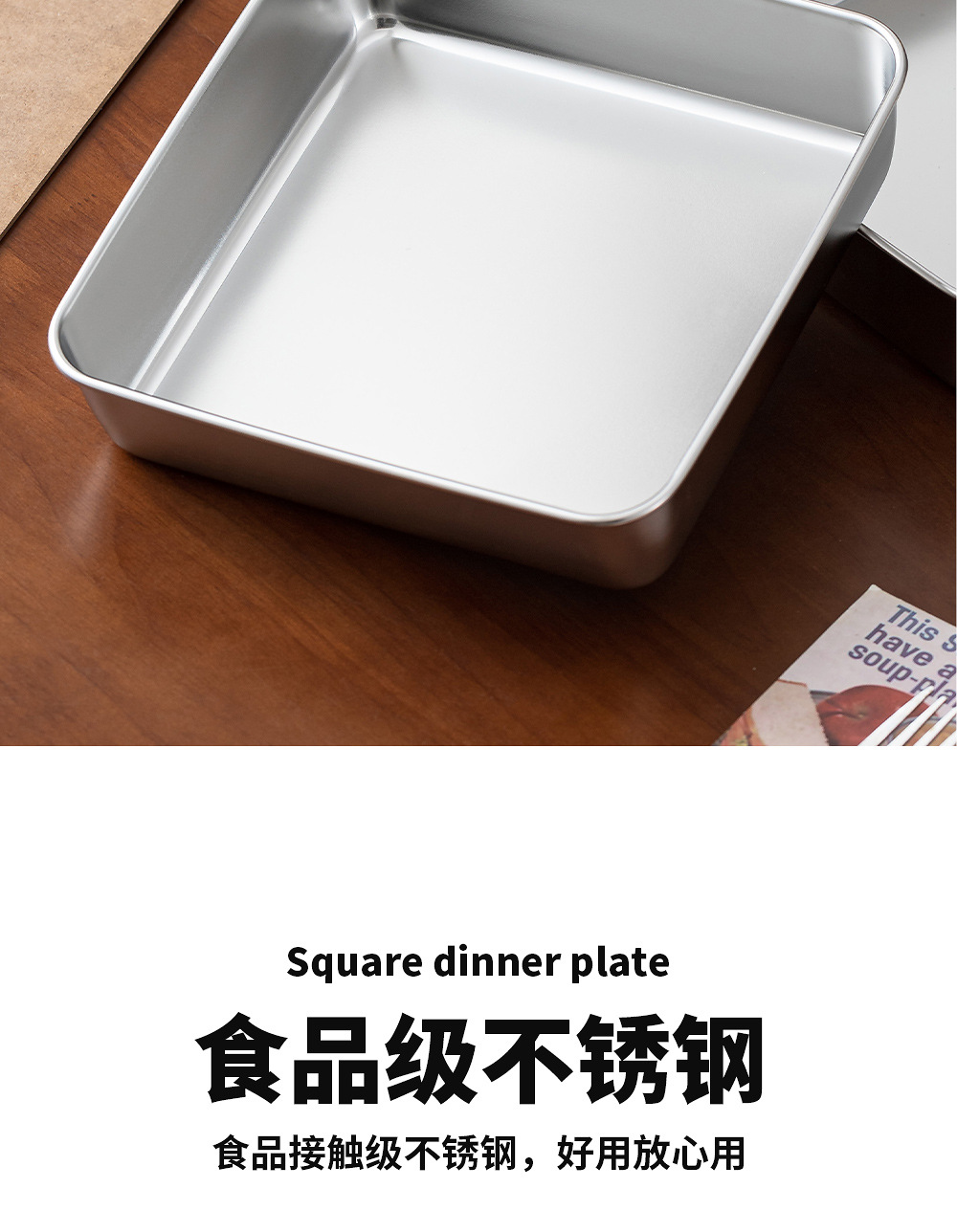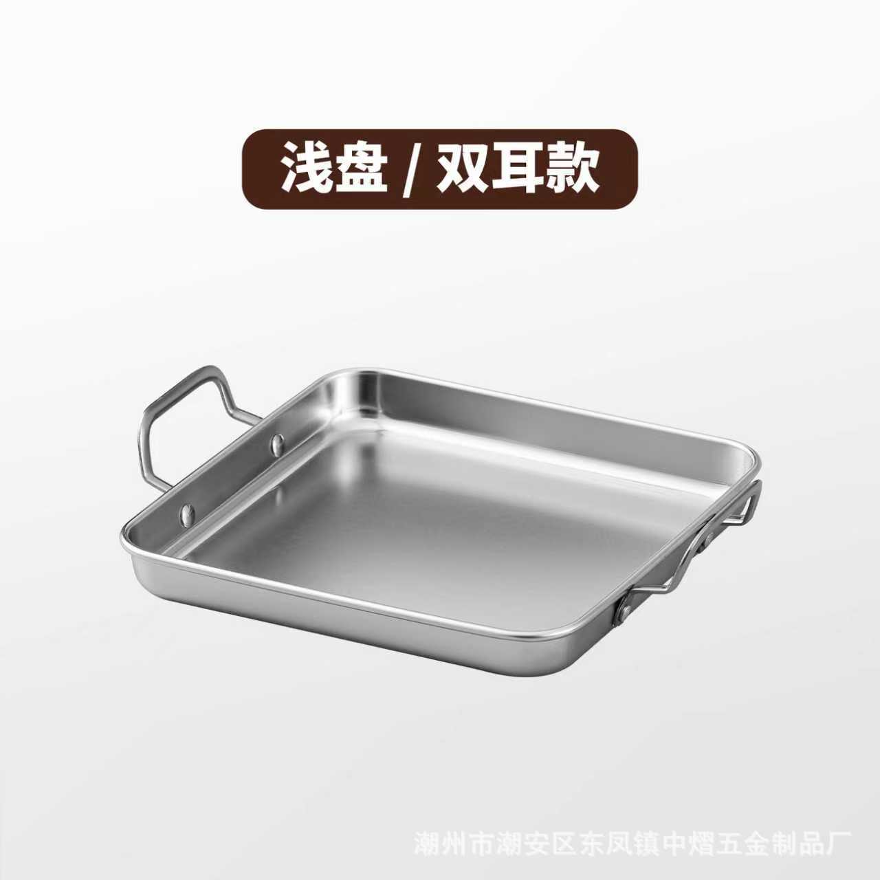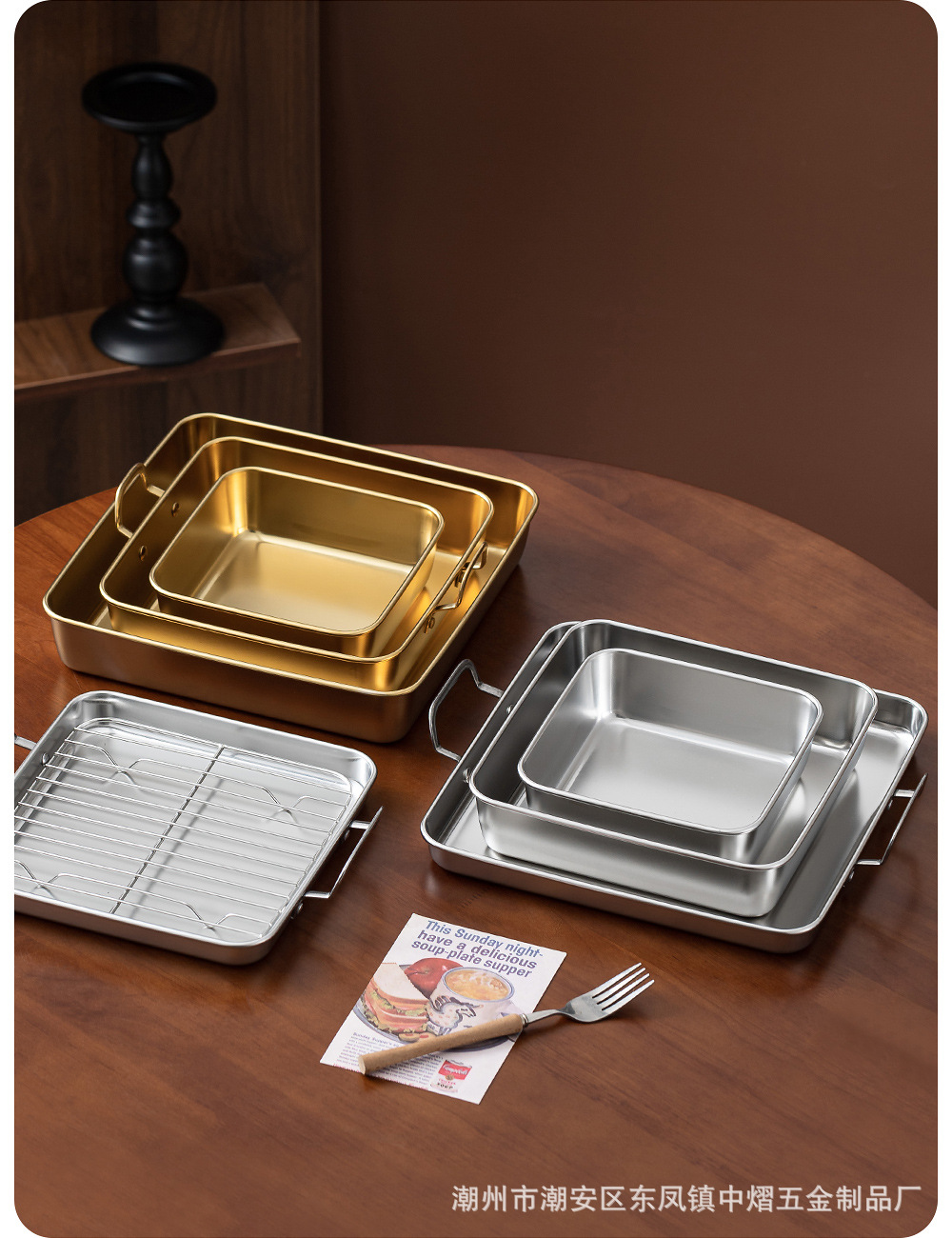 韩式金色带耳不锈钢正方形托盘提拉米苏盘户外烤肉盘小吃平底盘