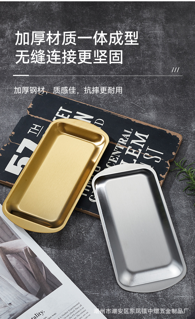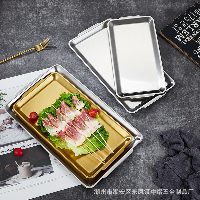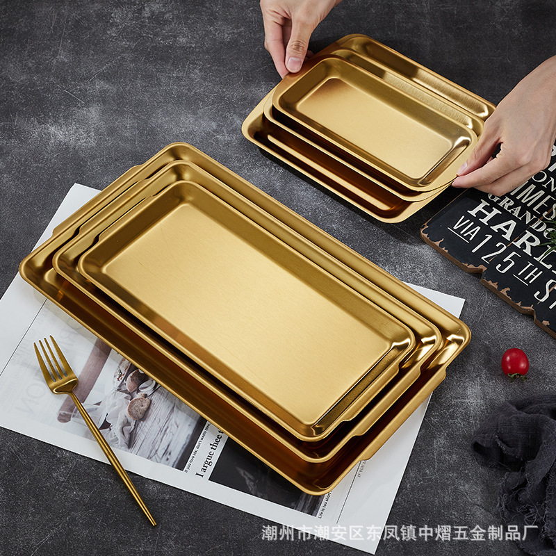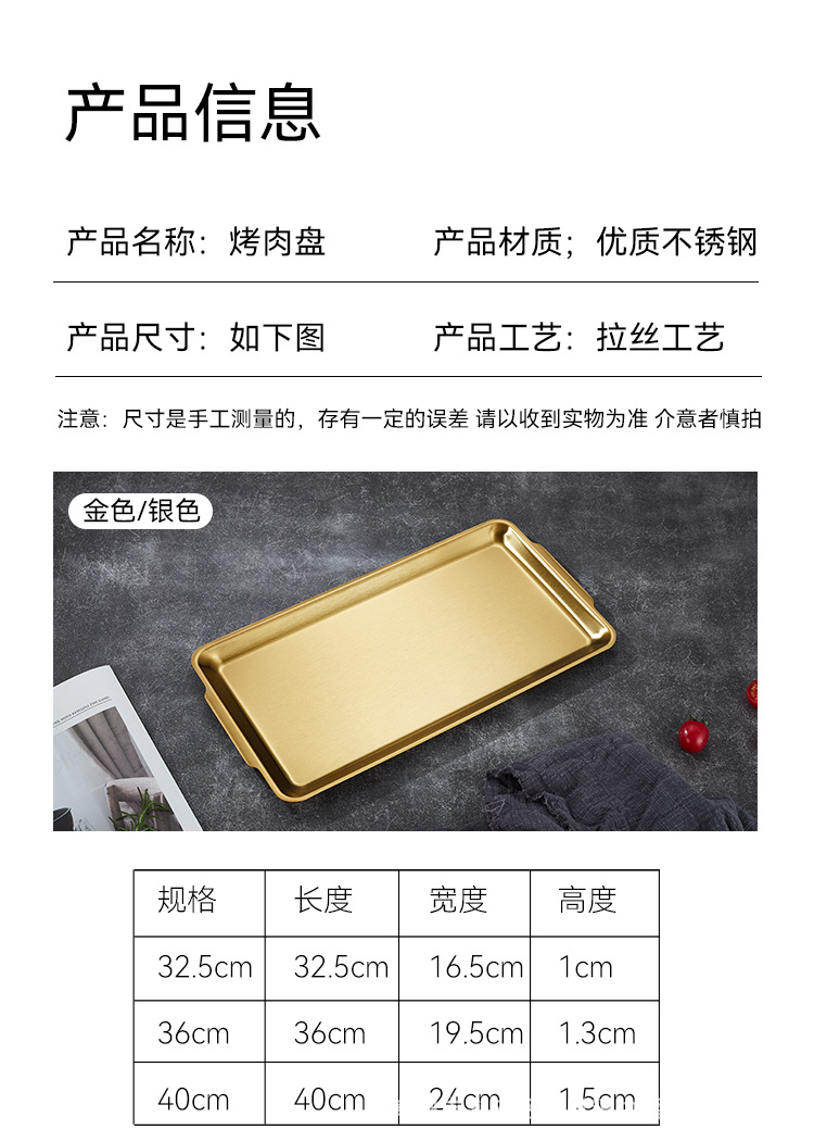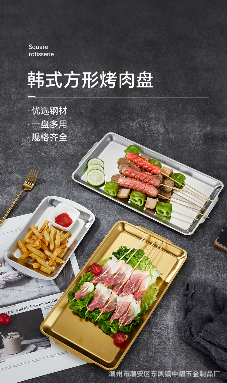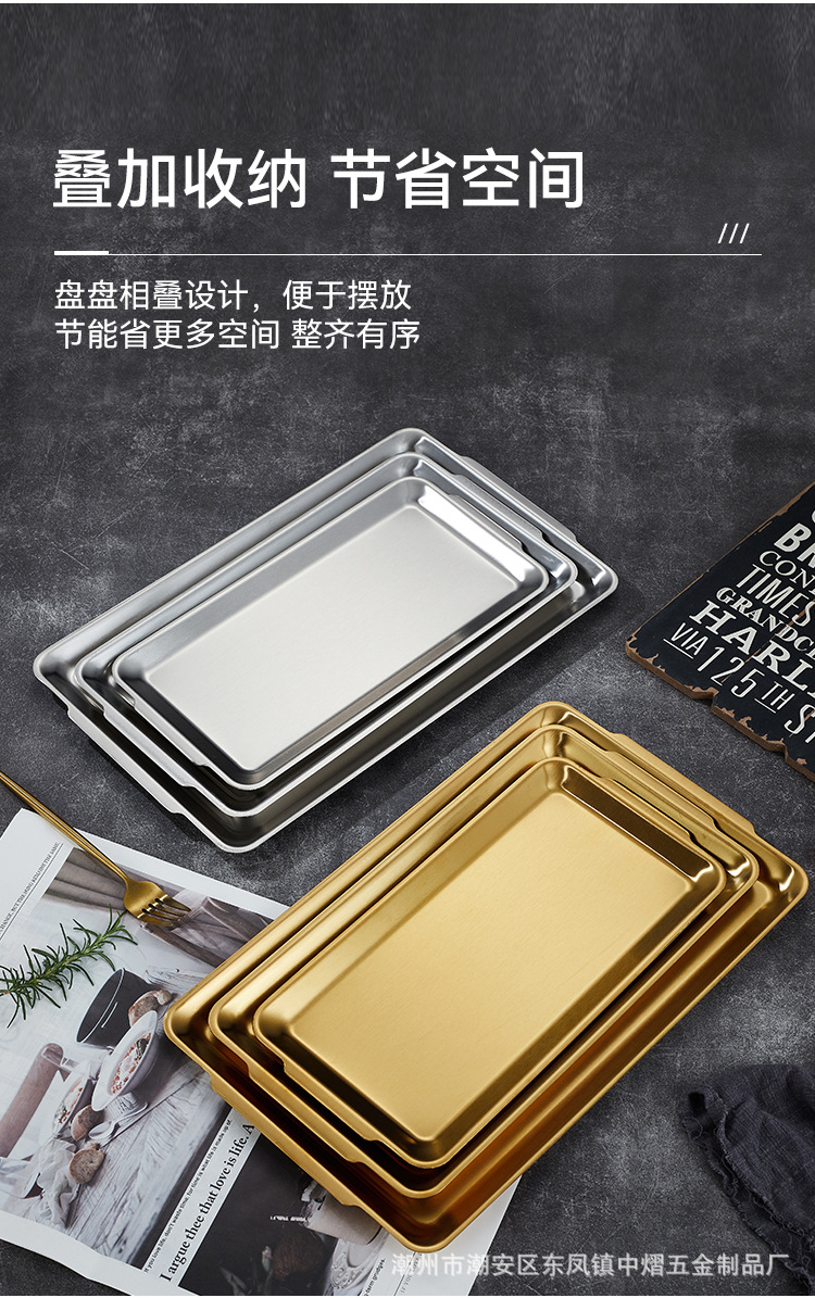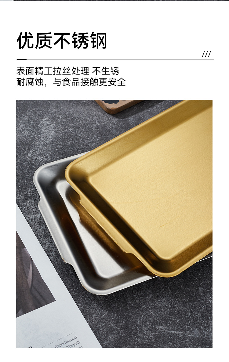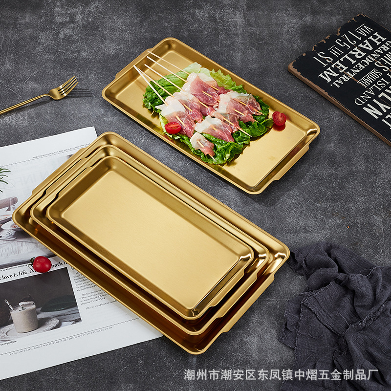 304不锈钢韩式烤肉盘长方形金色托盘酒店餐厅小吃甜品多用盘
