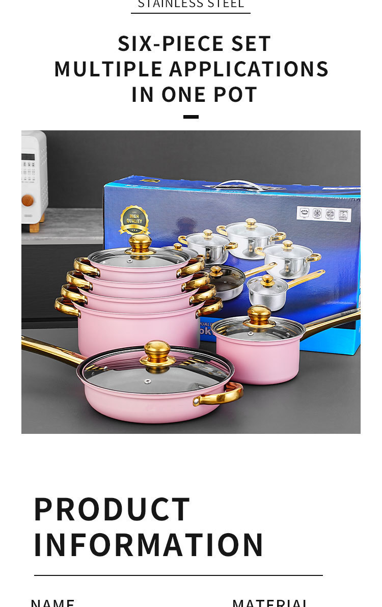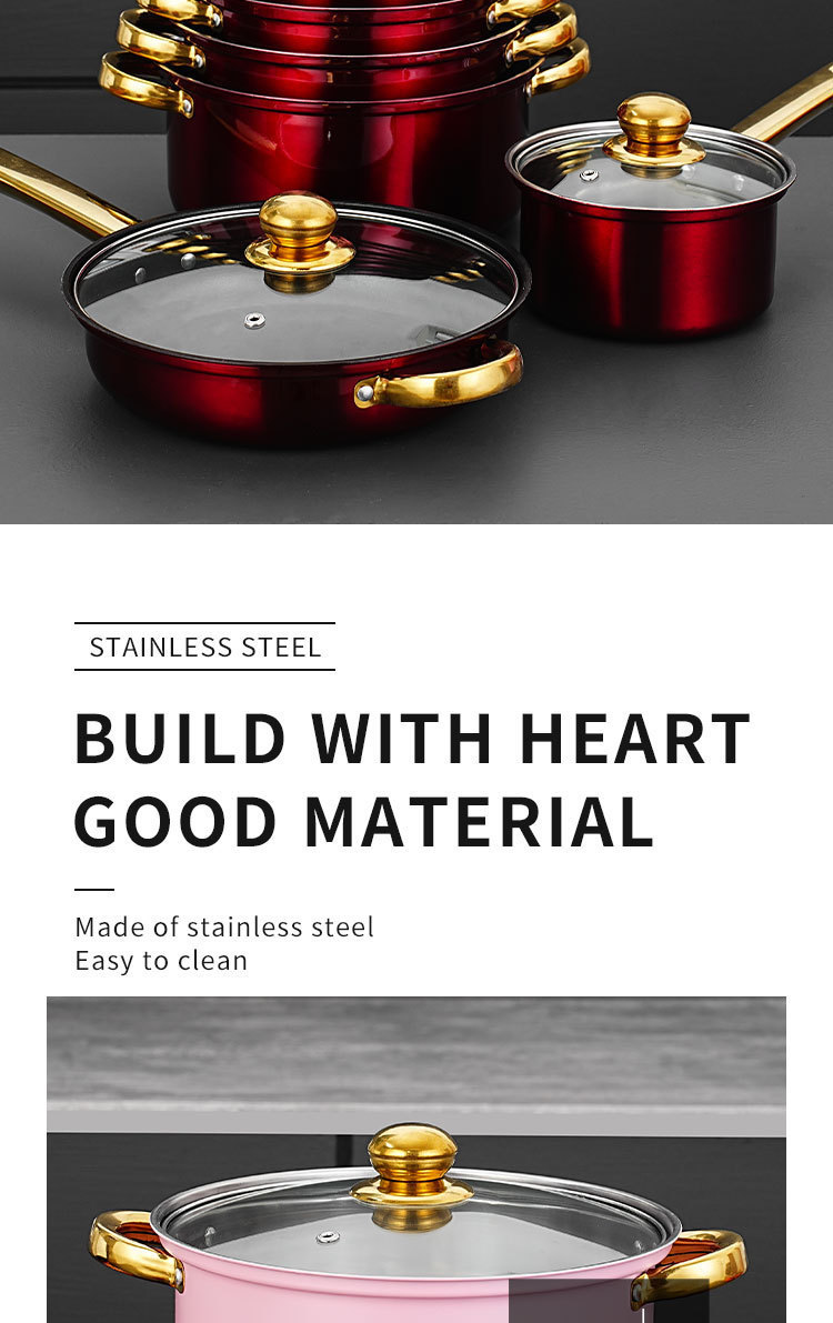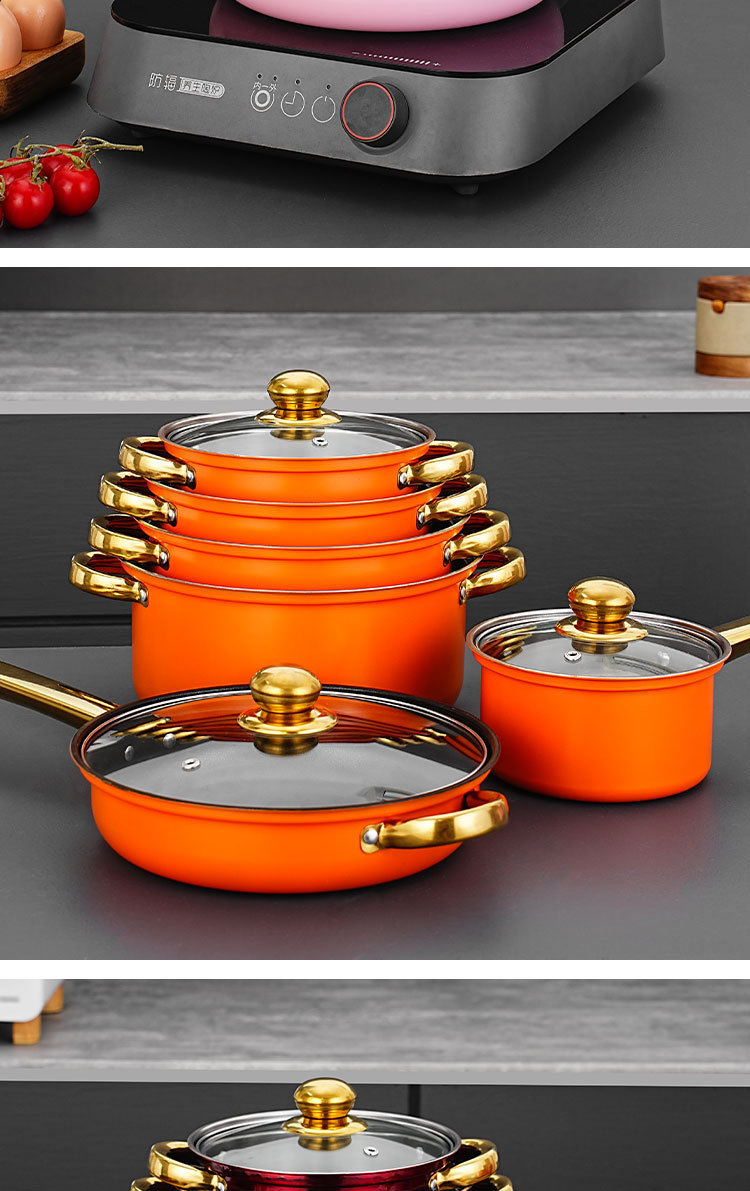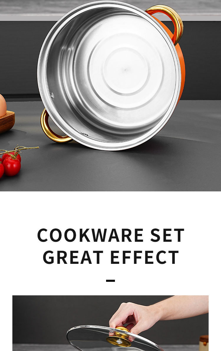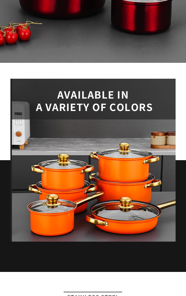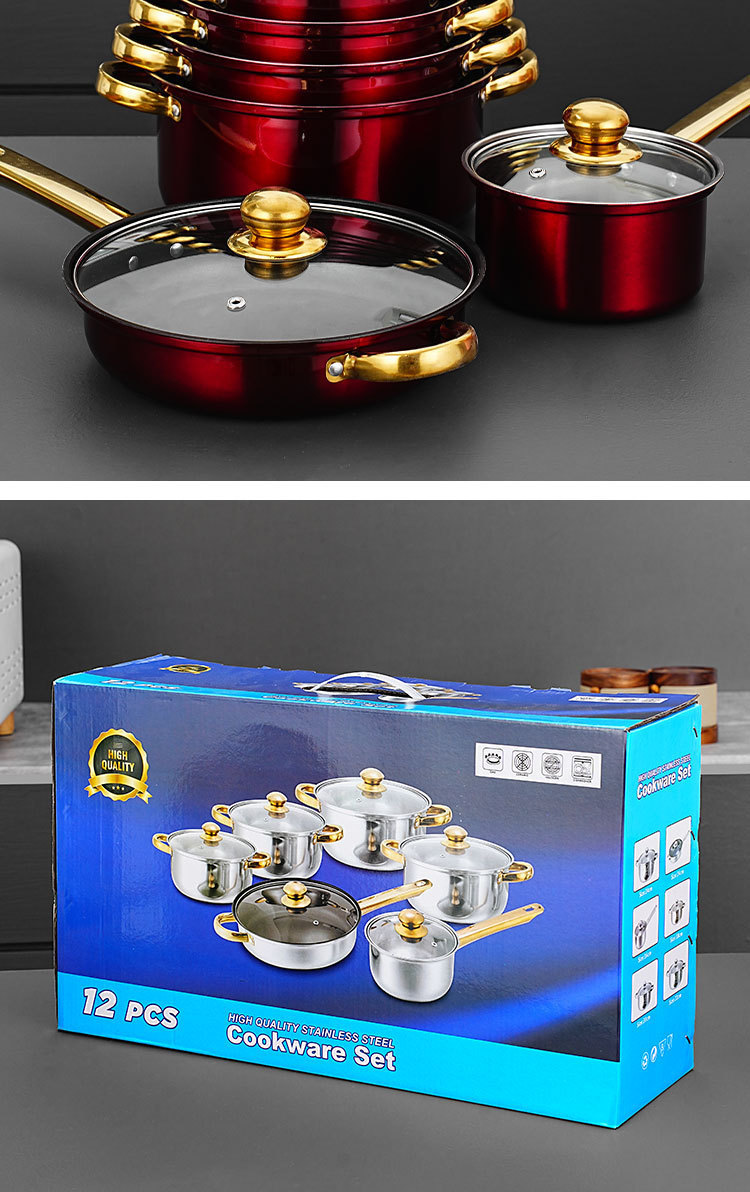 跨境专供不锈钢12件金色锅具套装汤锅煎锅奶锅cooking pot set