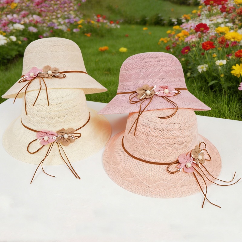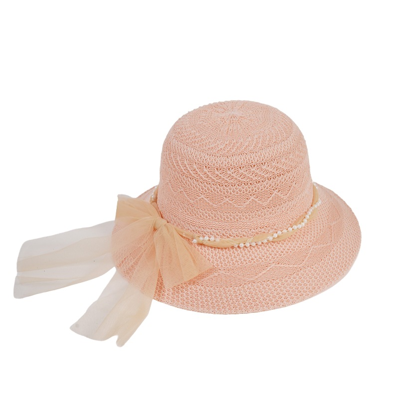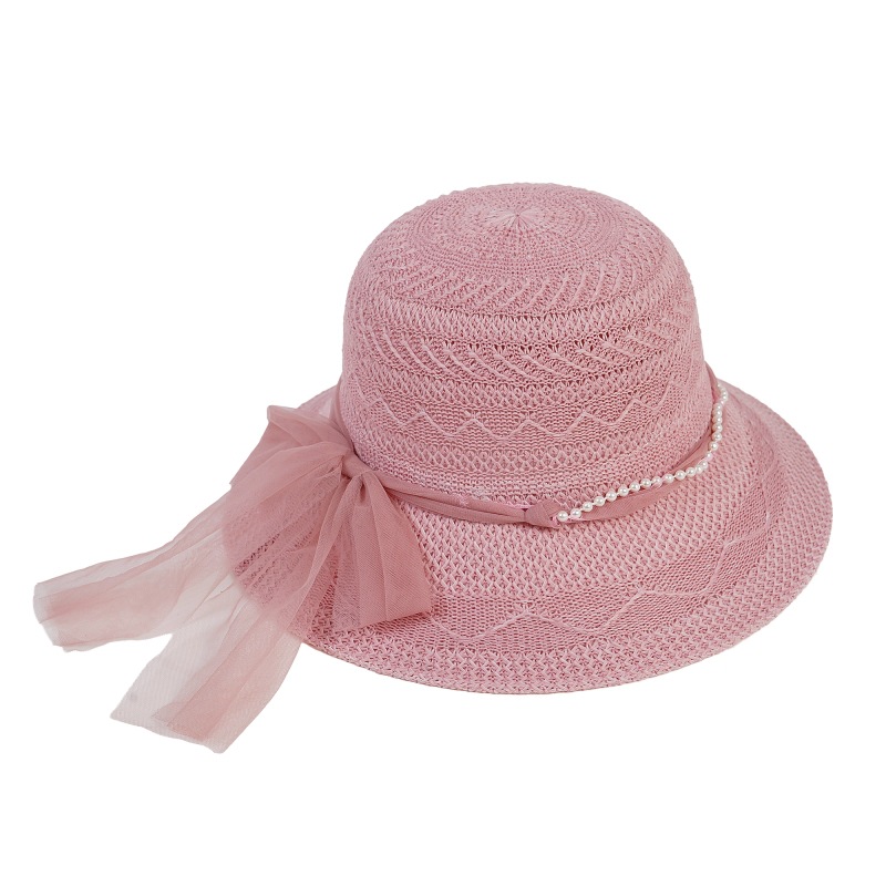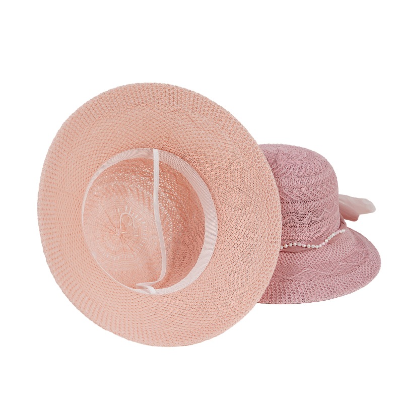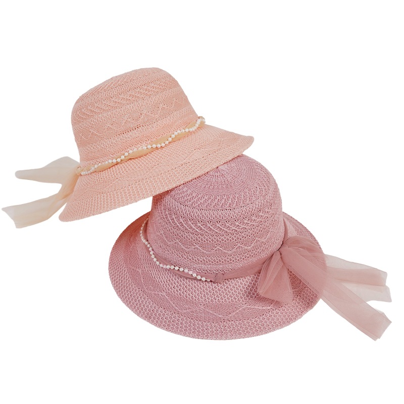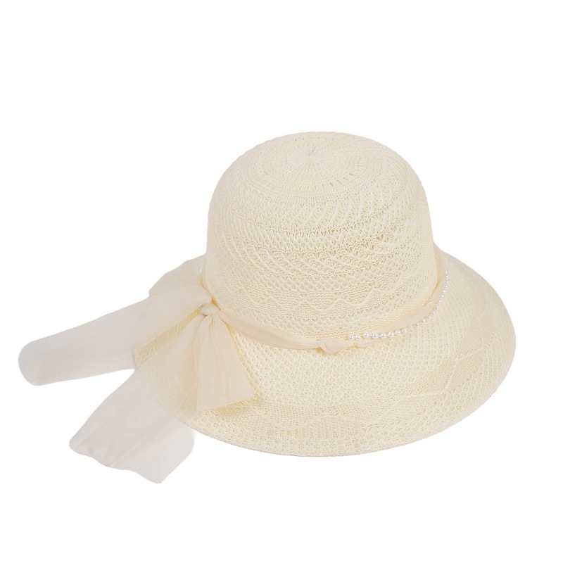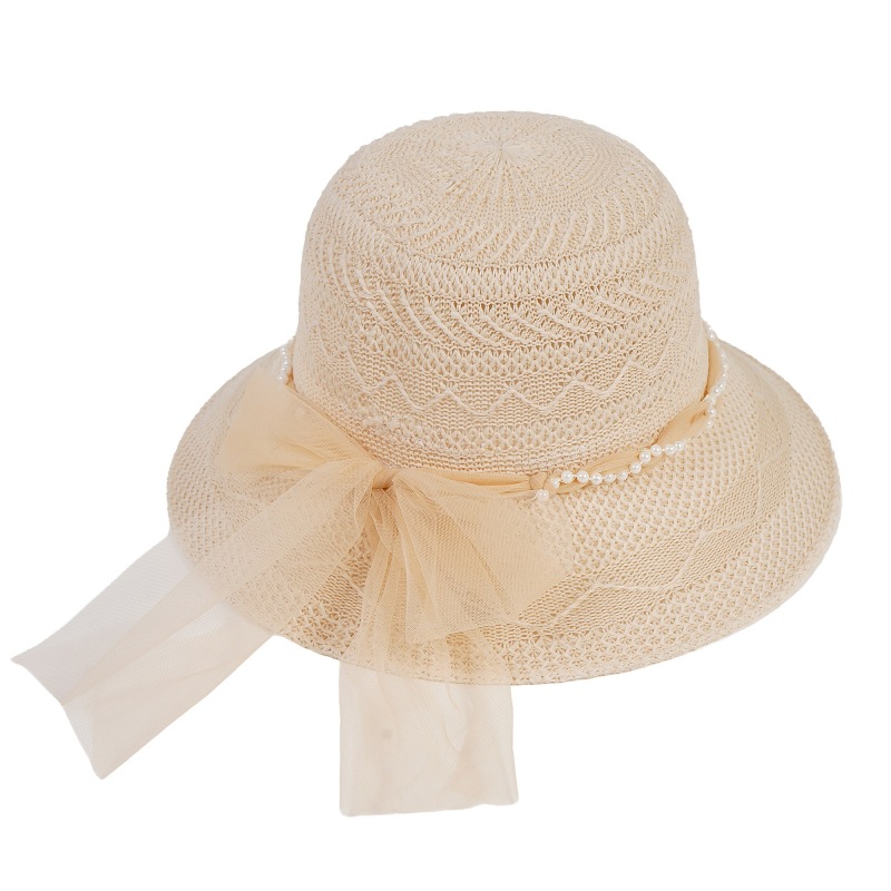 遮阳帽女士夏季新款珍珠网纱太阳帽蝴蝶结防晒草帽女礼品妈妈帽