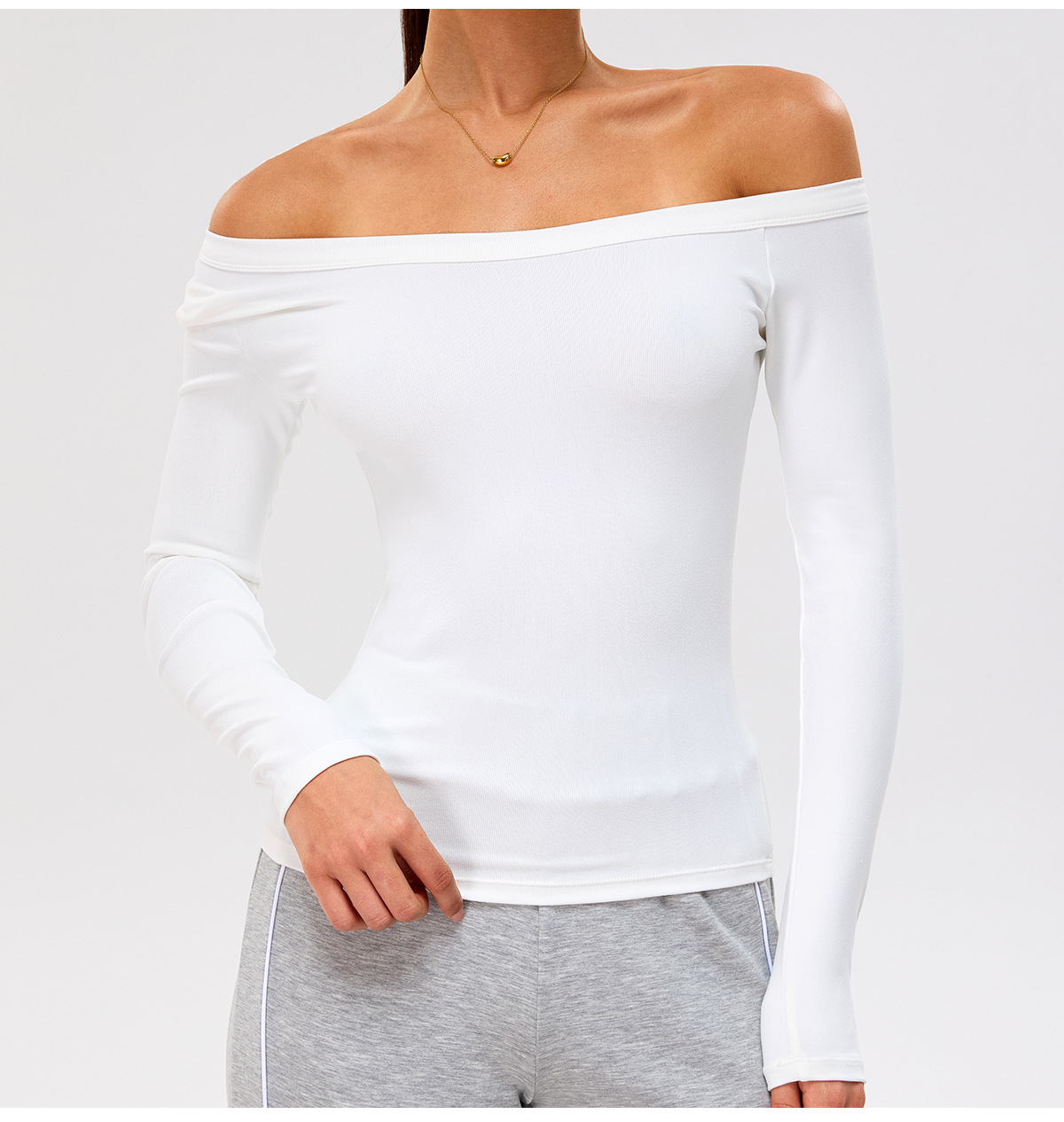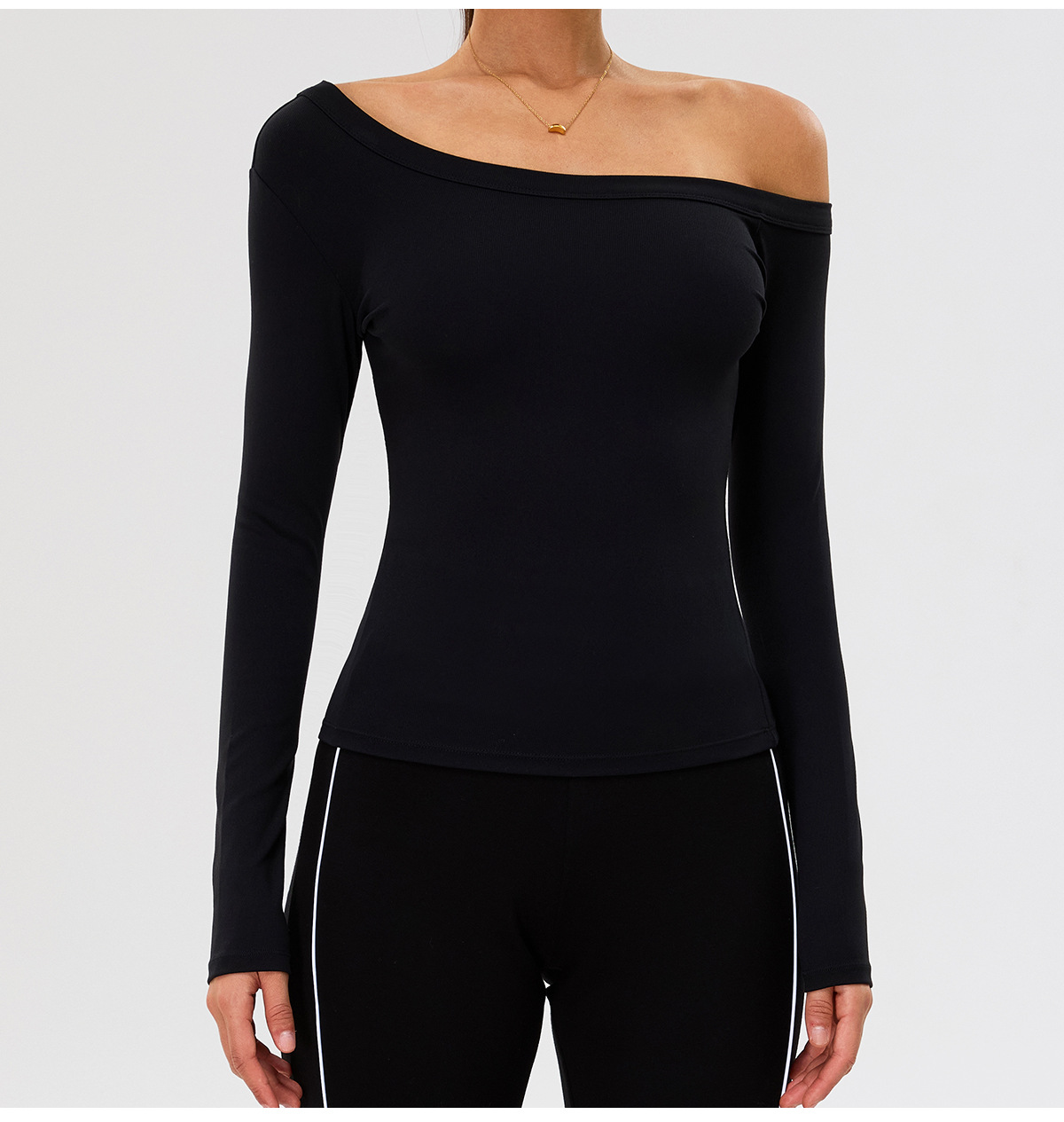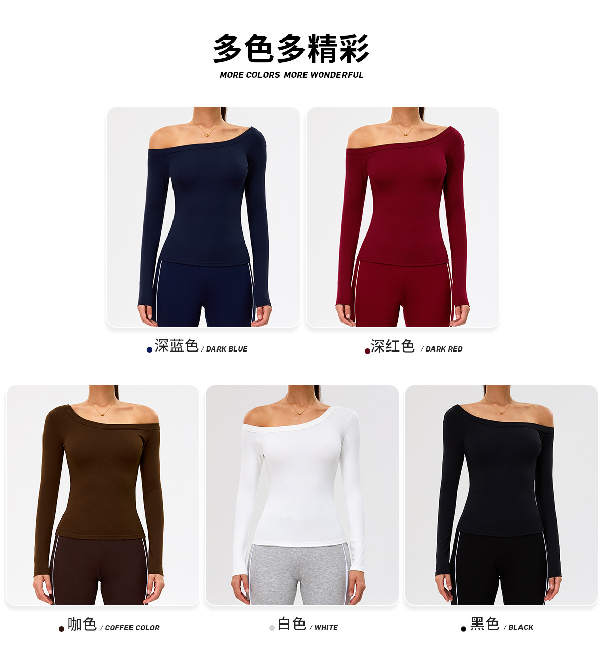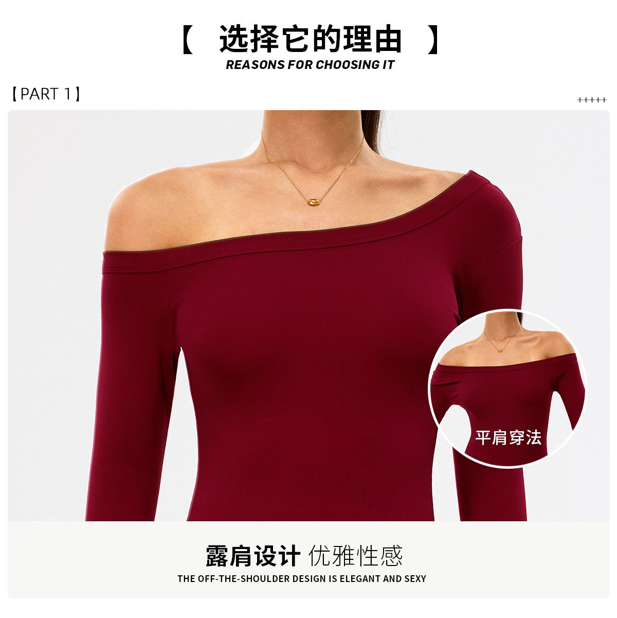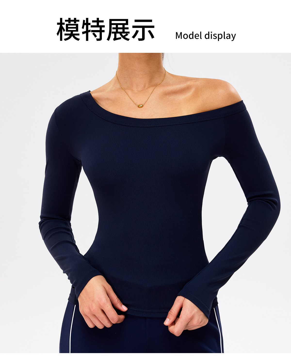 欧美裸感紧身运动长袖T恤女一字领瑜伽服户外跑步速干健身服上衣