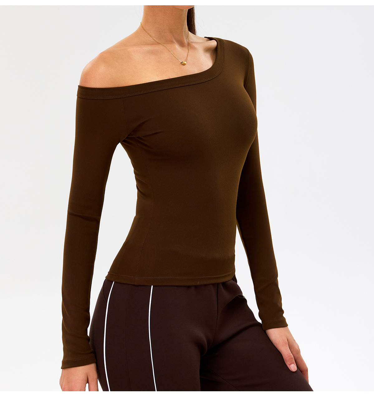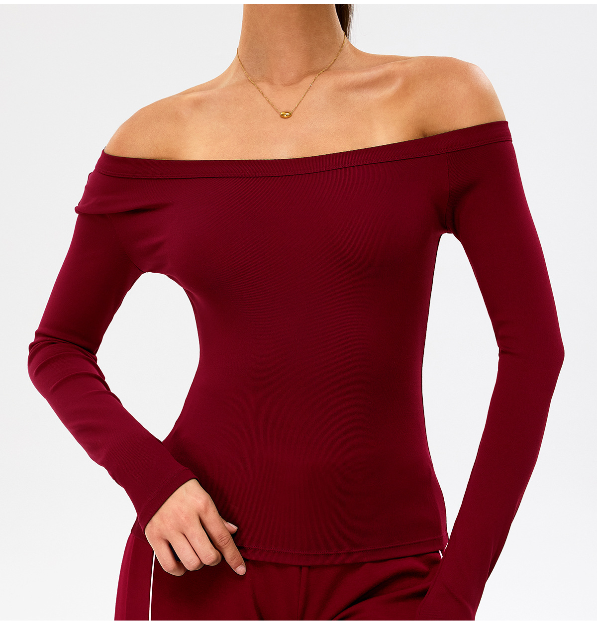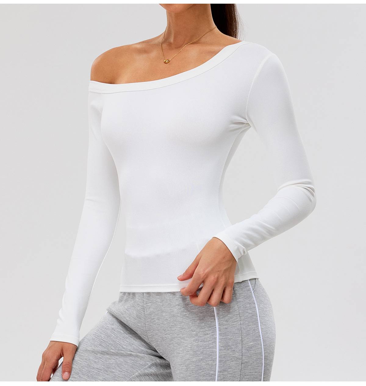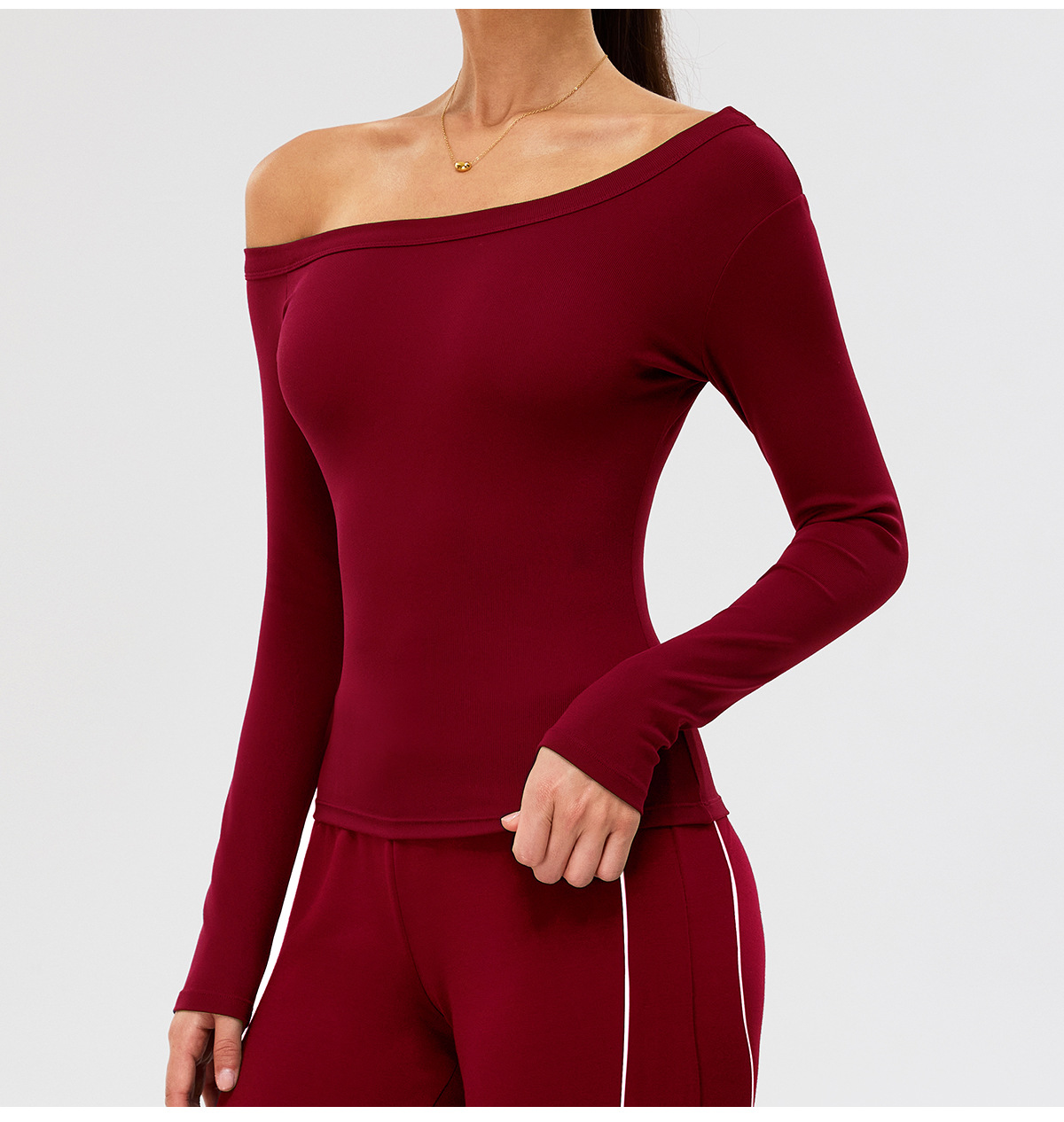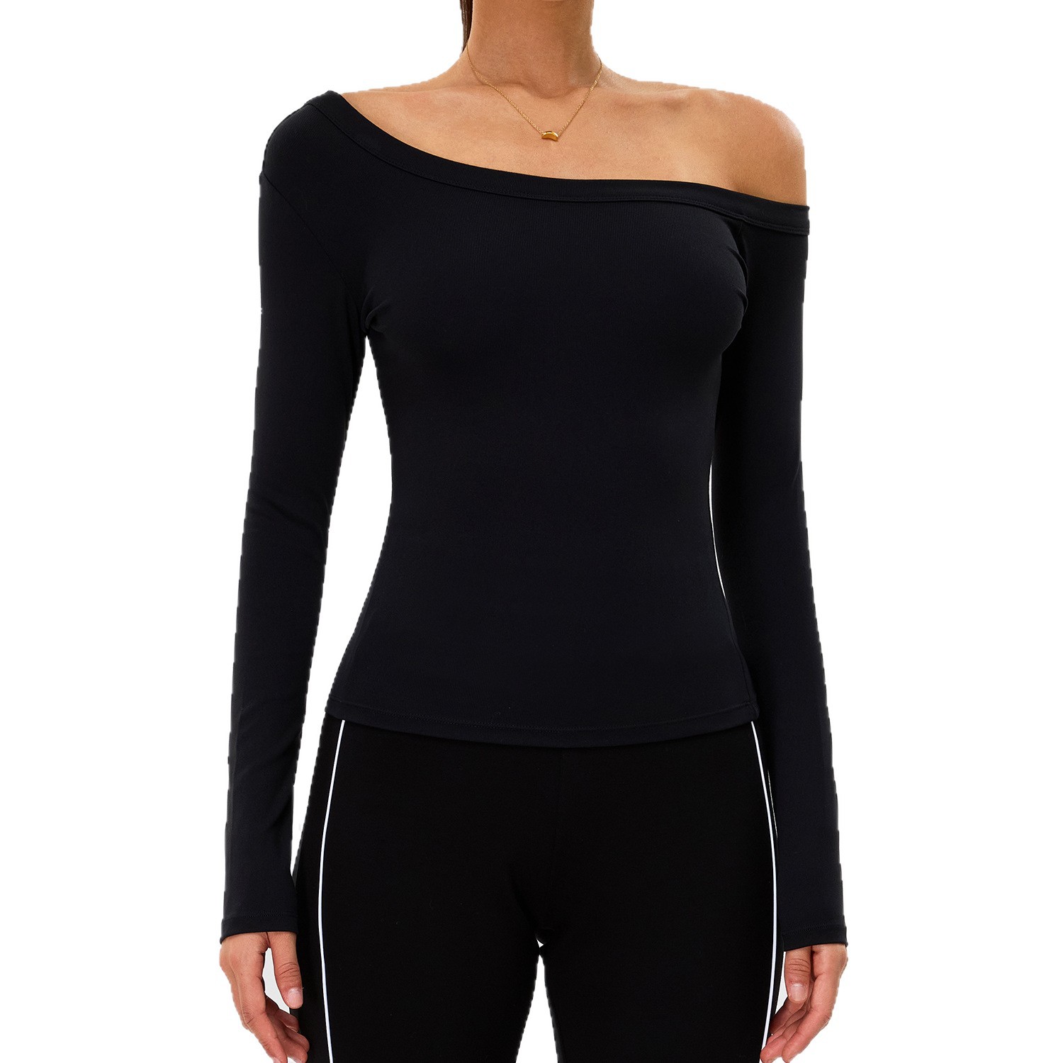 欧美裸感紧身运动长袖T恤女一字领瑜伽服户外跑步速干健身服上衣