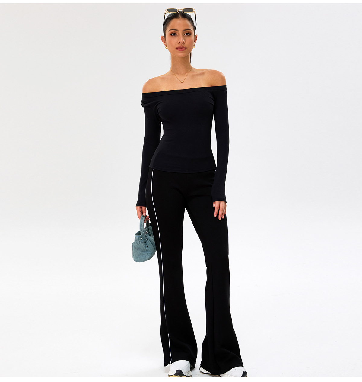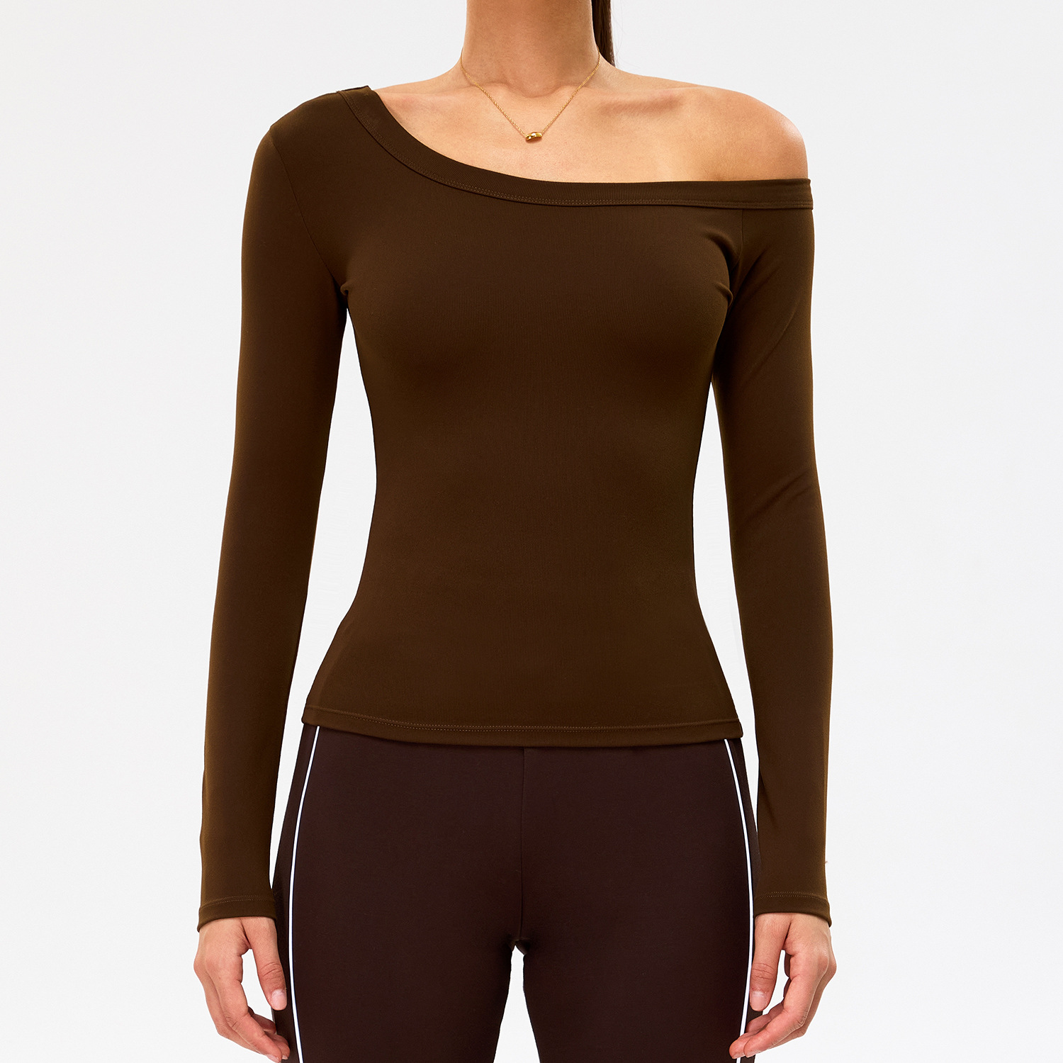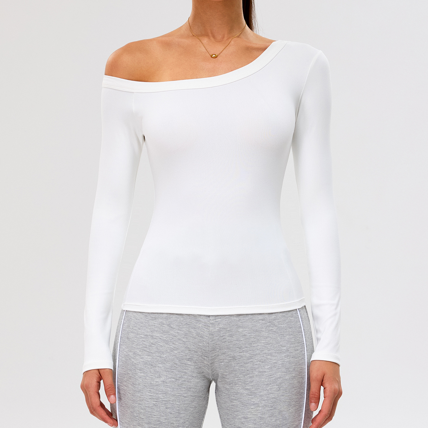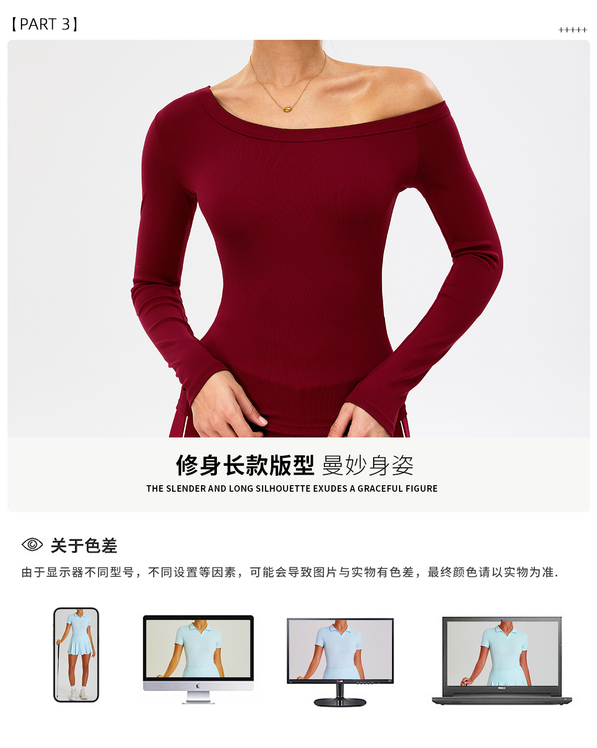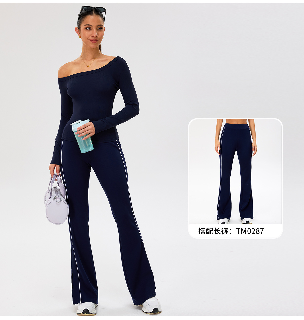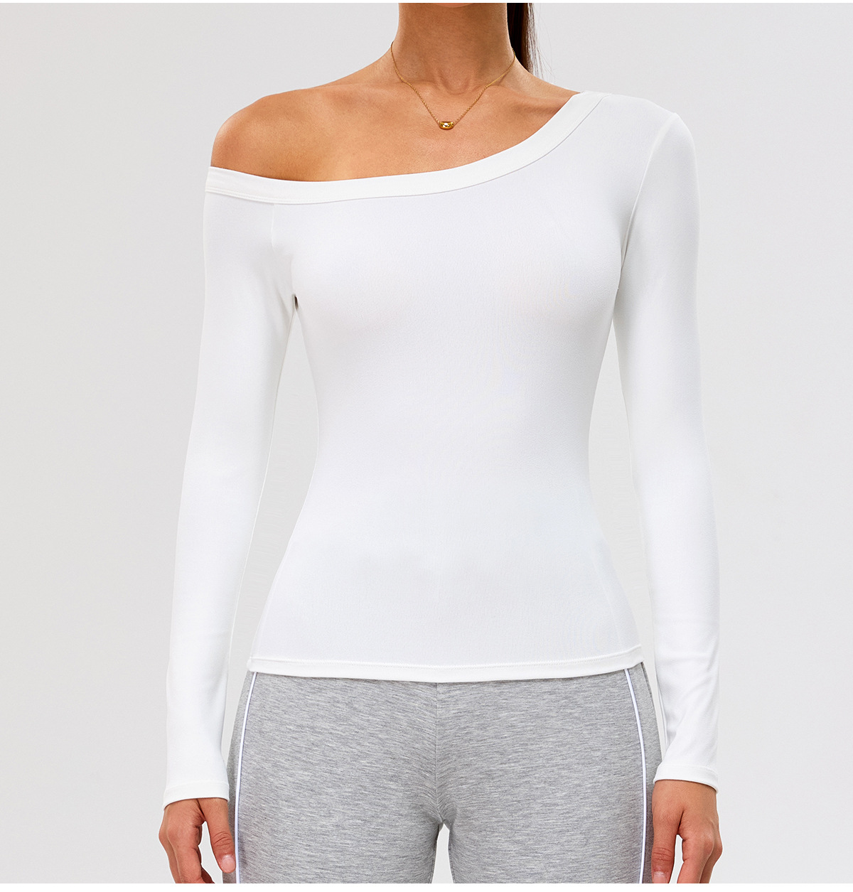 欧美裸感紧身运动长袖T恤女一字领瑜伽服户外跑步速干健身服上衣
