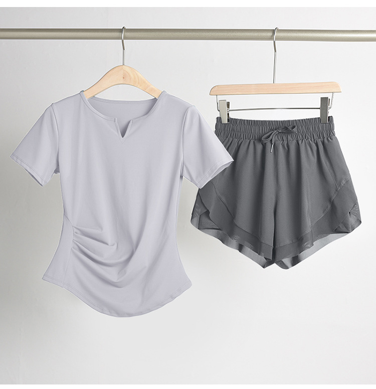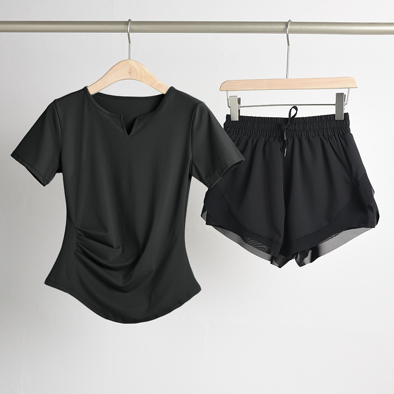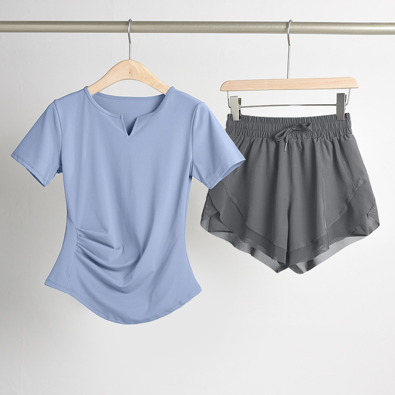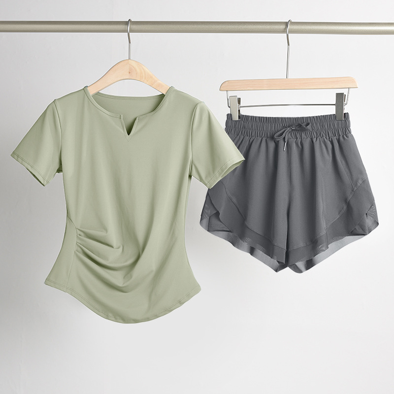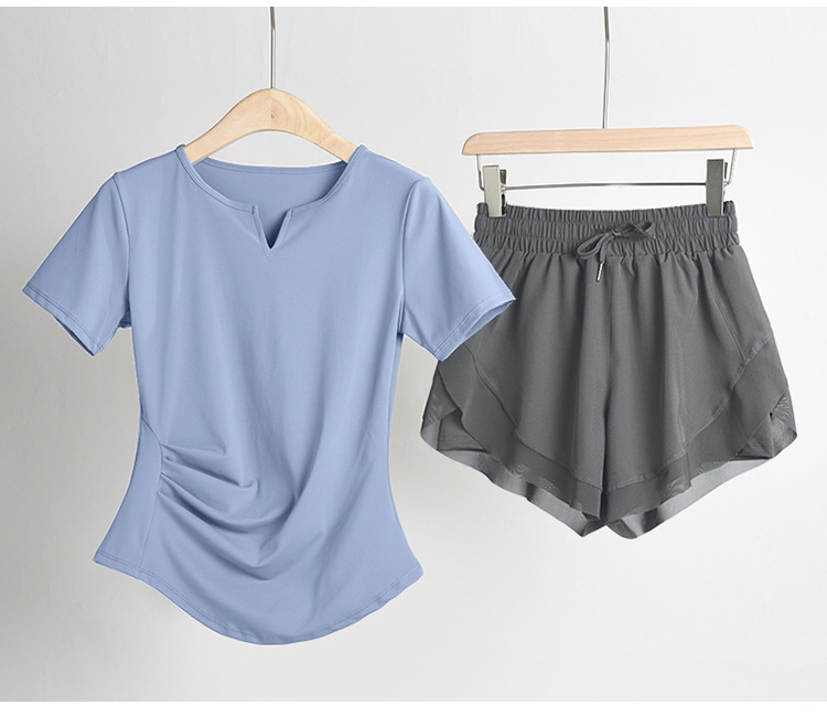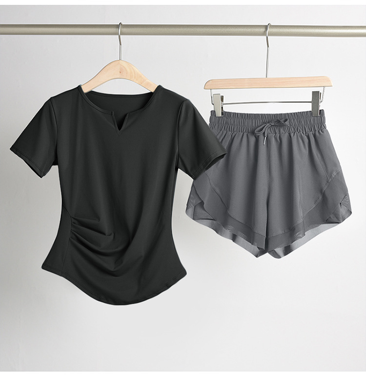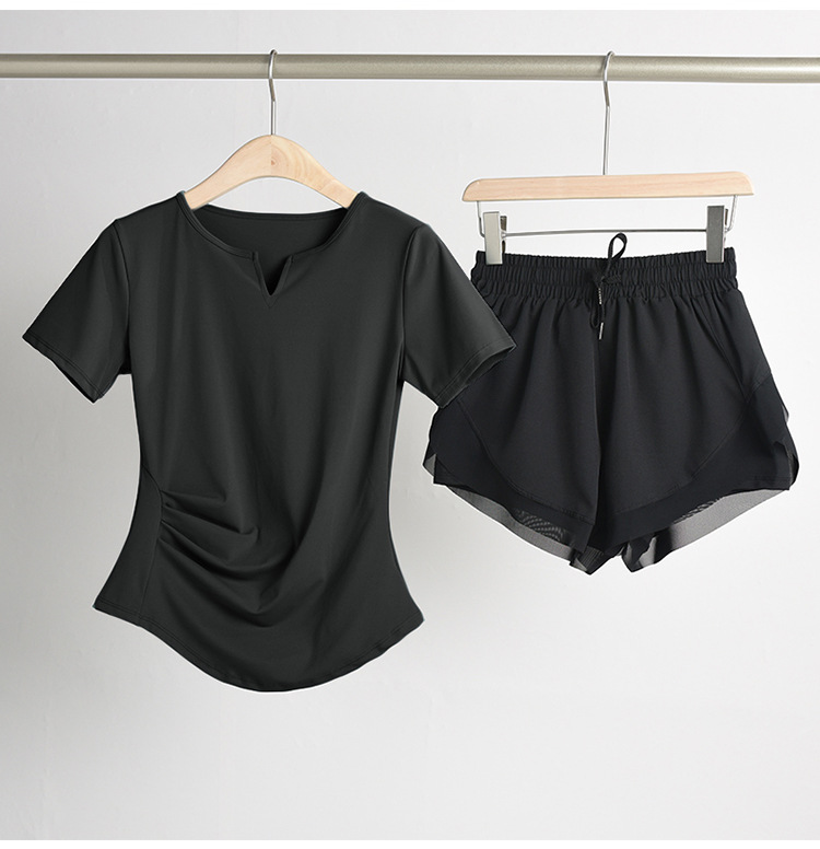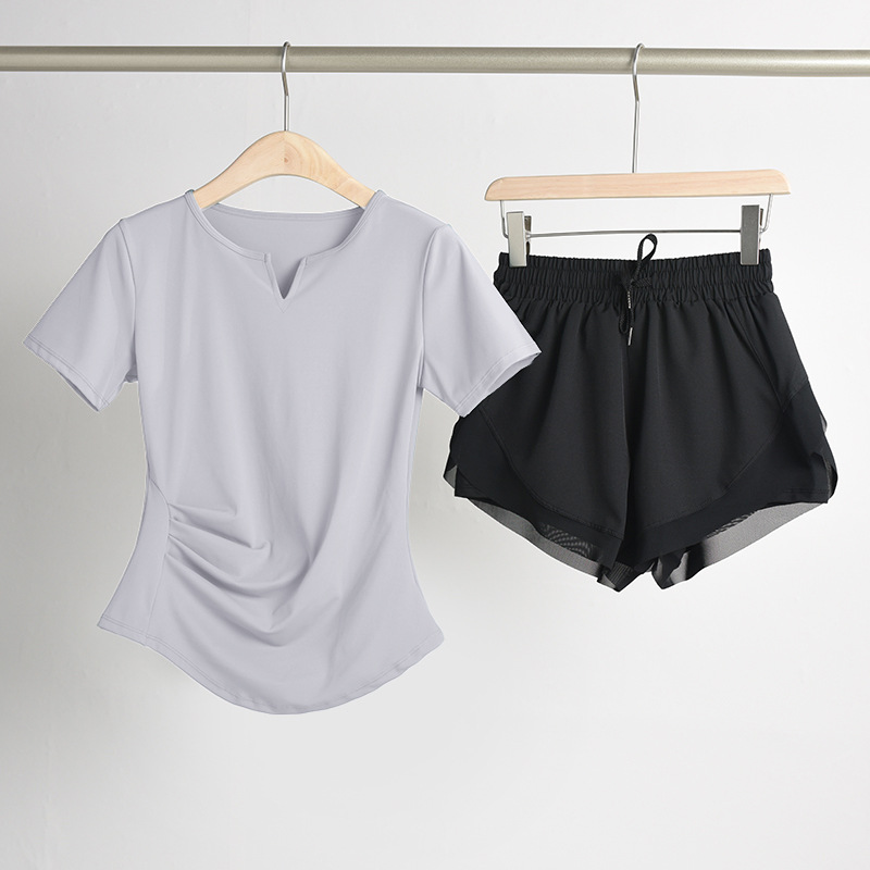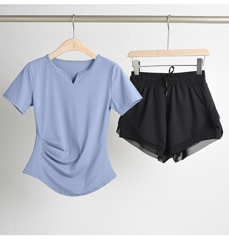 收腰瑜伽服女跑步运动上衣显瘦v领短袖t恤速干透气健身服套装夏