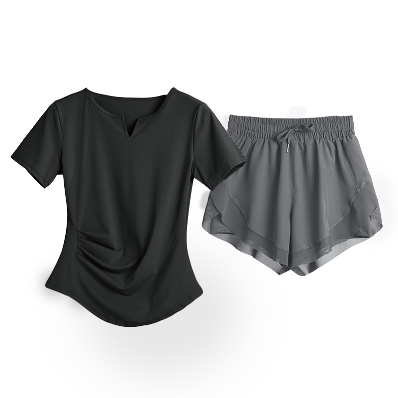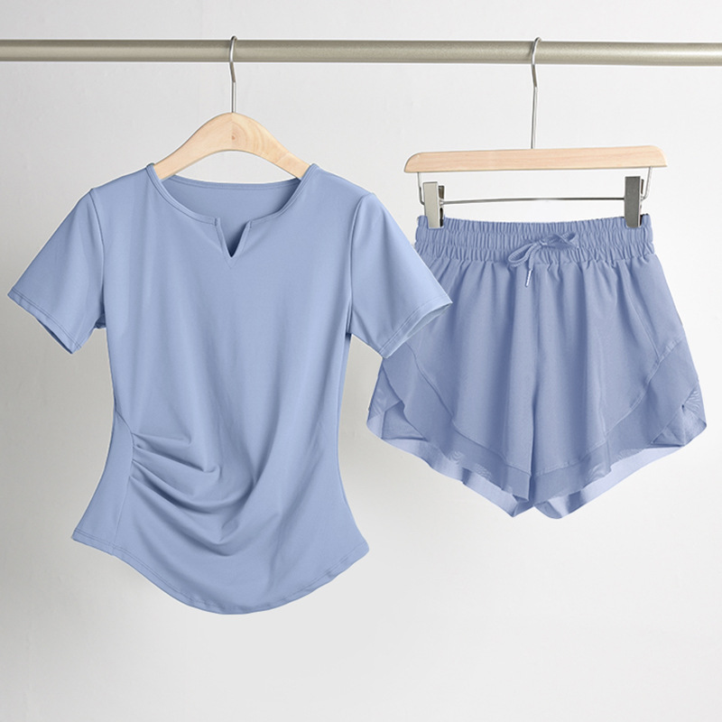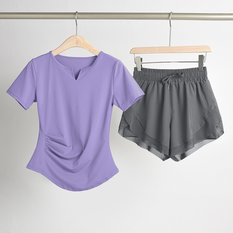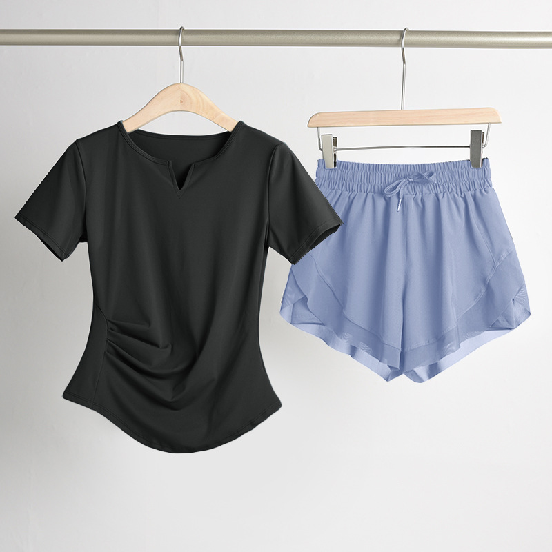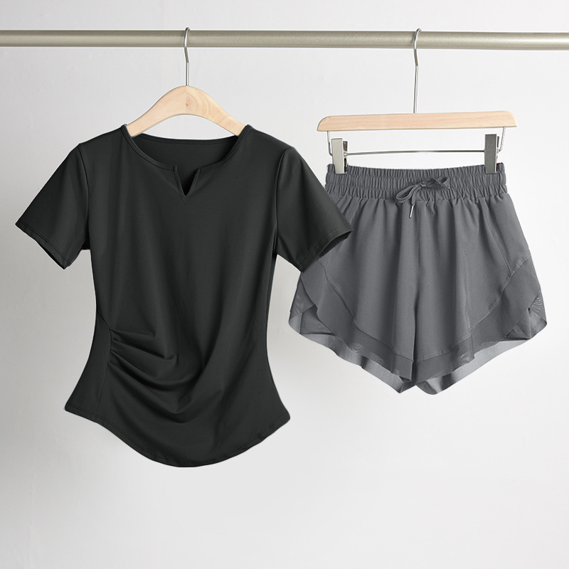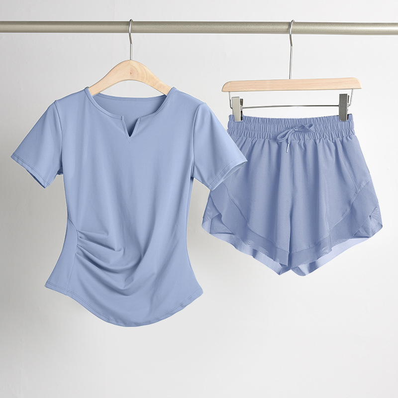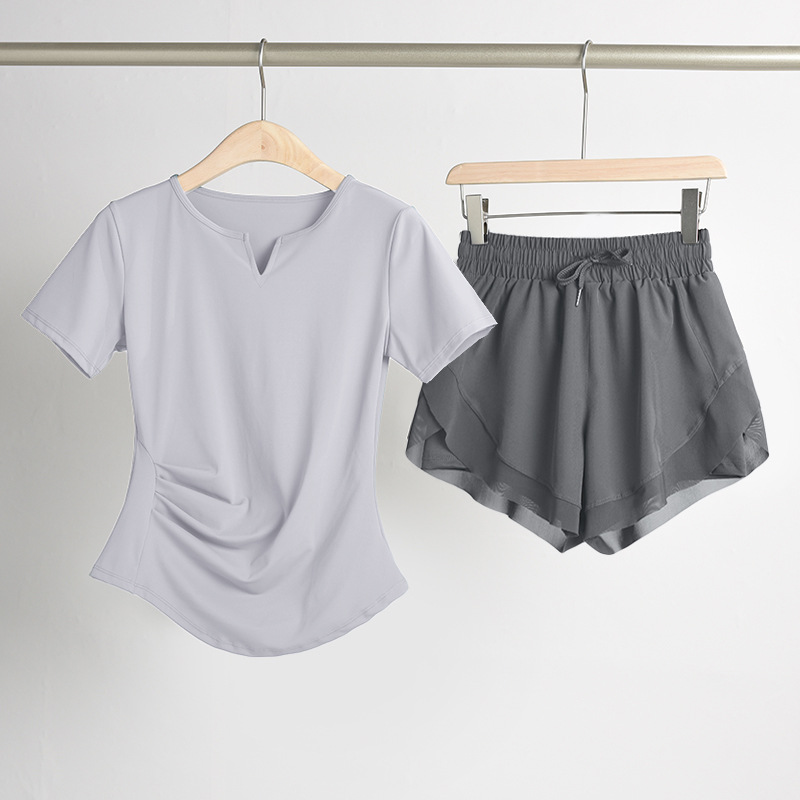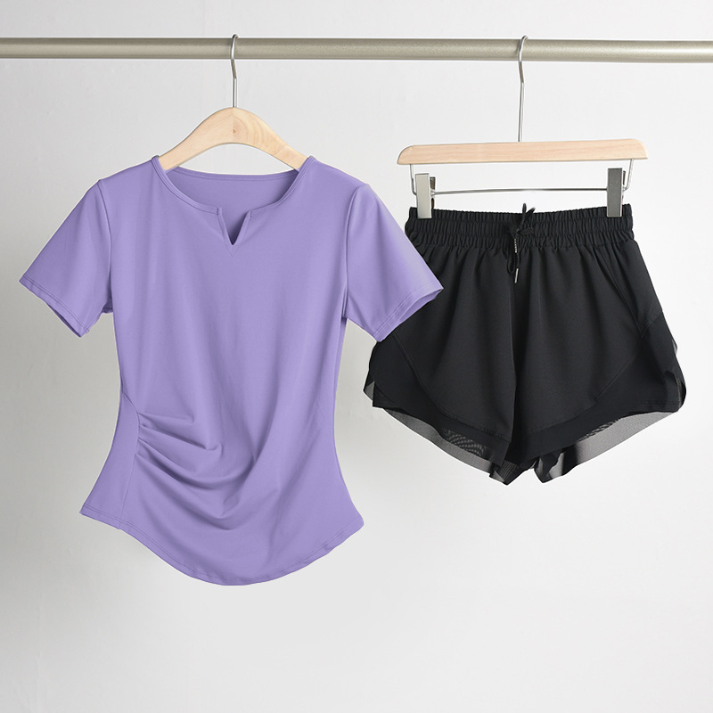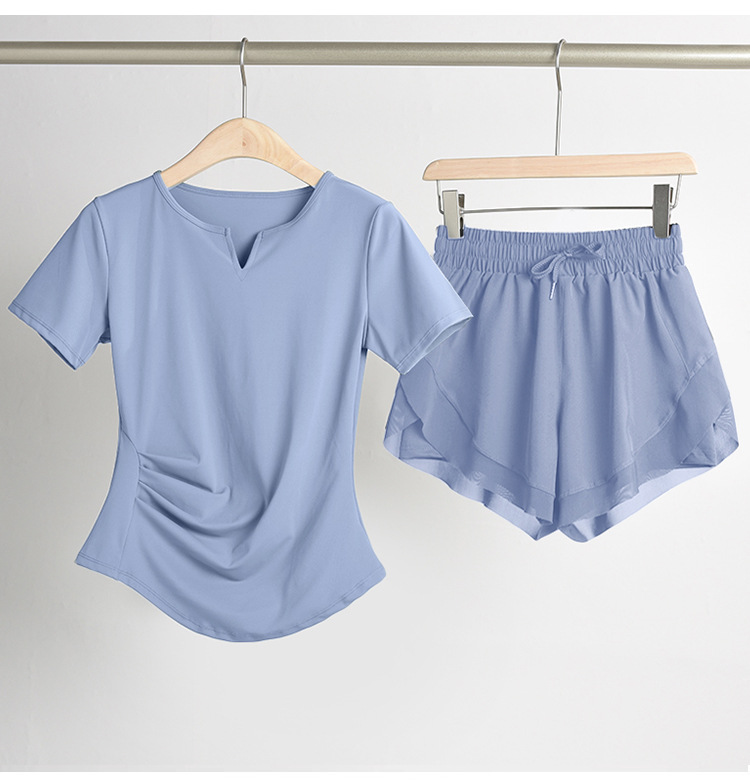 收腰瑜伽服女跑步运动上衣显瘦v领短袖t恤速干透气健身服套装夏
