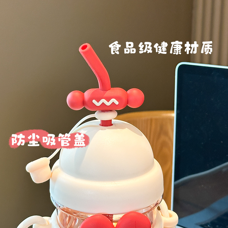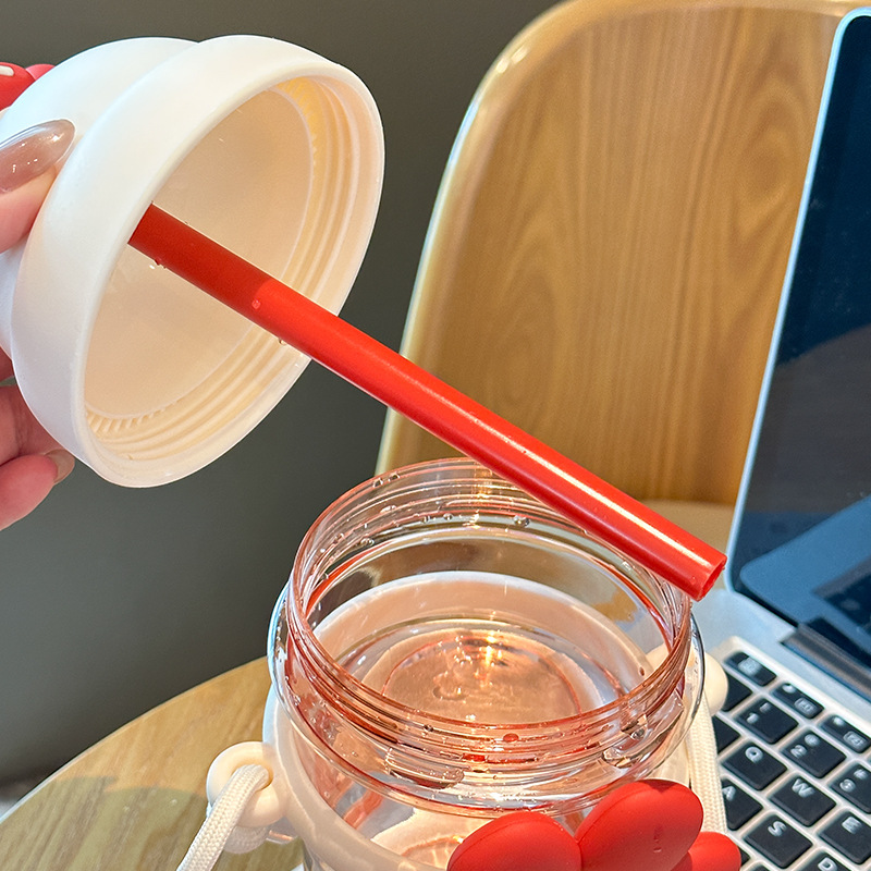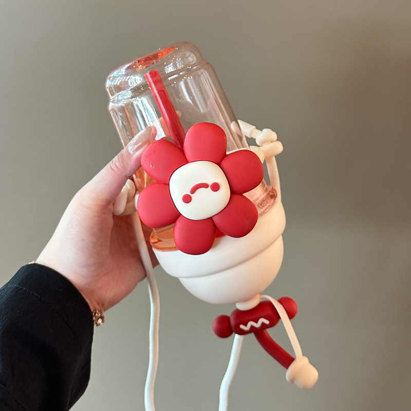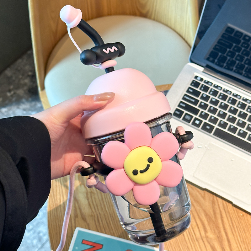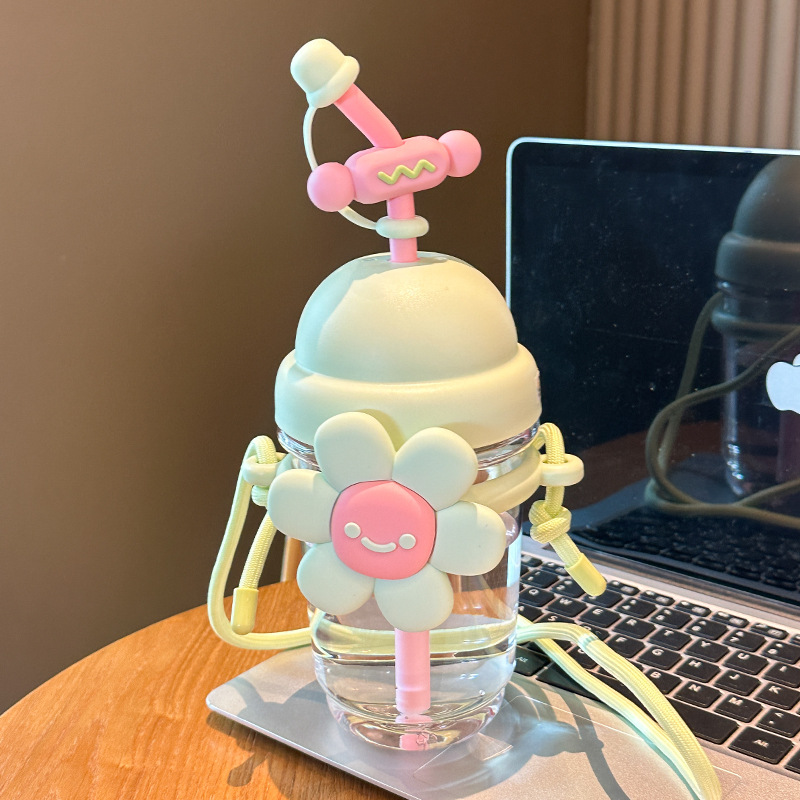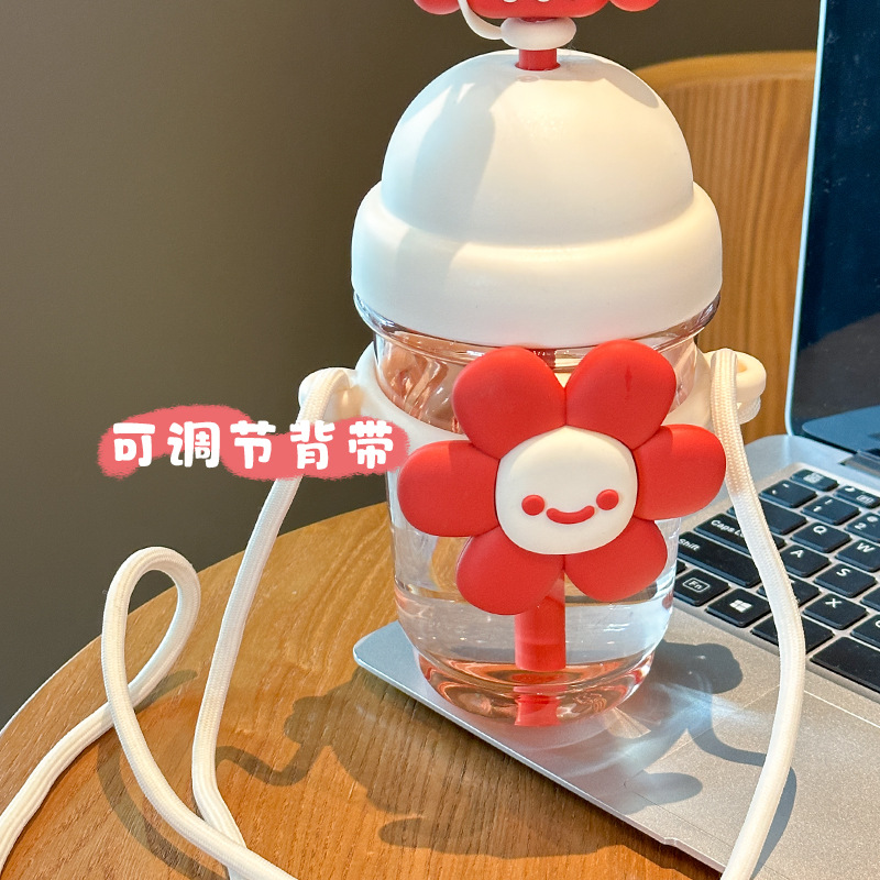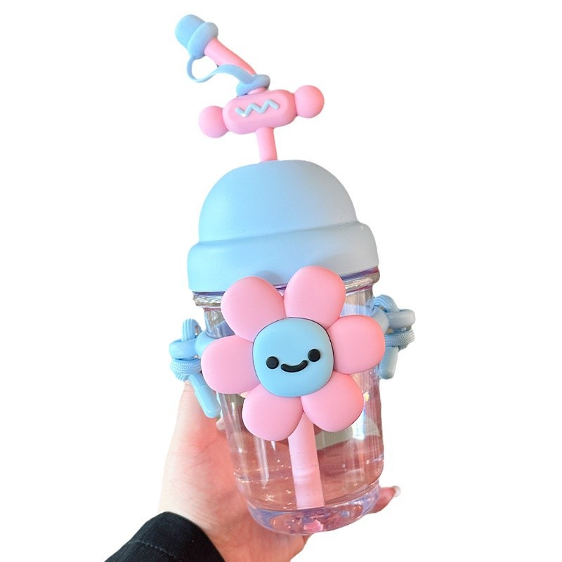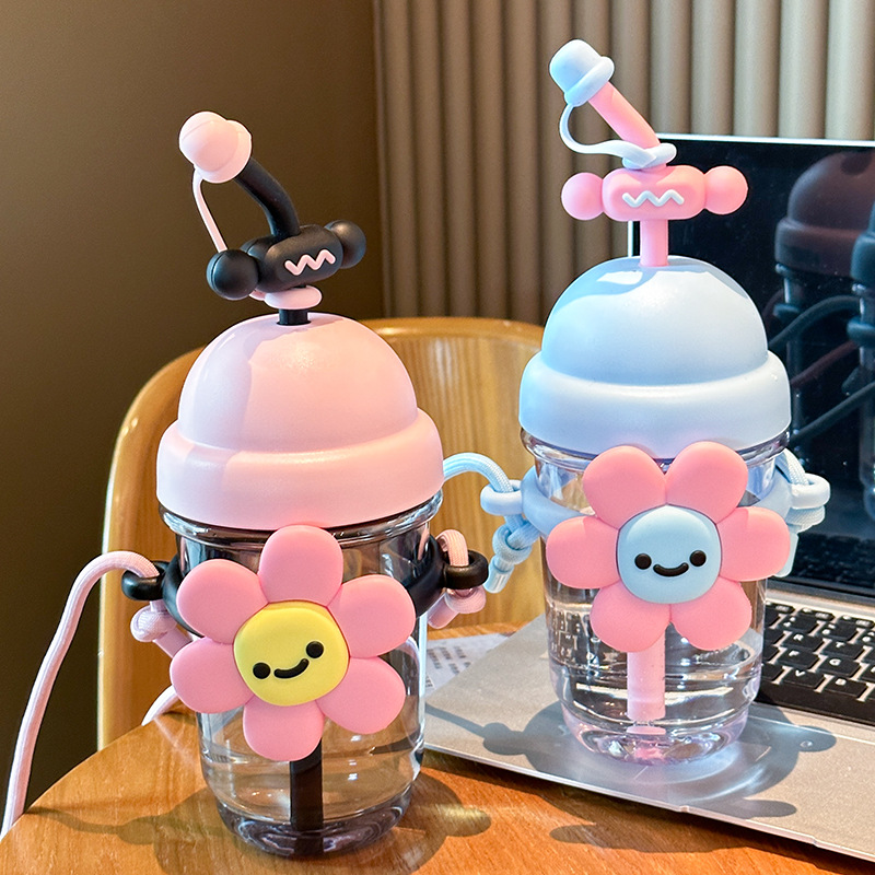 跨境太阳花吸管塑料杯卡通儿童水杯女生高颜值带提绳时尚花朵杯