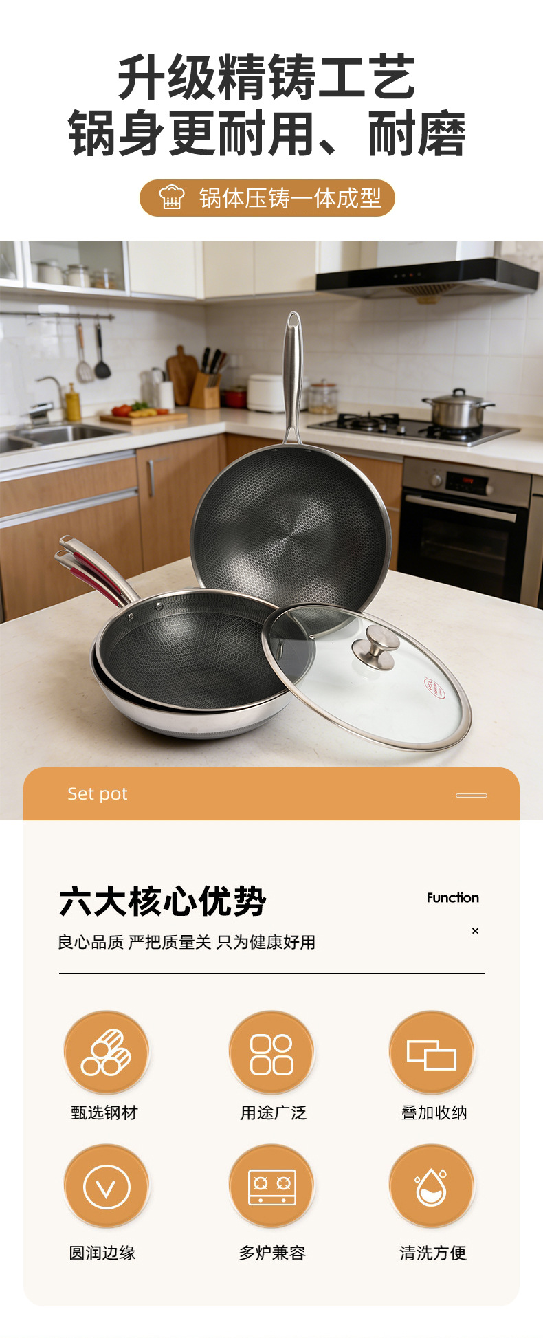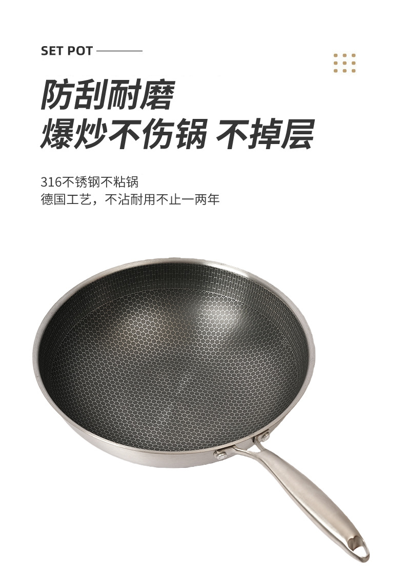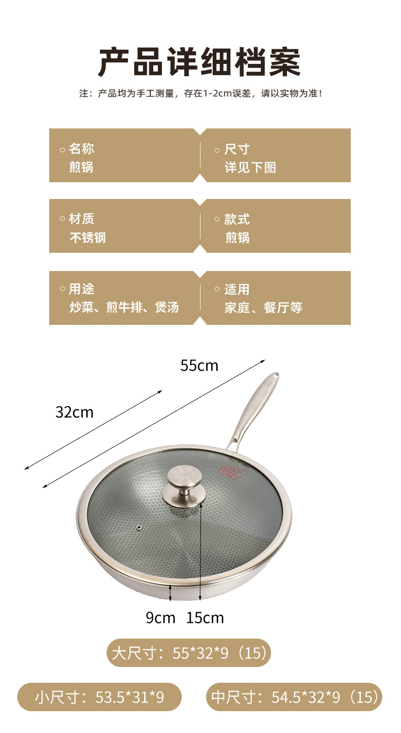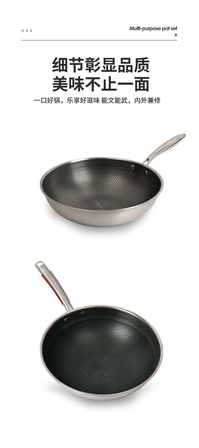 不锈钢全屏蜂窝炒锅家用炒菜锅平底锅煤气电磁炉通用