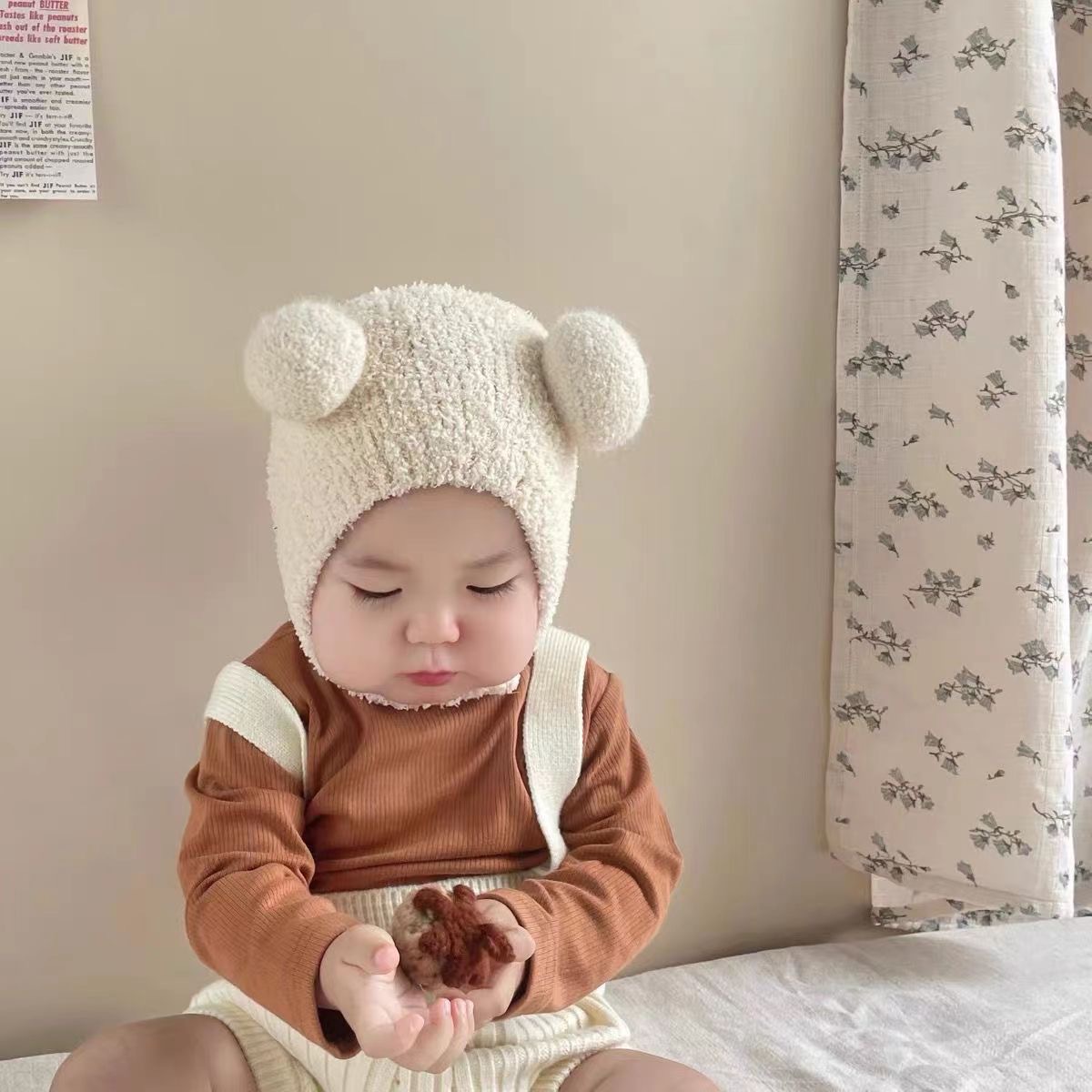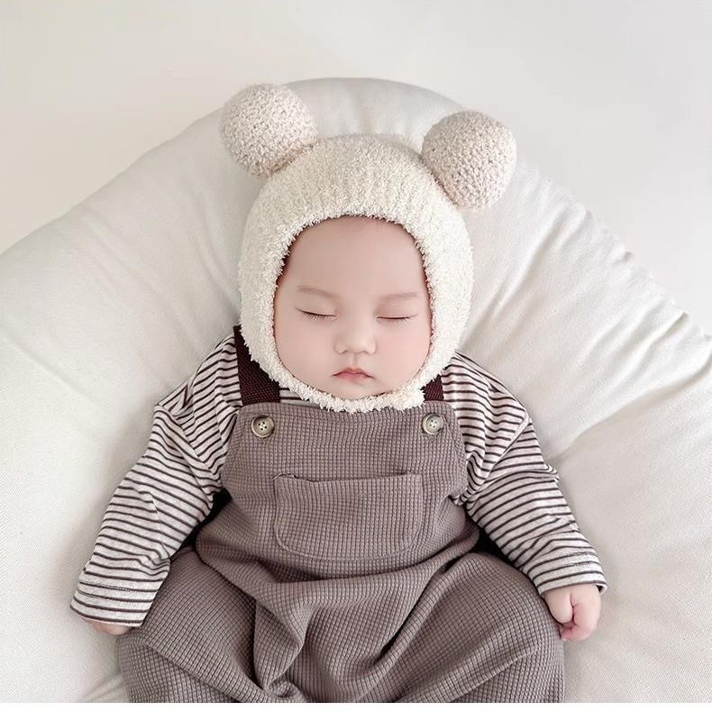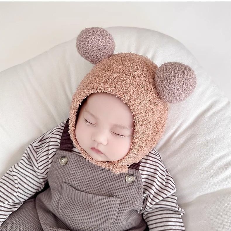 婴儿帽子秋冬季小月龄可爱超萌保暖男女宝宝护耳毛绒套头帽纯色潮