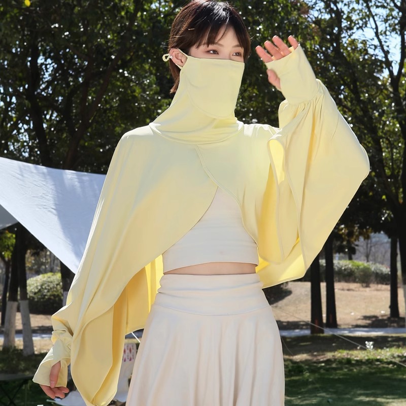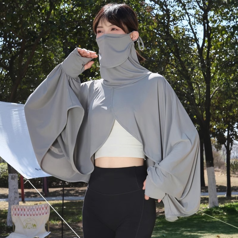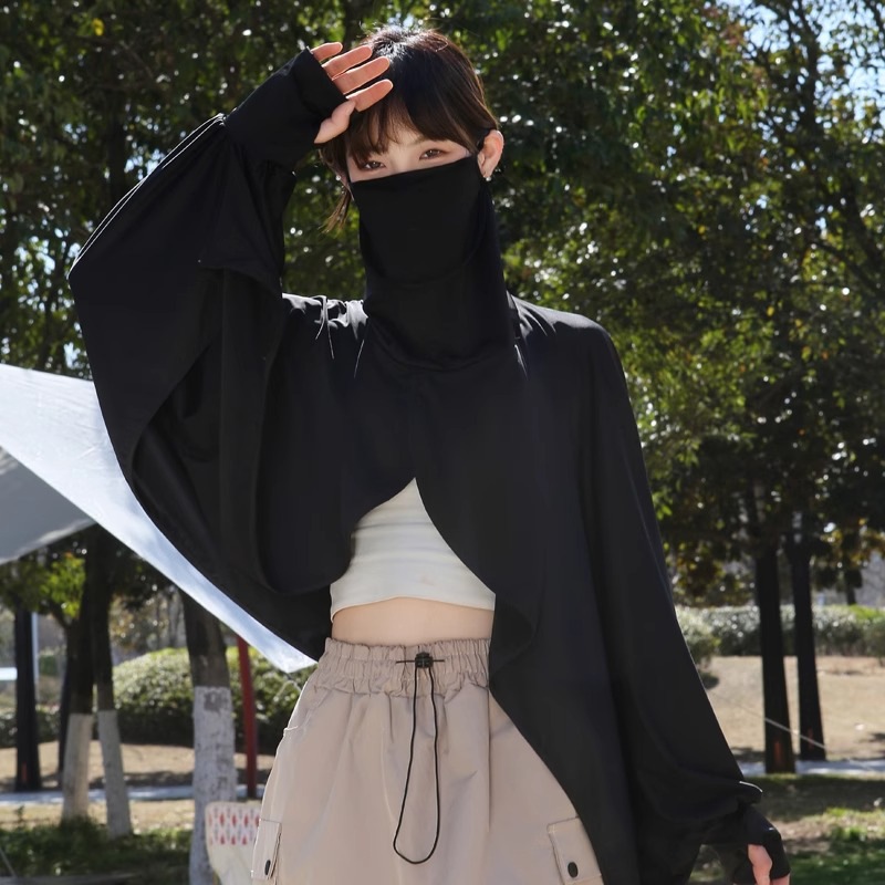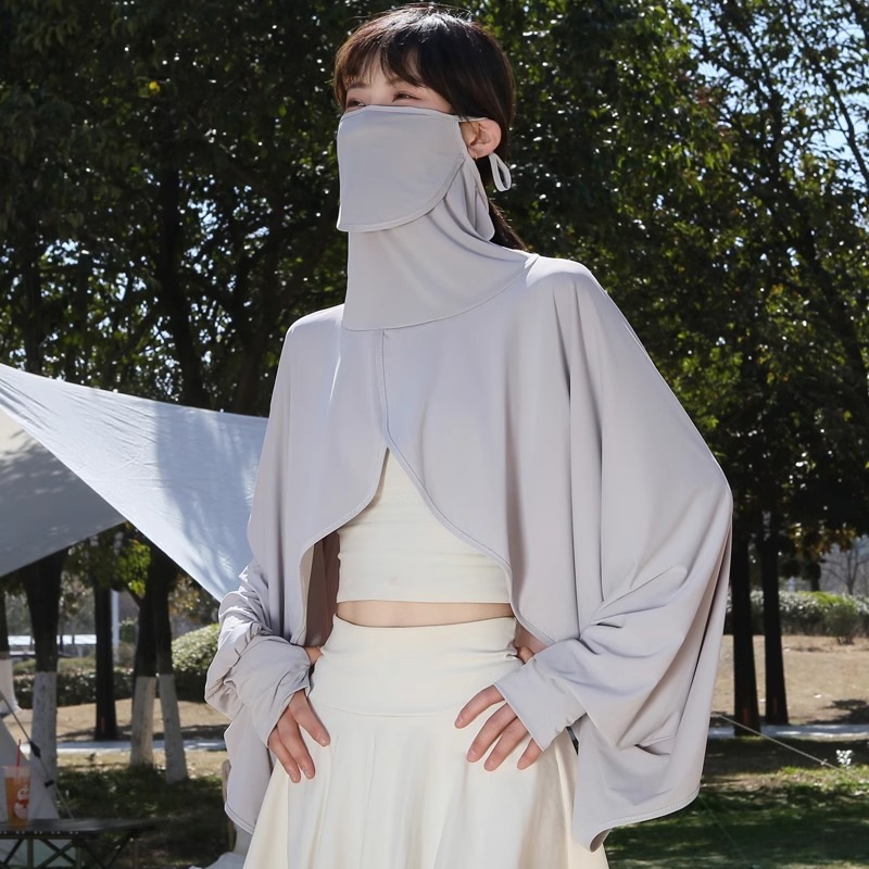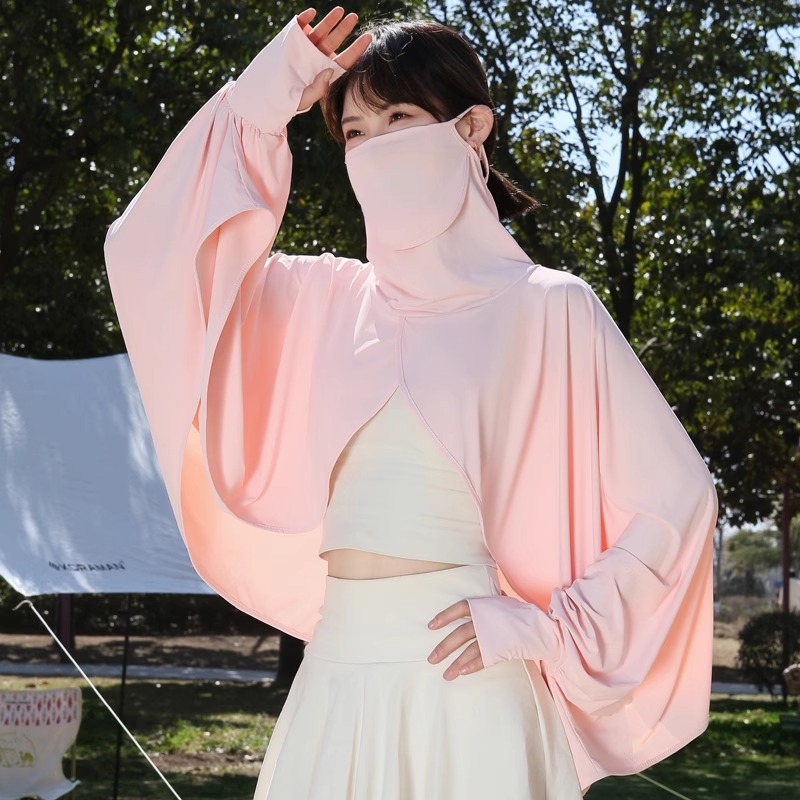 防晒披肩女夏季薄款罩衫户外开车骑车披肩面罩袖套一体短款外套