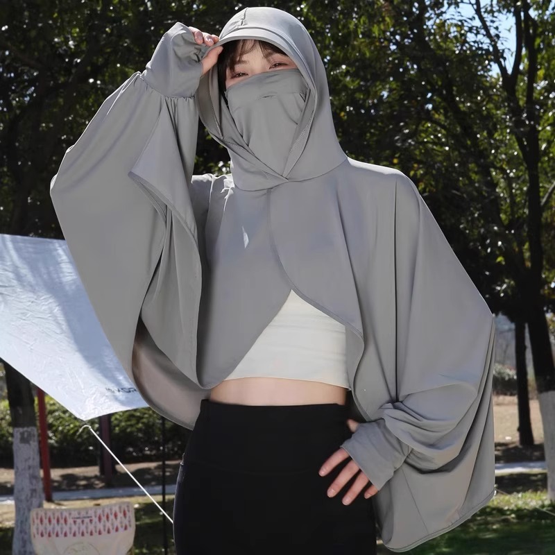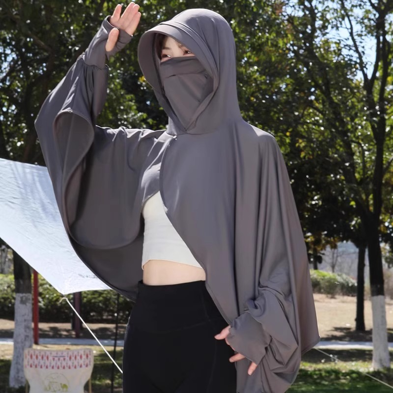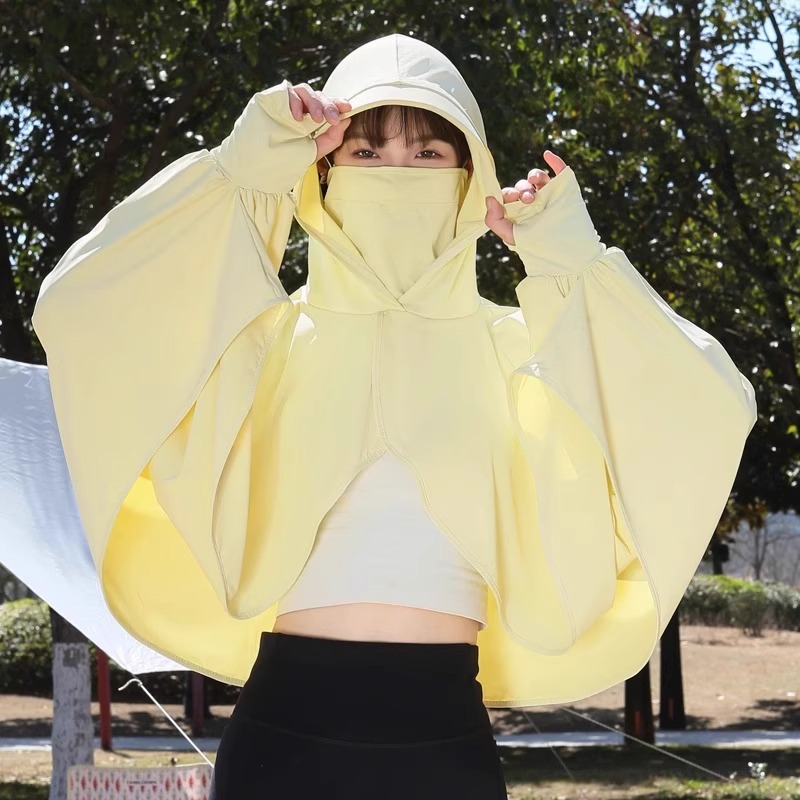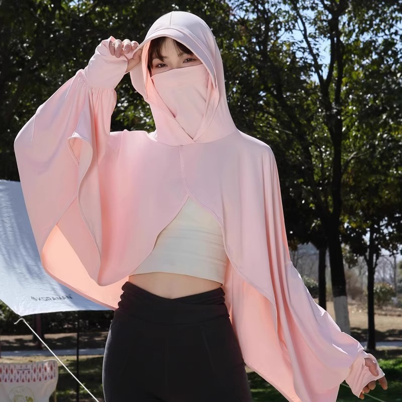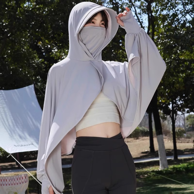 防晒披肩女夏季薄款罩衫户外开车骑车披肩面罩袖套一体短款外套