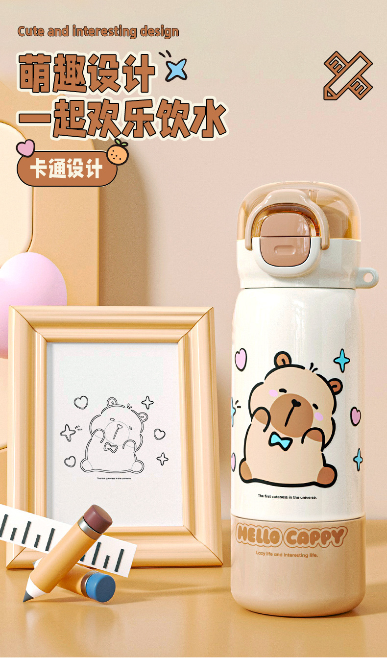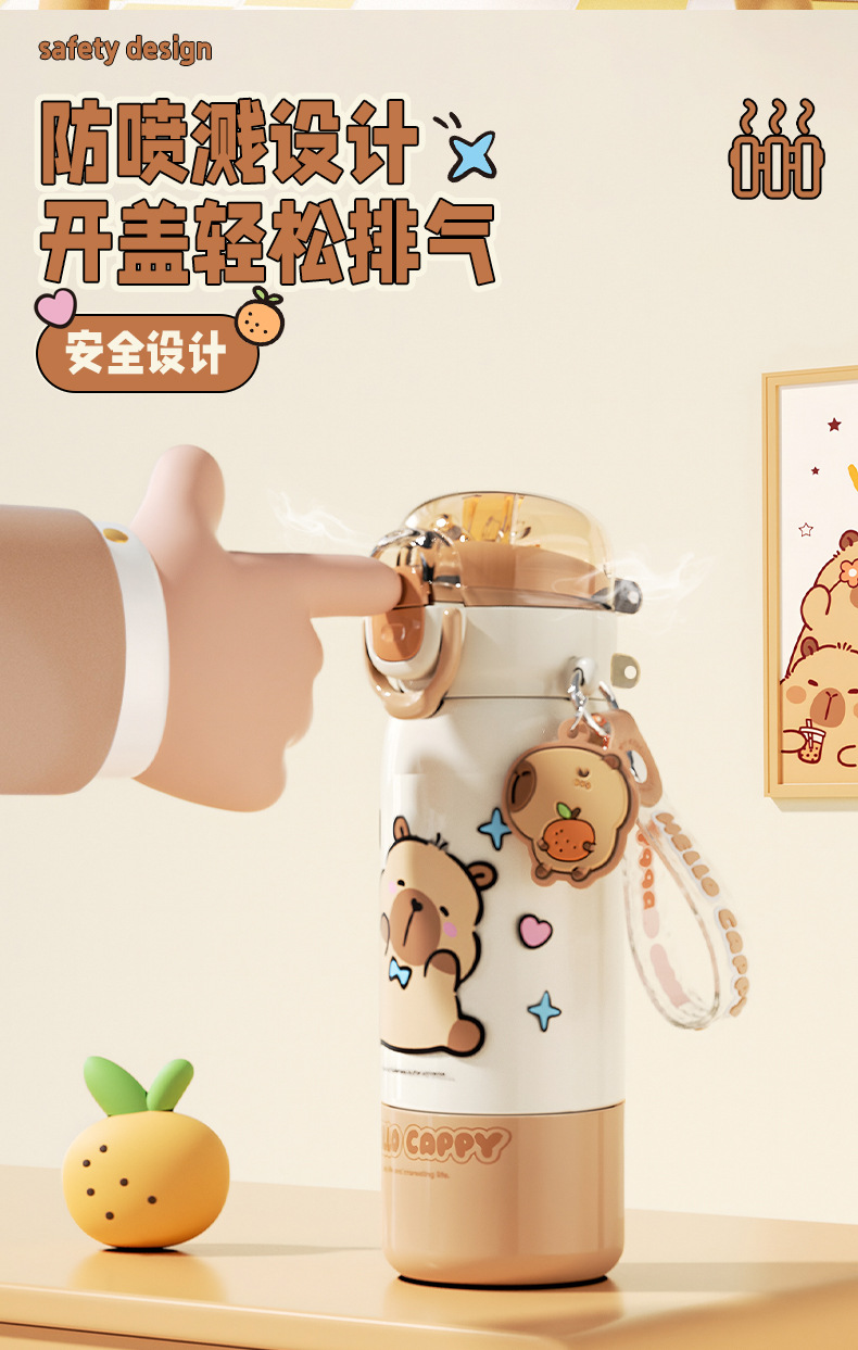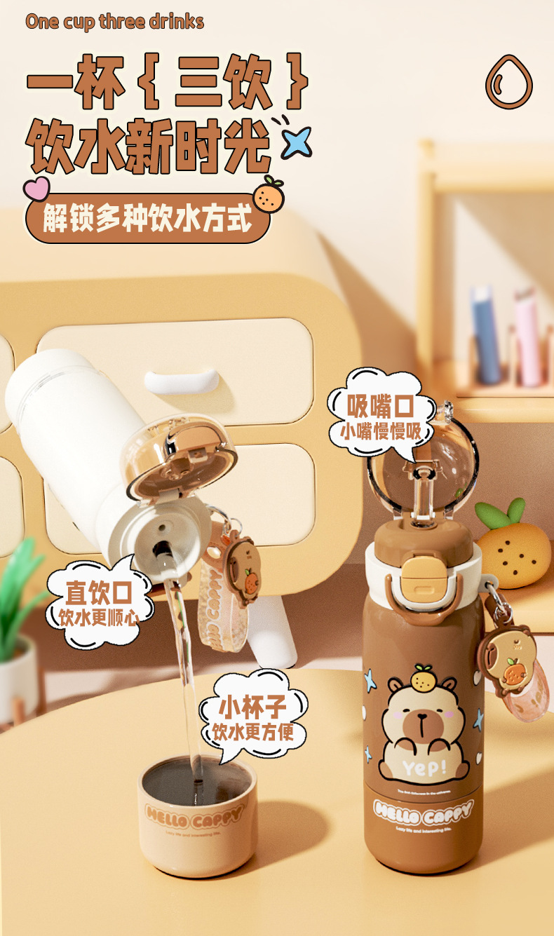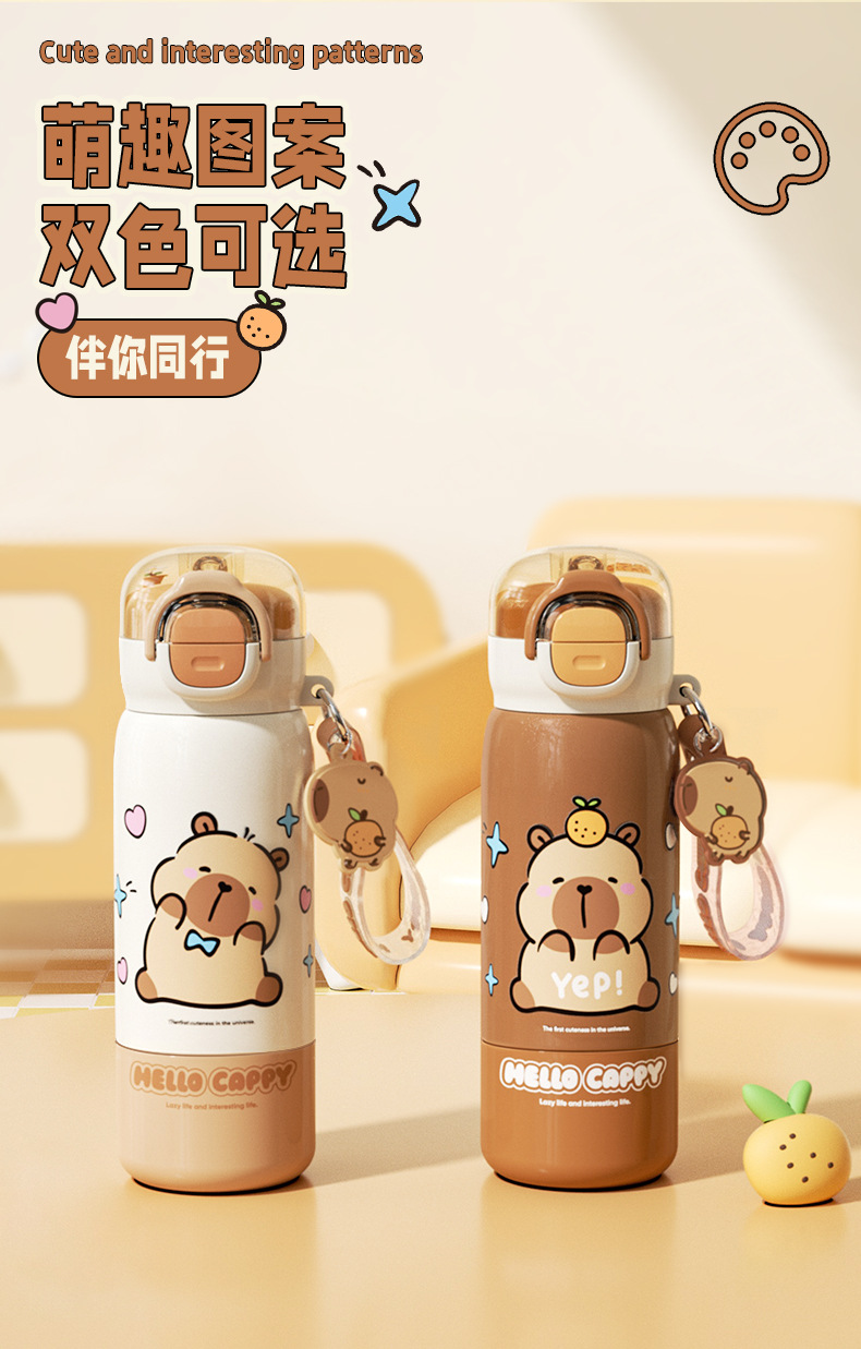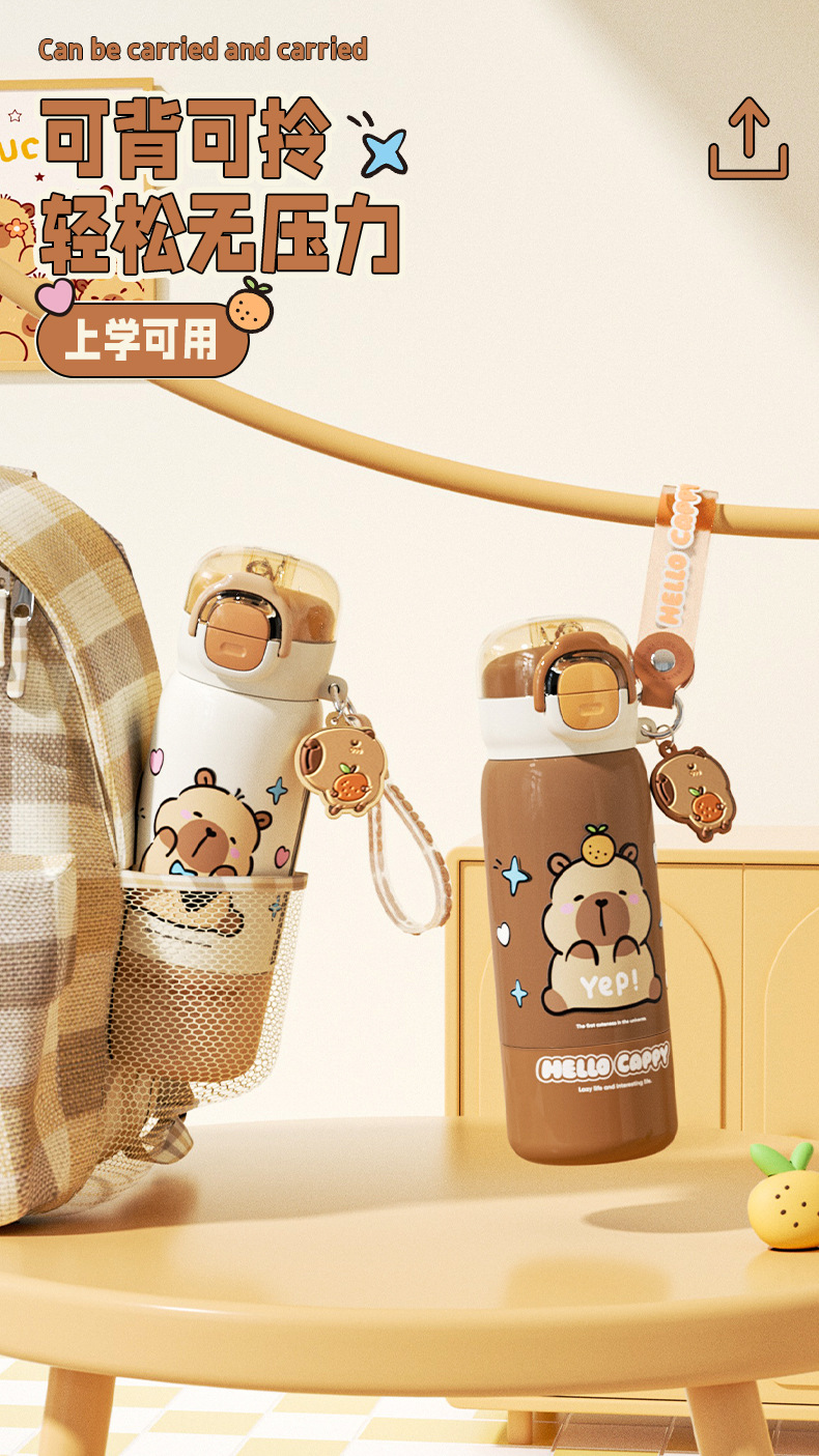 卡皮巴拉儿童保温杯男女孩2025新款学生上学专用双饮吸管水杯子