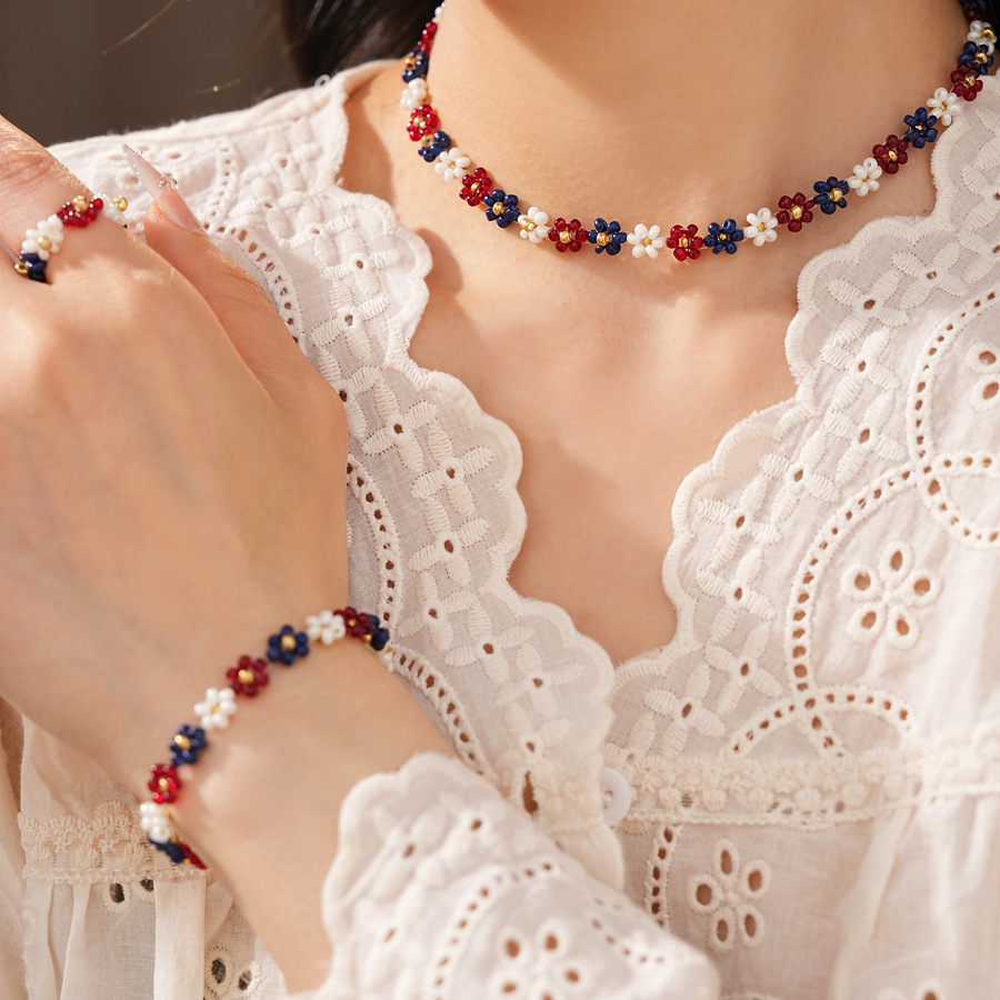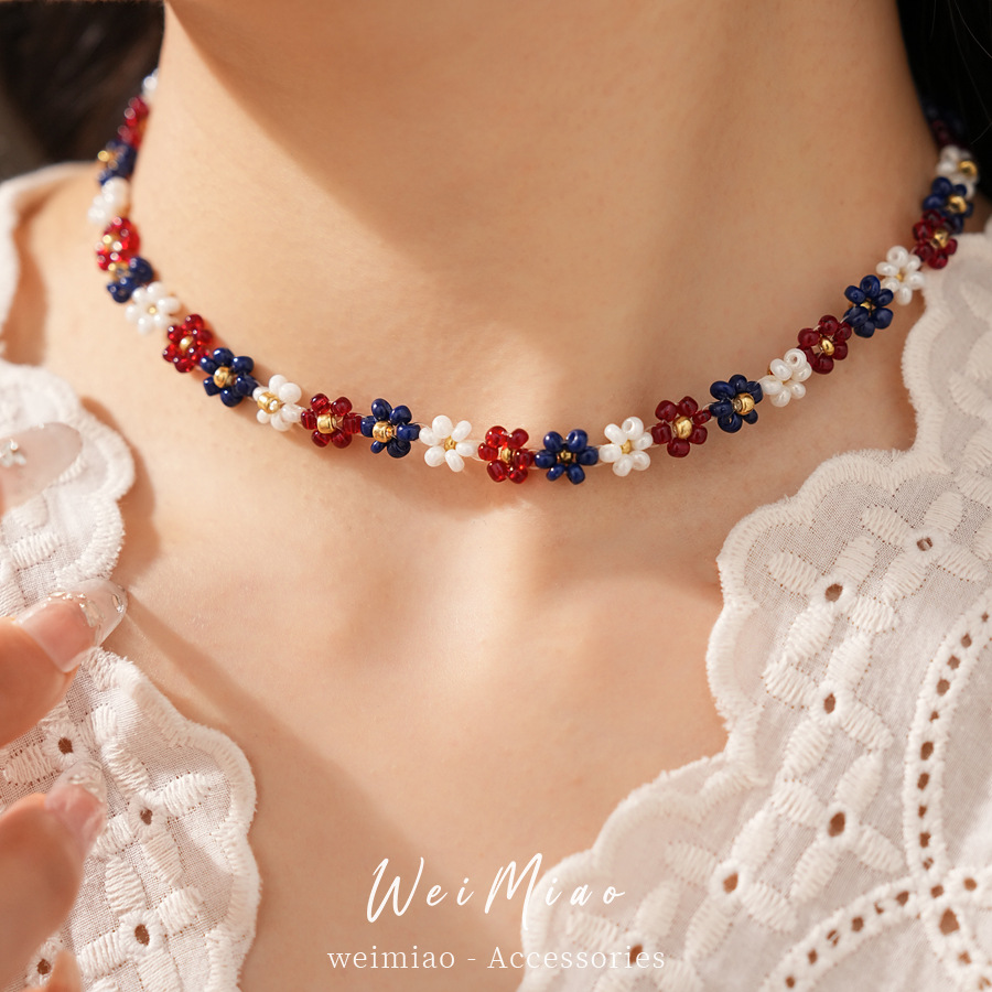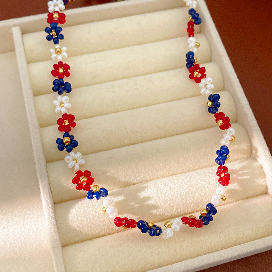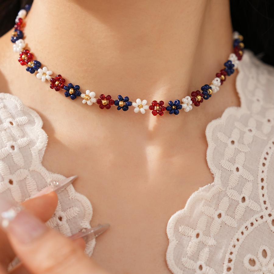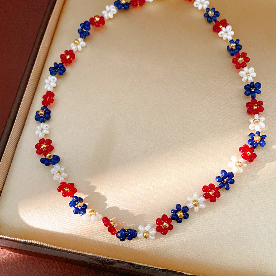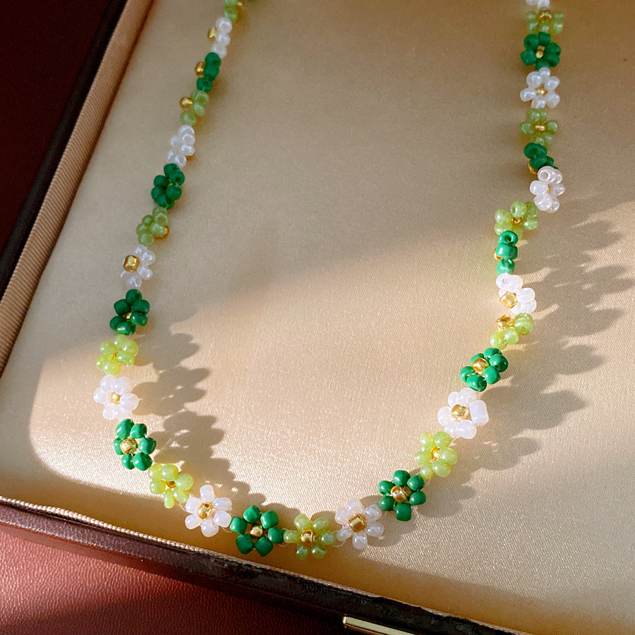 玻璃米粒串珠花朵项链轻奢小众锁骨链度假风甜美气质时尚首饰套装