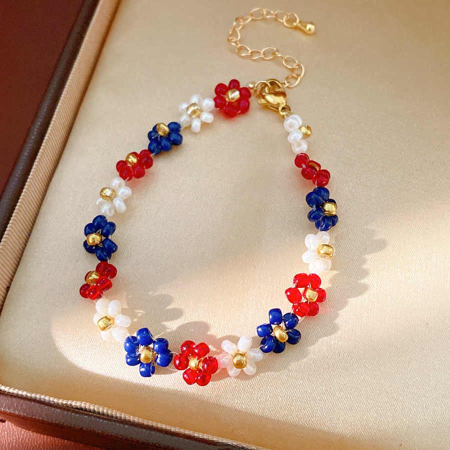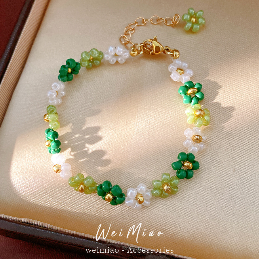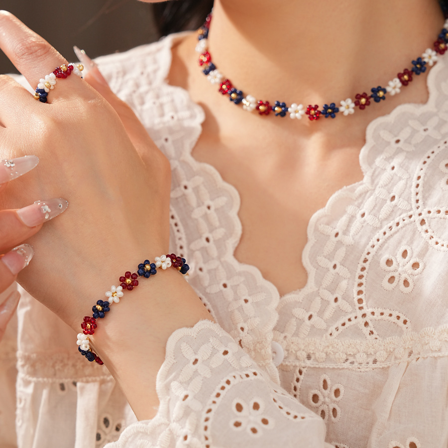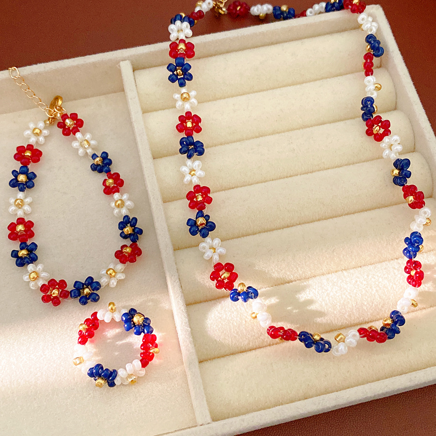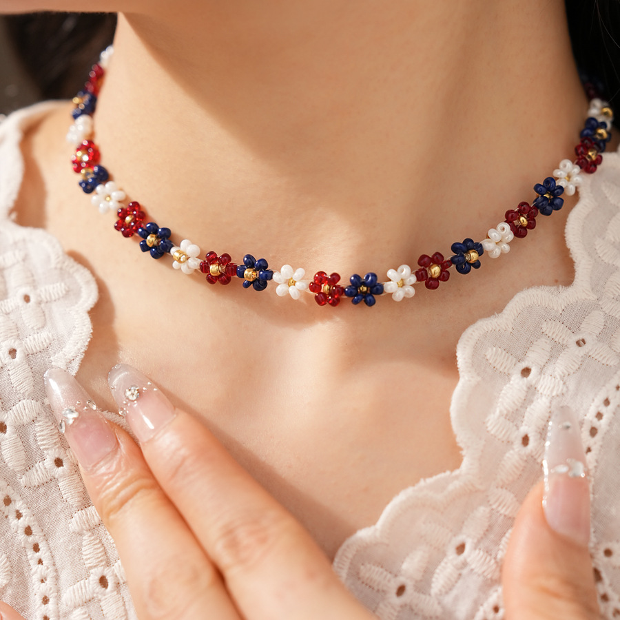 玻璃米粒串珠花朵项链轻奢小众锁骨链度假风甜美气质时尚首饰套装