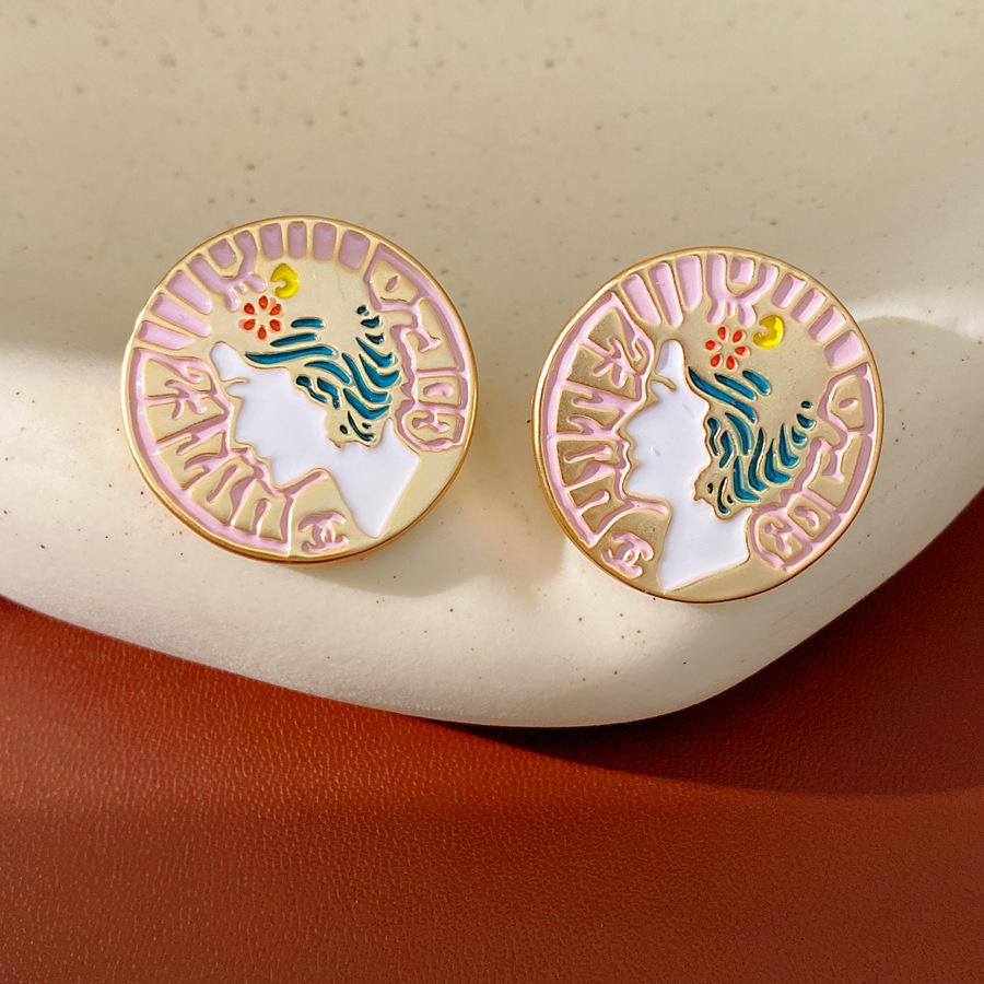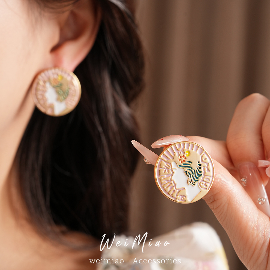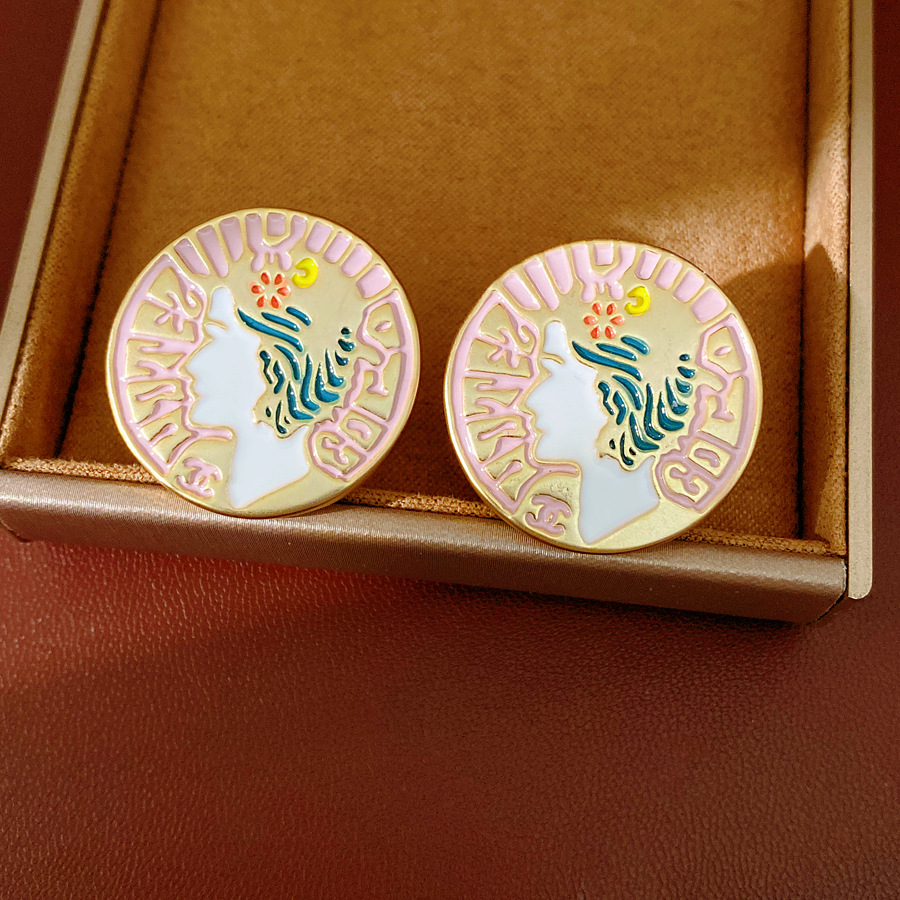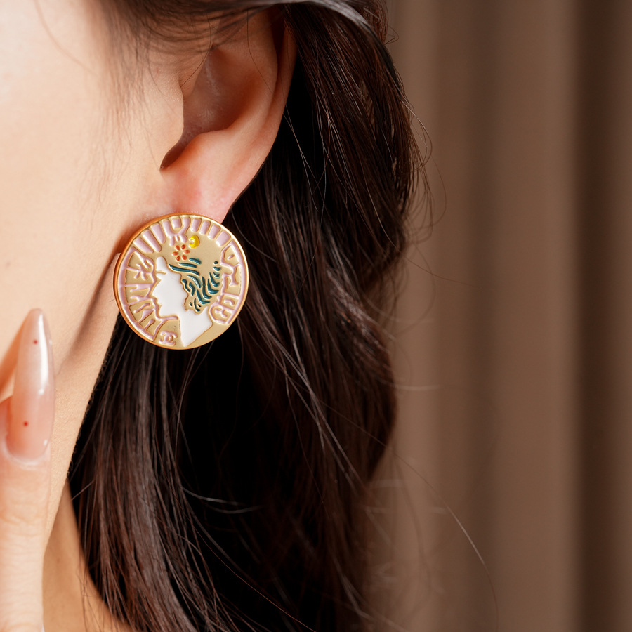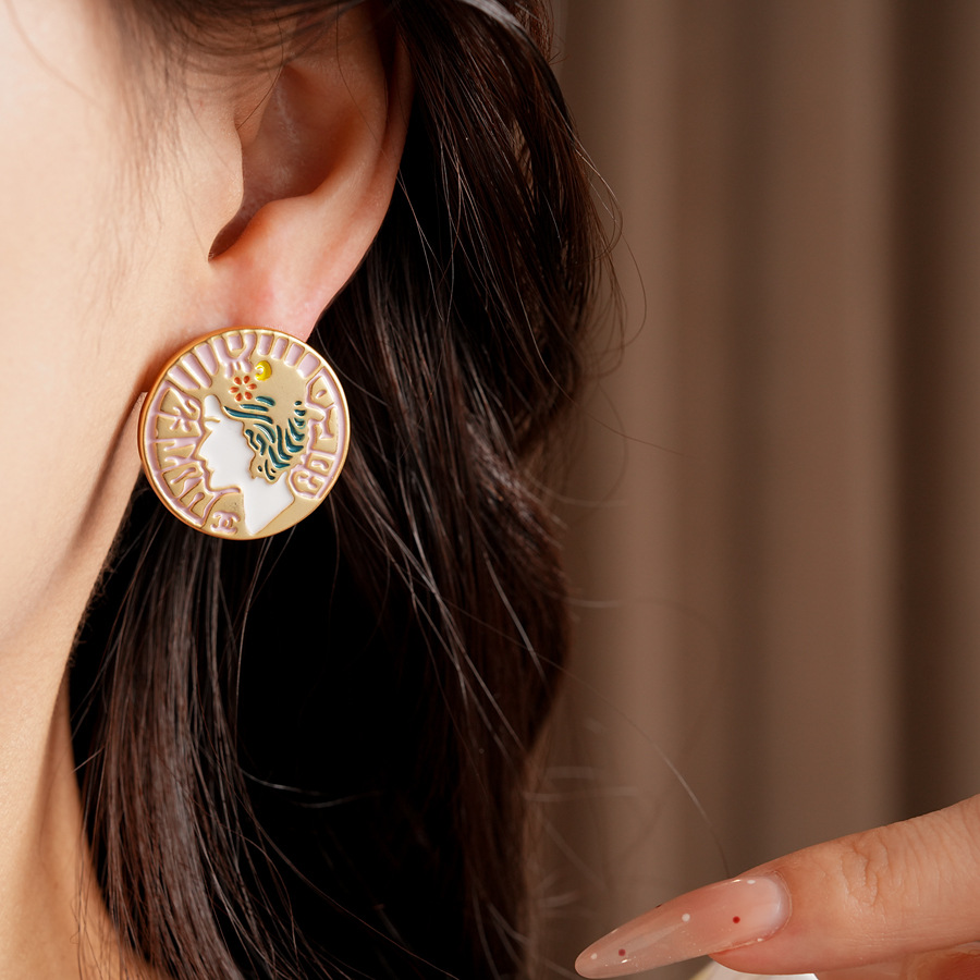 银针滴油几何圆形人像耳钉法式复古气质小众耳环轻奢高级感耳饰女