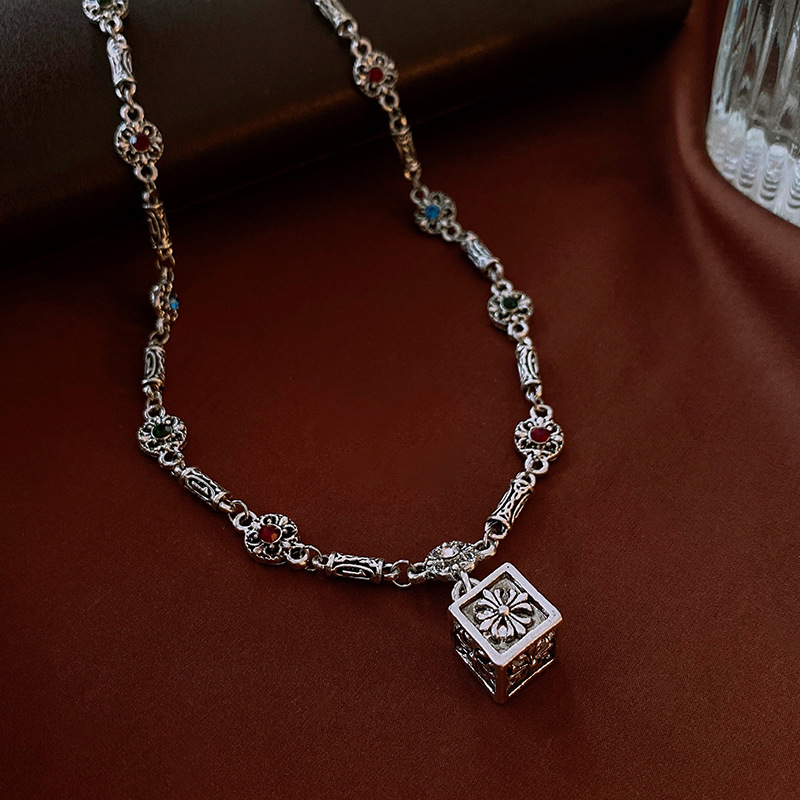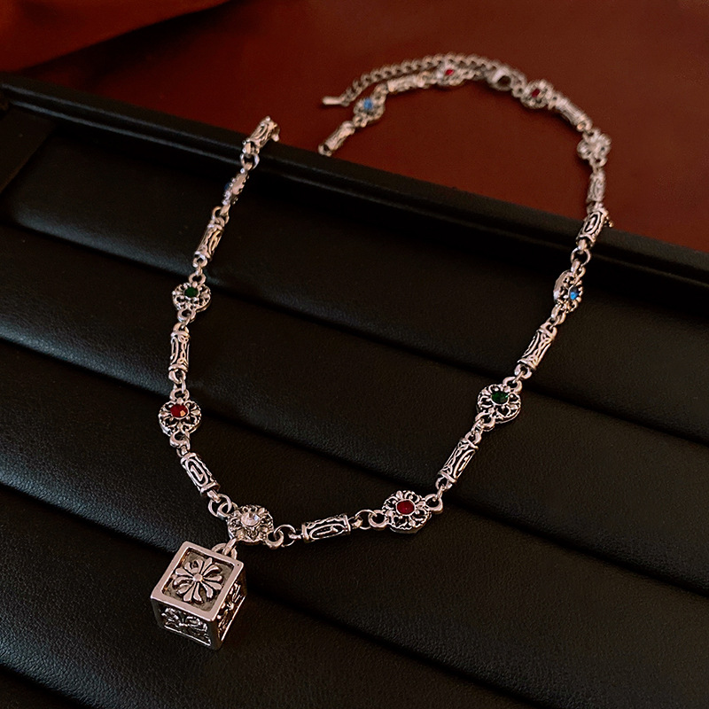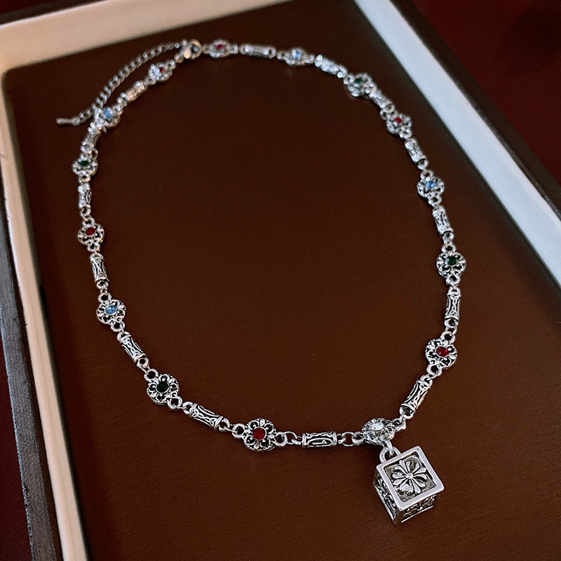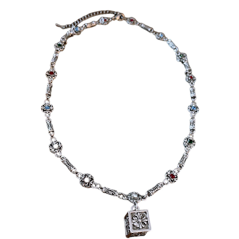 跨境镶钻方块花朵项链中古小众百搭毛衣链高级感复古气质饰品批发