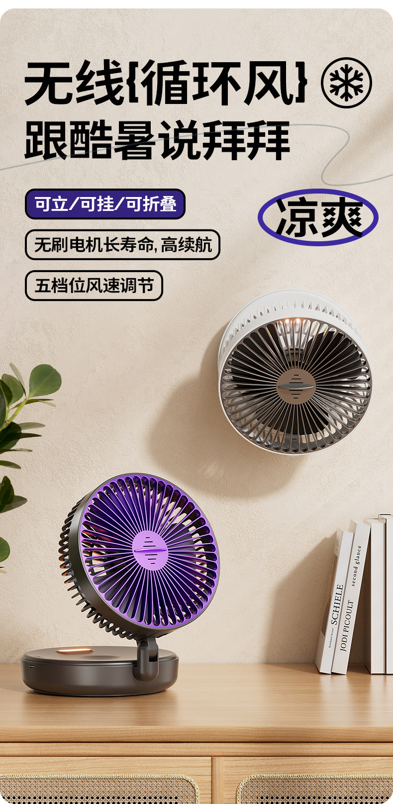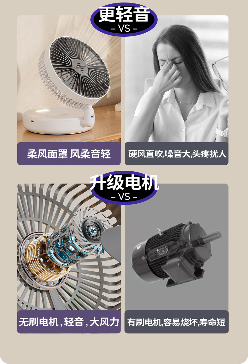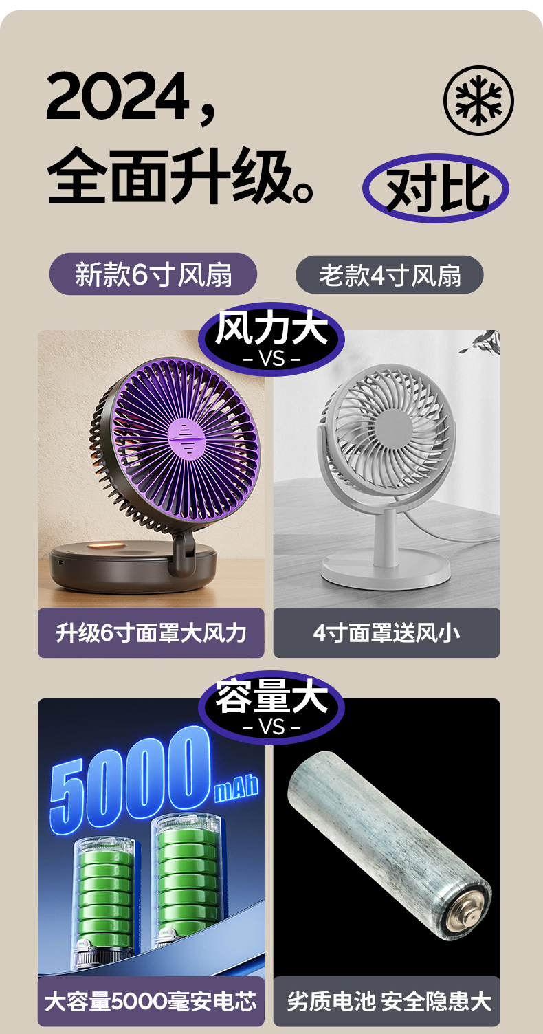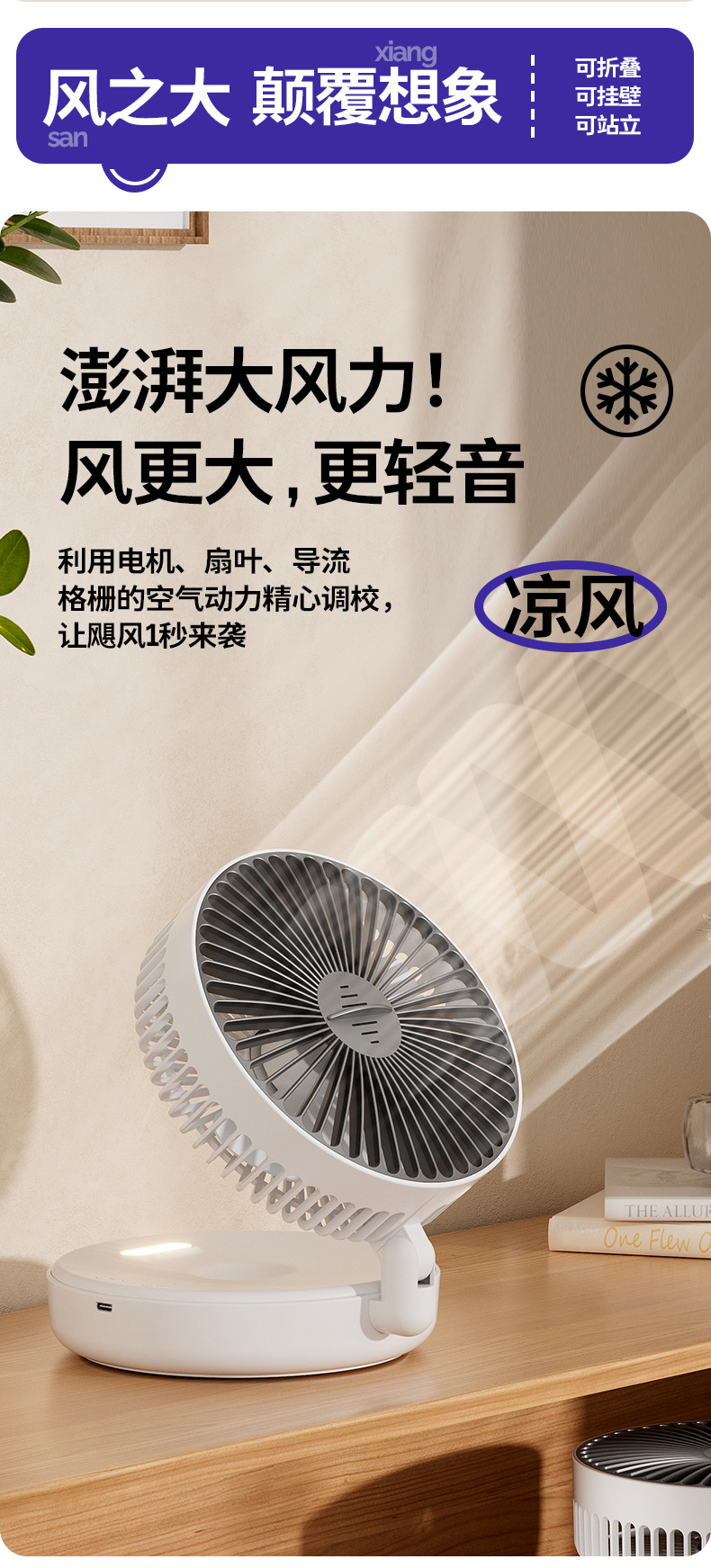 5000毫安折叠夜光风扇挂壁便携静音大风循环扇学生办公室桌面风扇