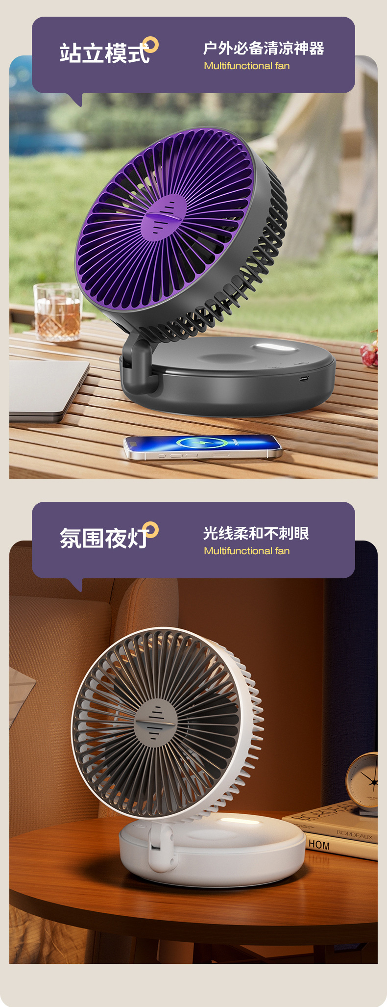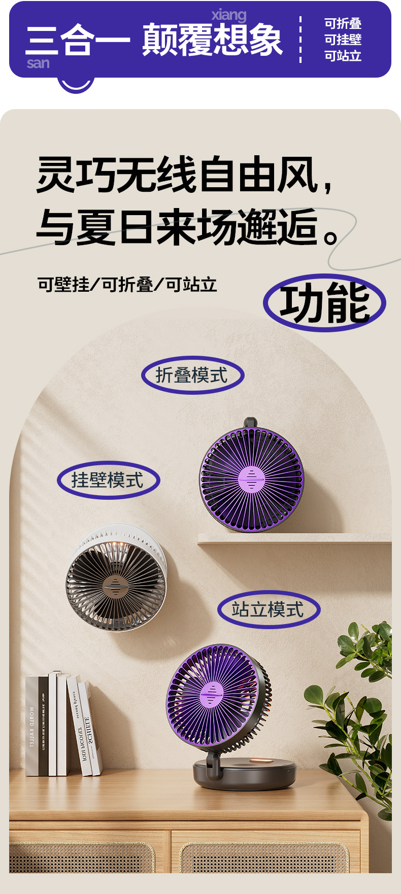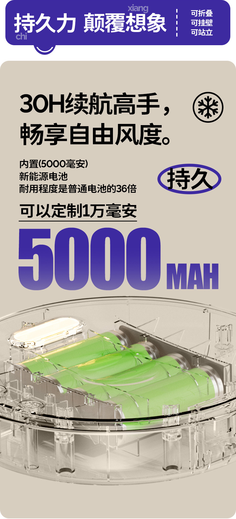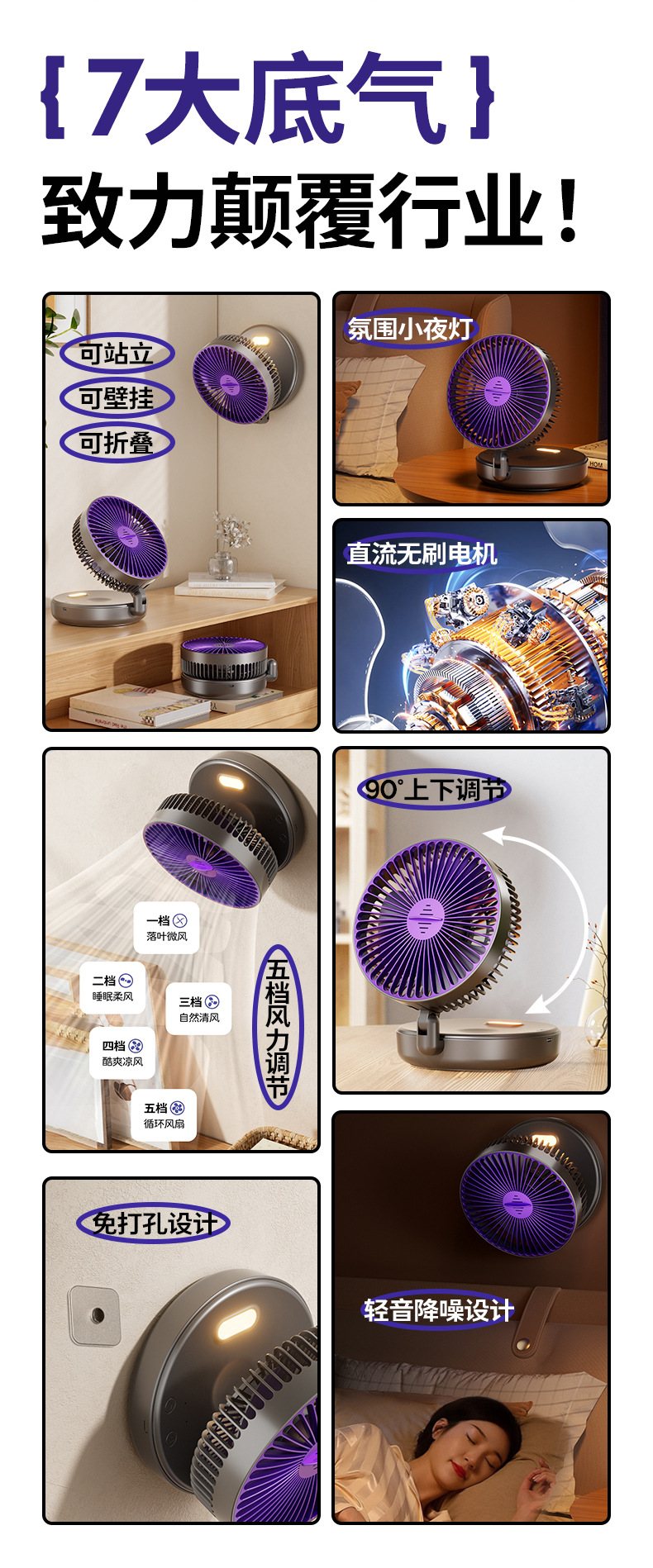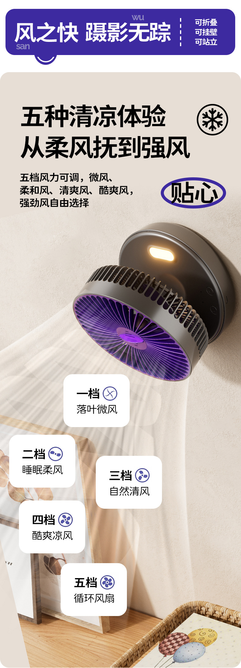 5000毫安折叠夜光风扇挂壁便携静音大风循环扇学生办公室桌面风扇