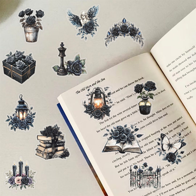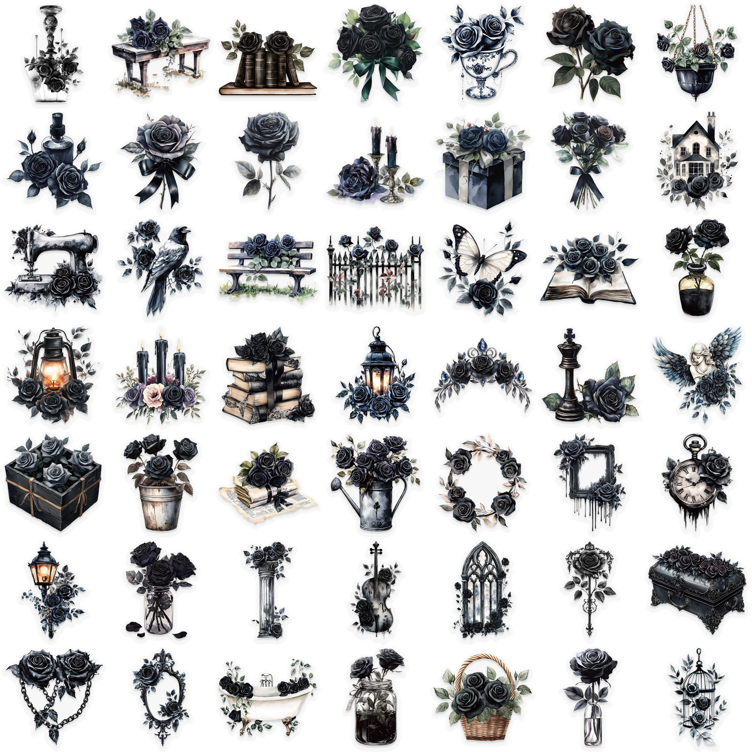 50张透明卡通黑暗玫瑰贴纸包 防水透明PET手账素材装饰吉他笔记本