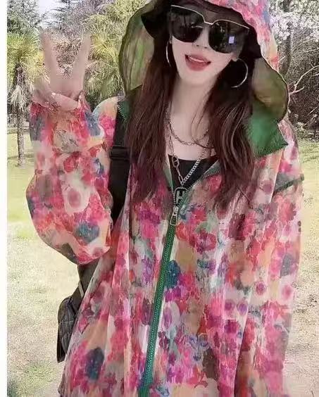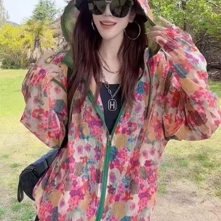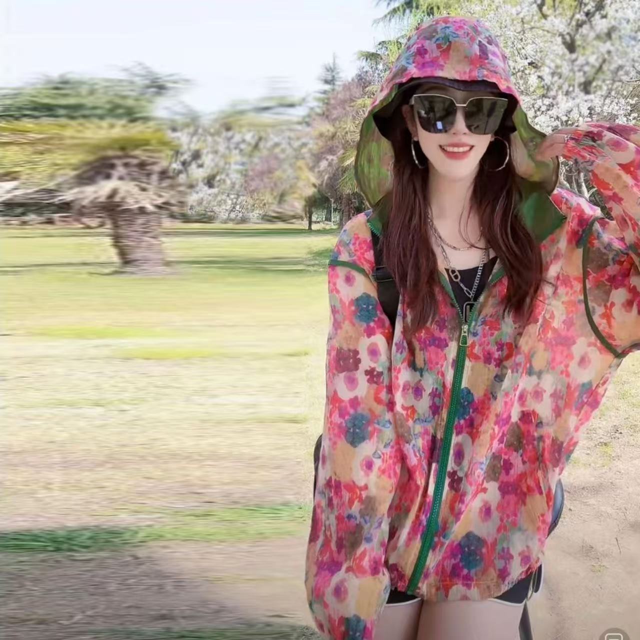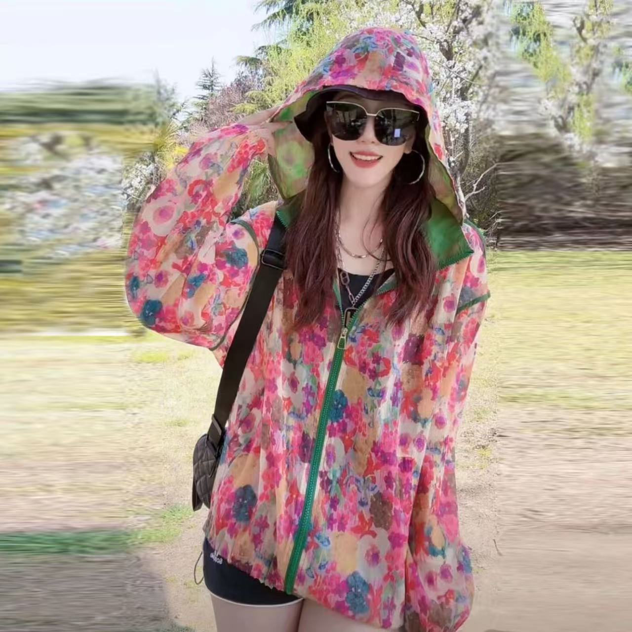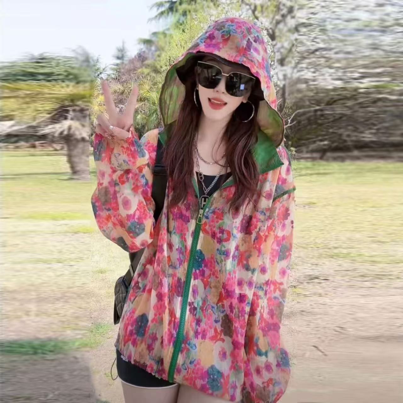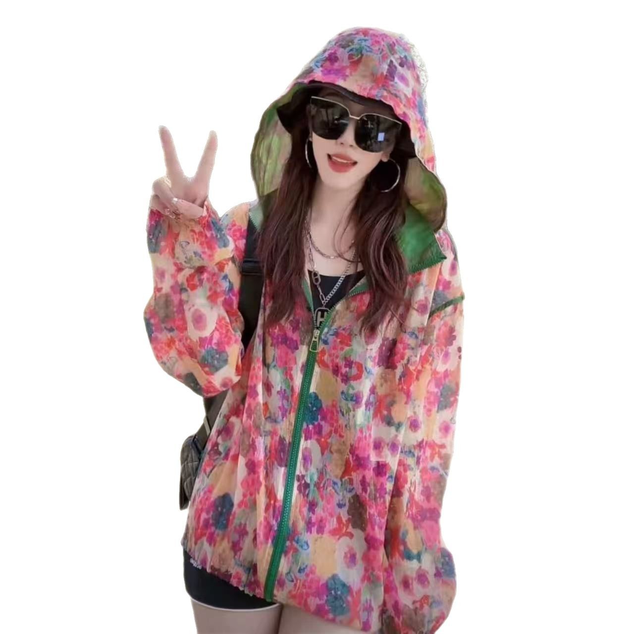 时尚拼接撞色印花连帽轻薄防晒衣外套女夏季新款休闲宽松百搭上衣