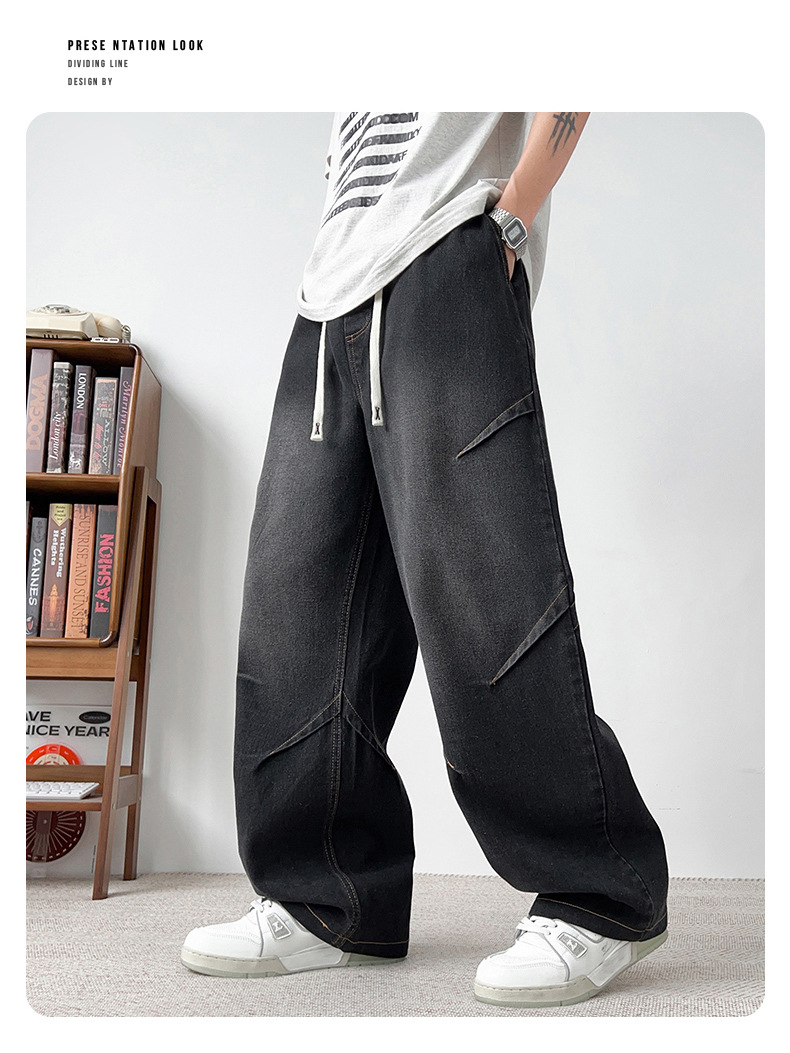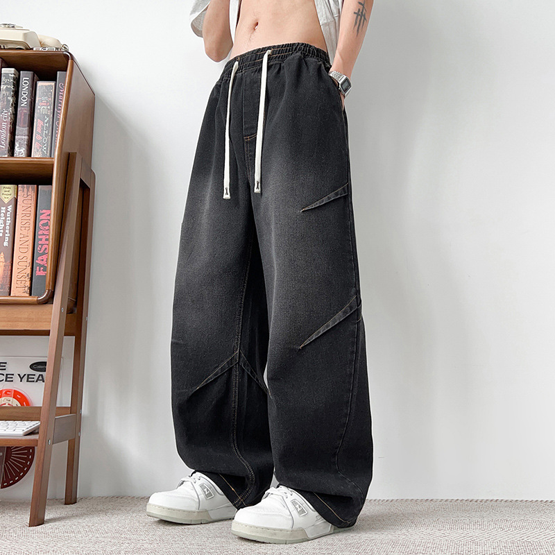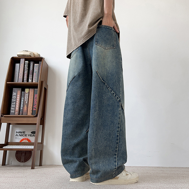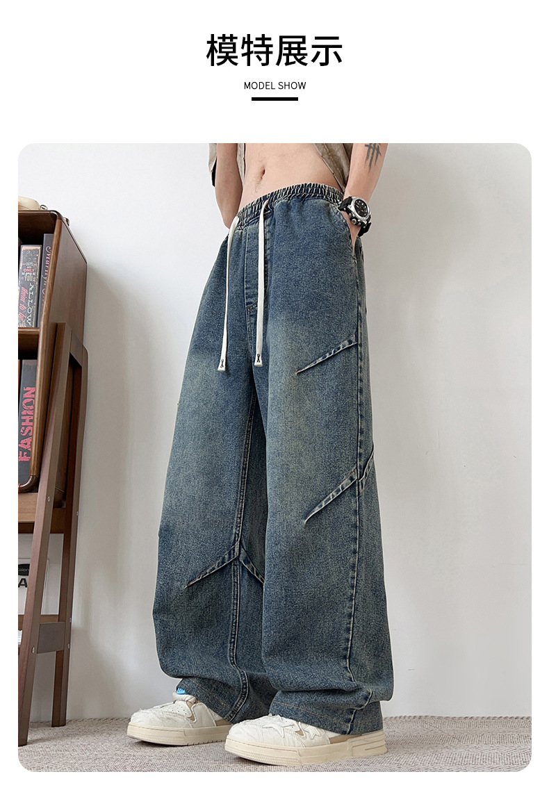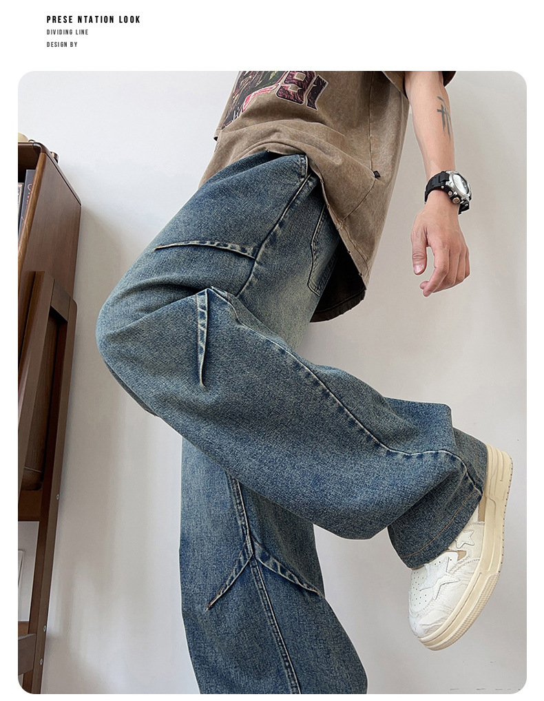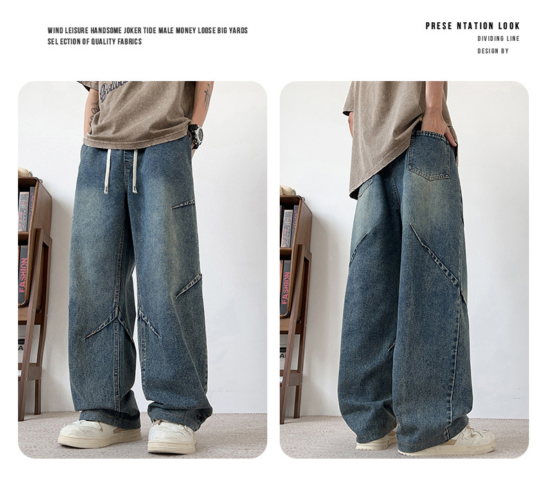 美式复古牛仔裤男士春夏款高街宽松阔腿裤子潮牌休闲直筒工装长裤