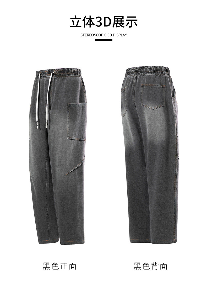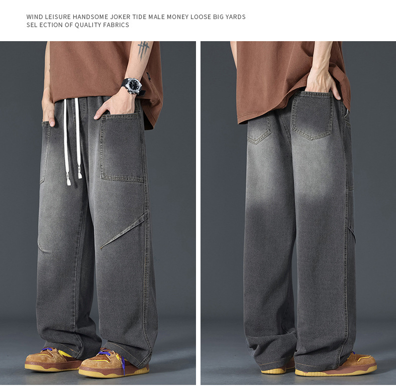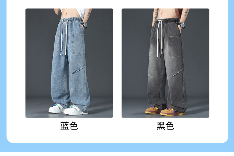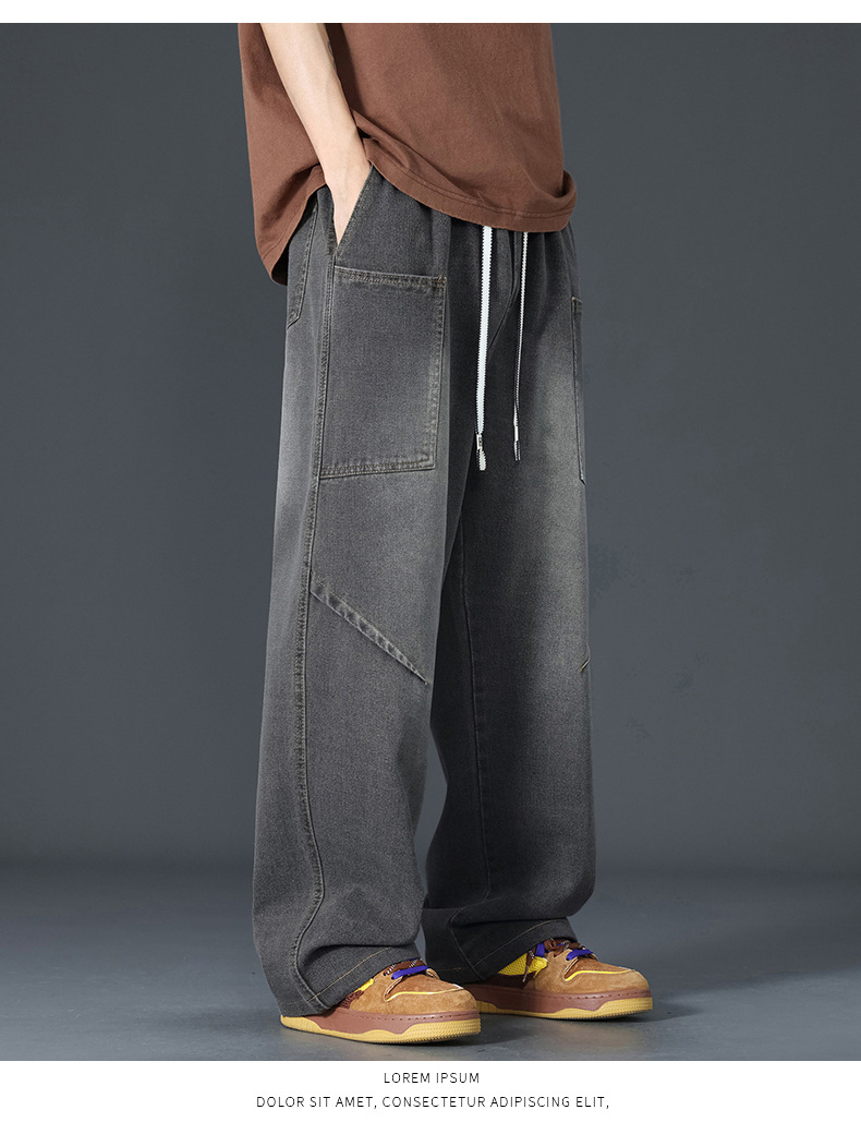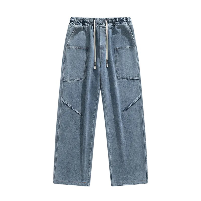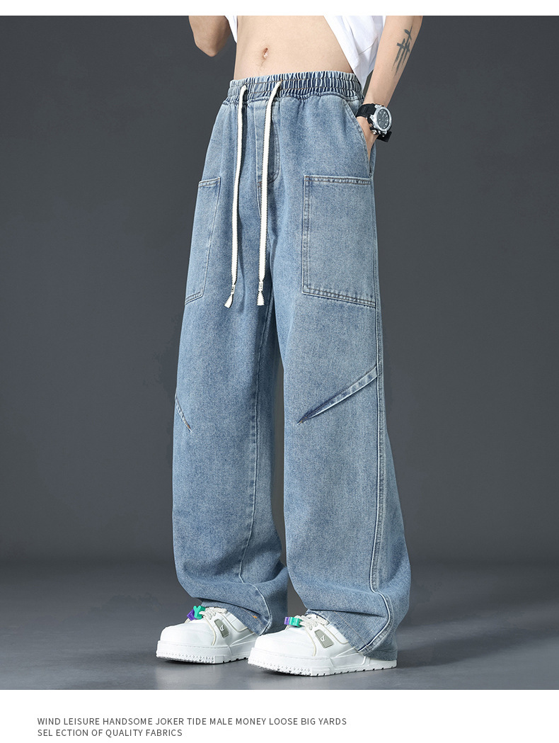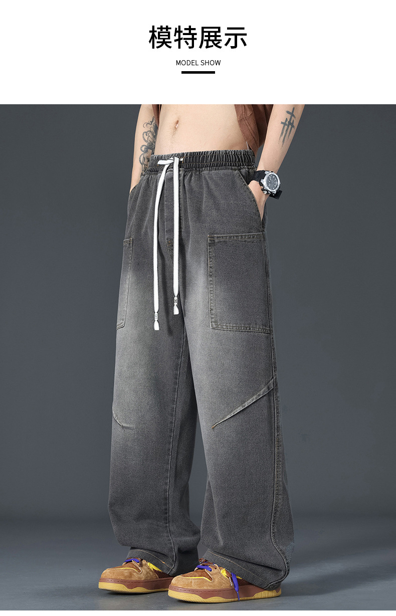 美式复古解构裤子男夏款抽绳松紧腰软牛仔裤多口袋水洗做旧微喇裤